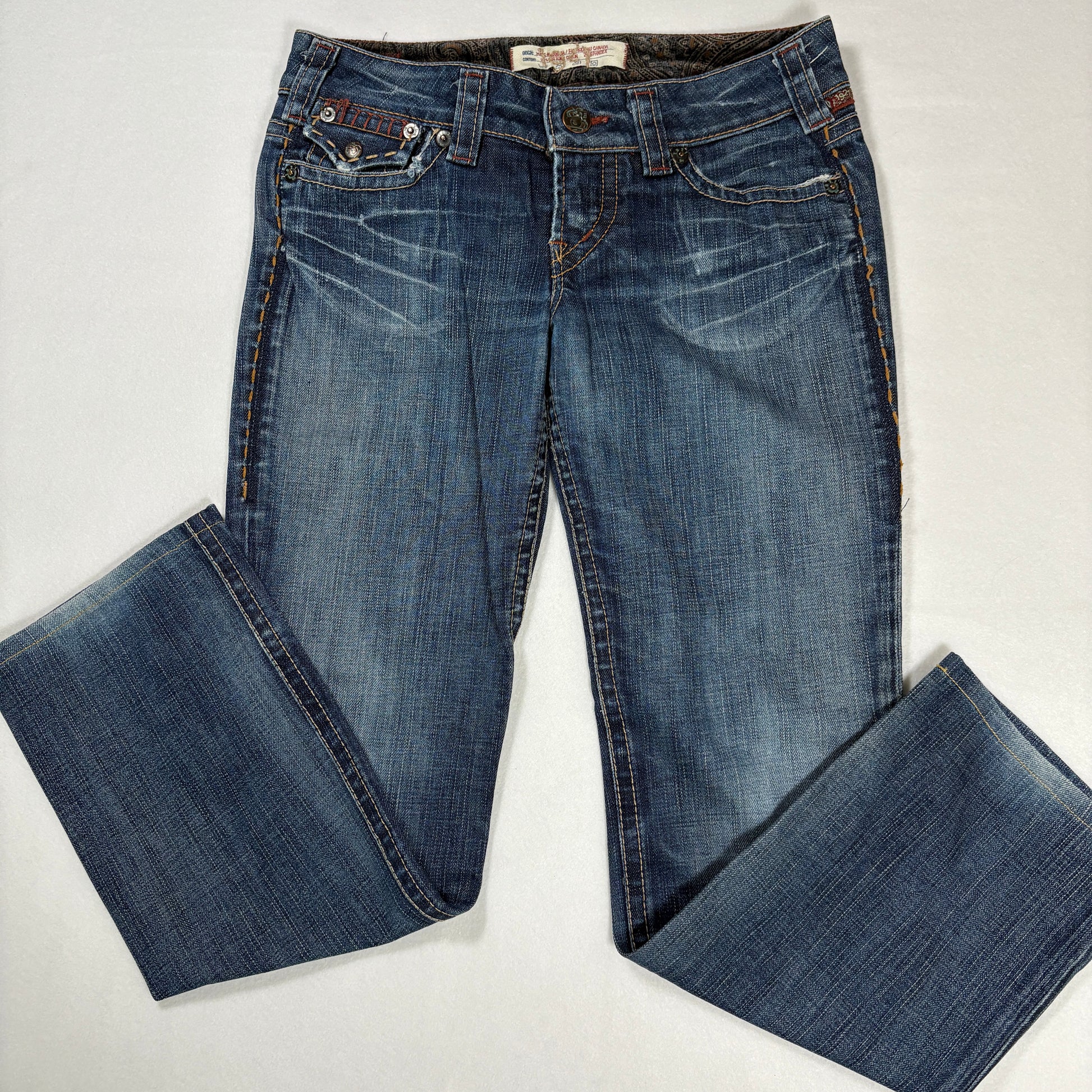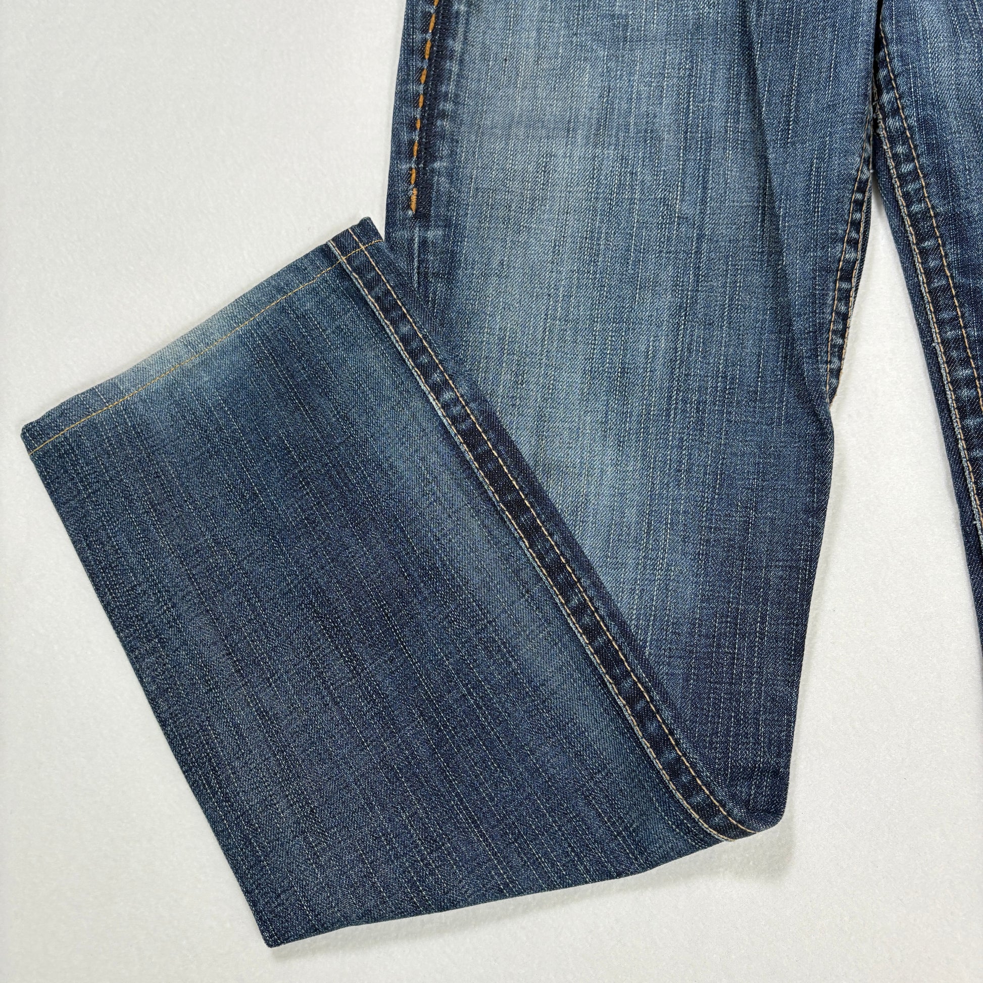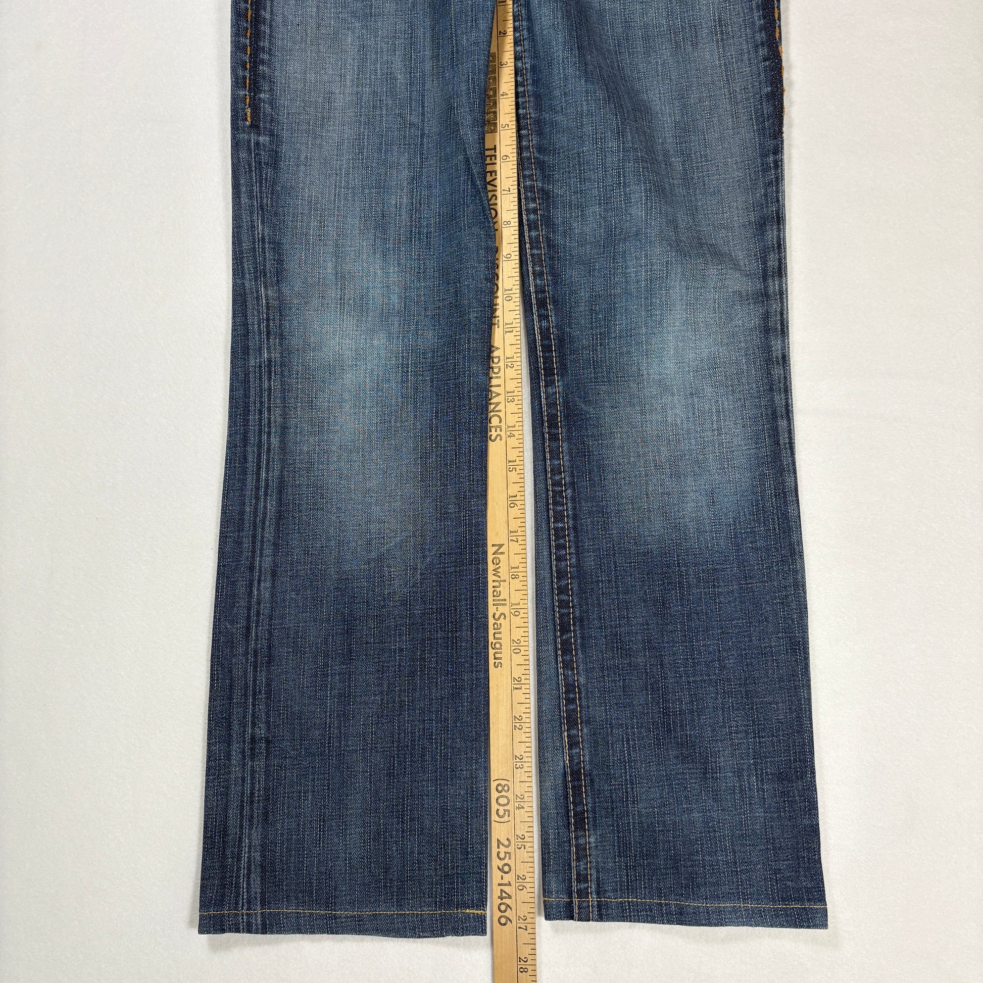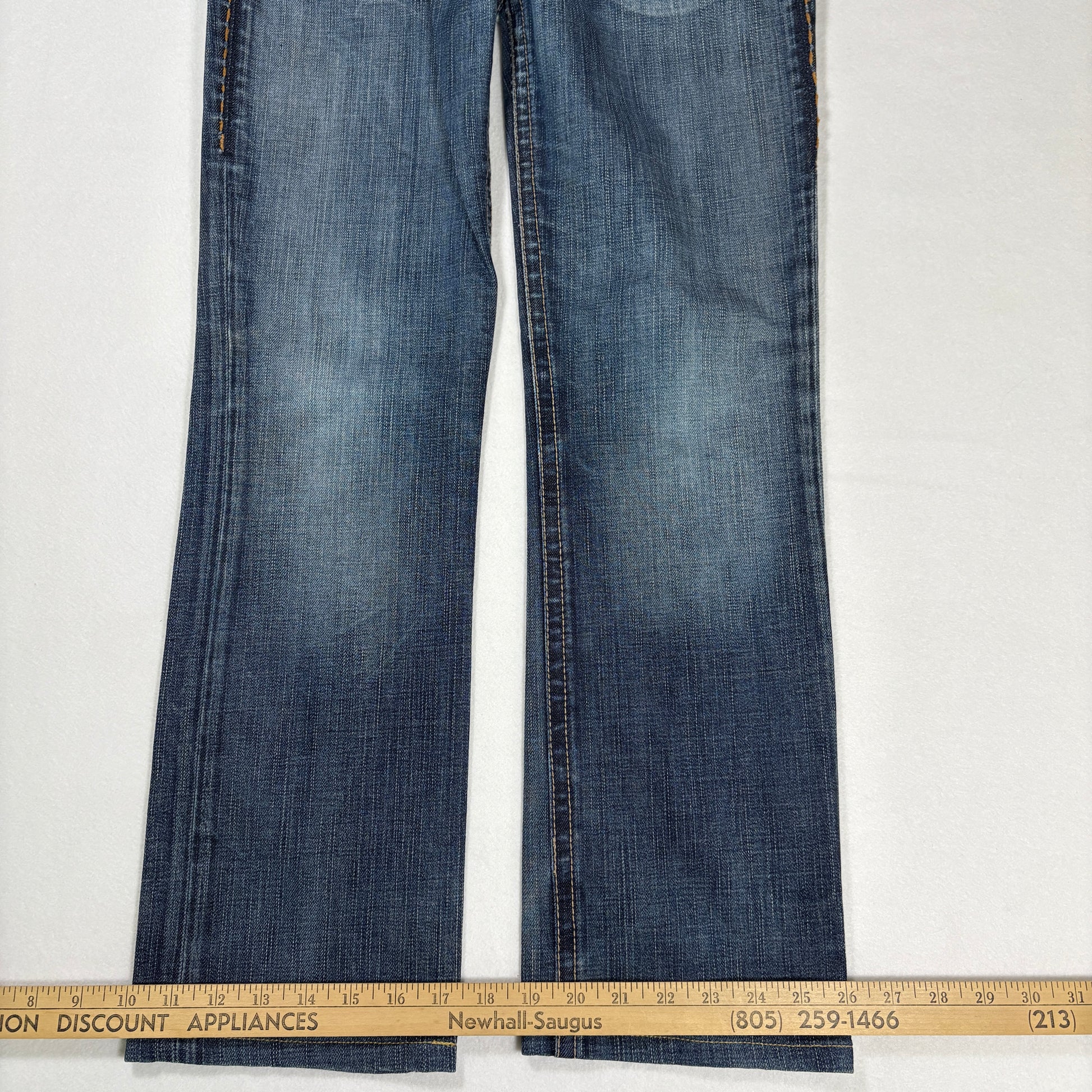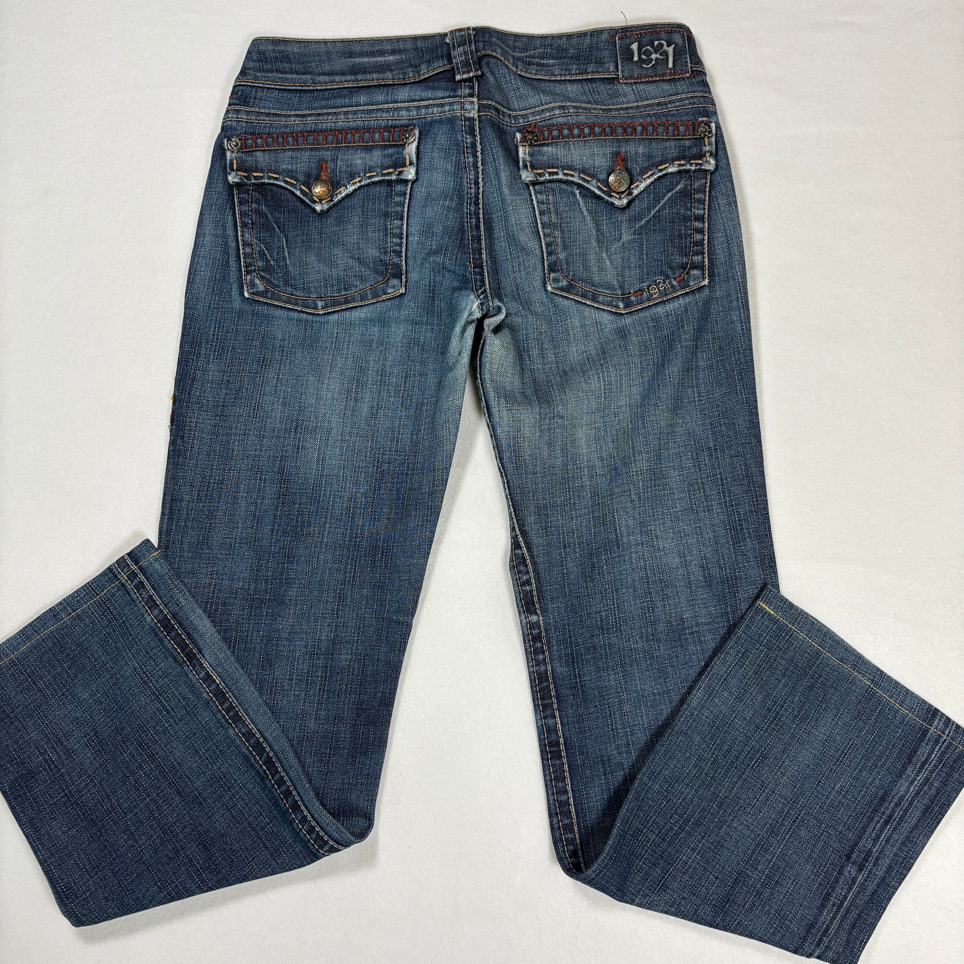 1921 jeans, women’s bootcut denim, 28x32 jeans, contrast stitch jeans, designer denim, flap pocket jeans, blue wash jeans
