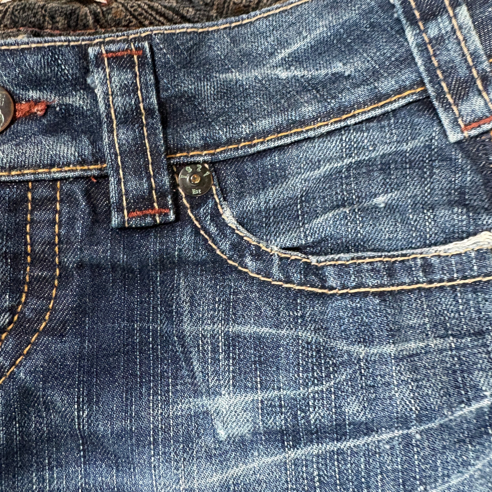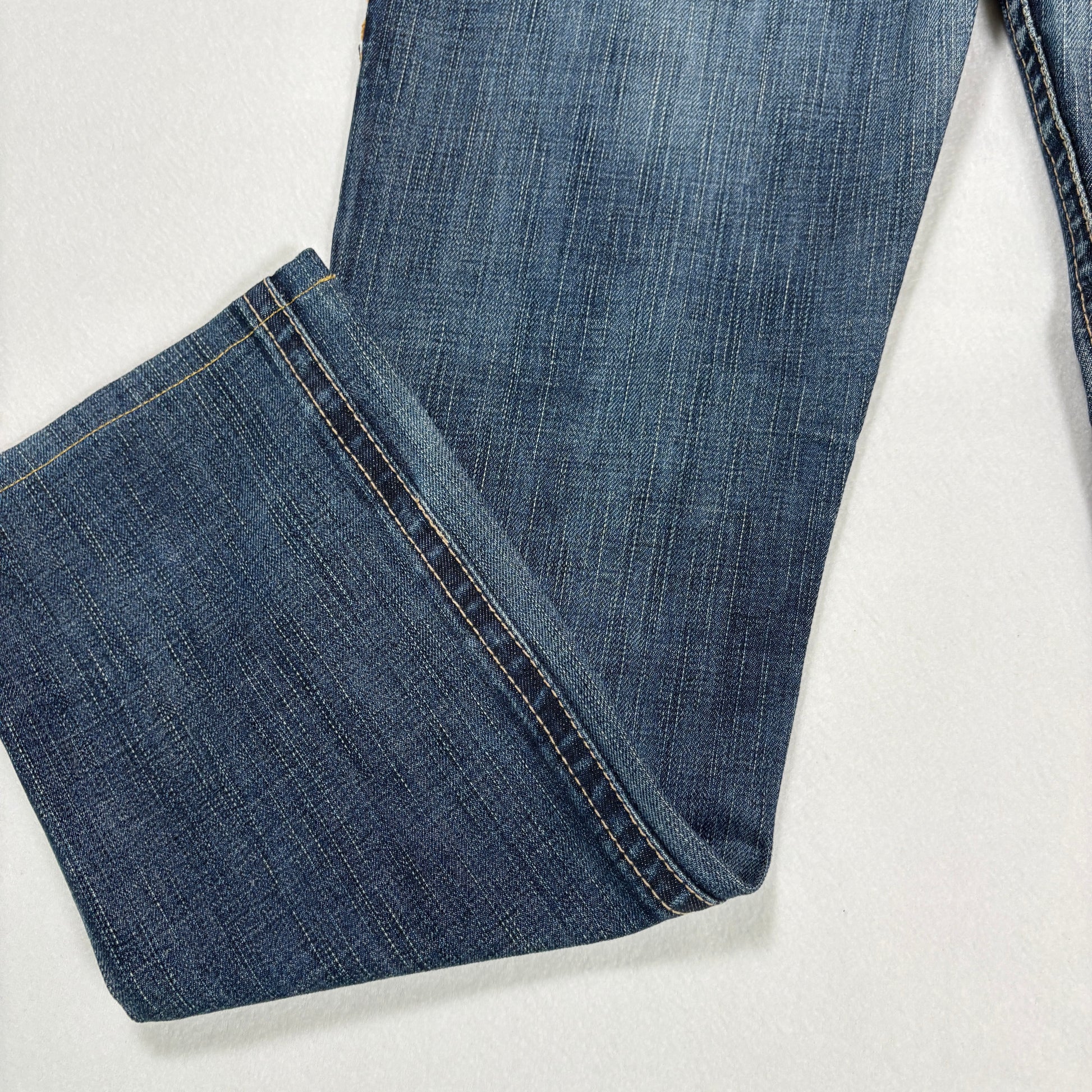 ✓ Blue denim wash with whiskering & fading