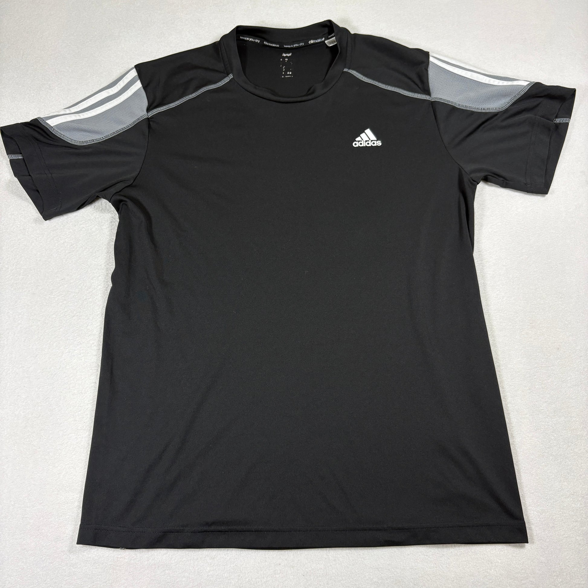 Adidas Climalite athletic t-shirt in black with gray shoulder panels and classic three-stripe design. Made with moisture-wicking fabric for training, gym workouts, or casual wear.