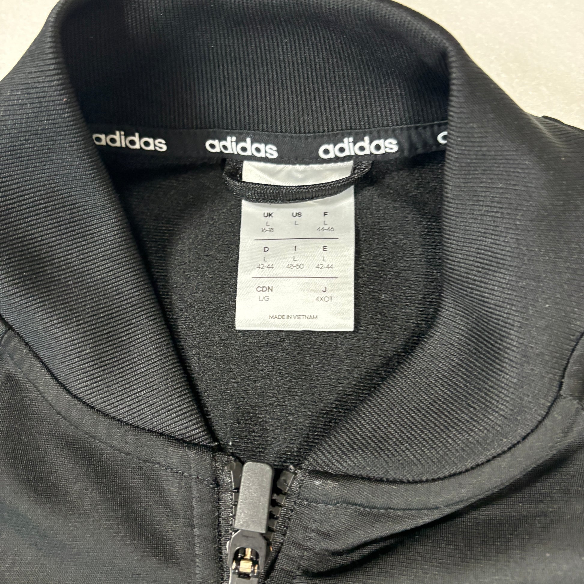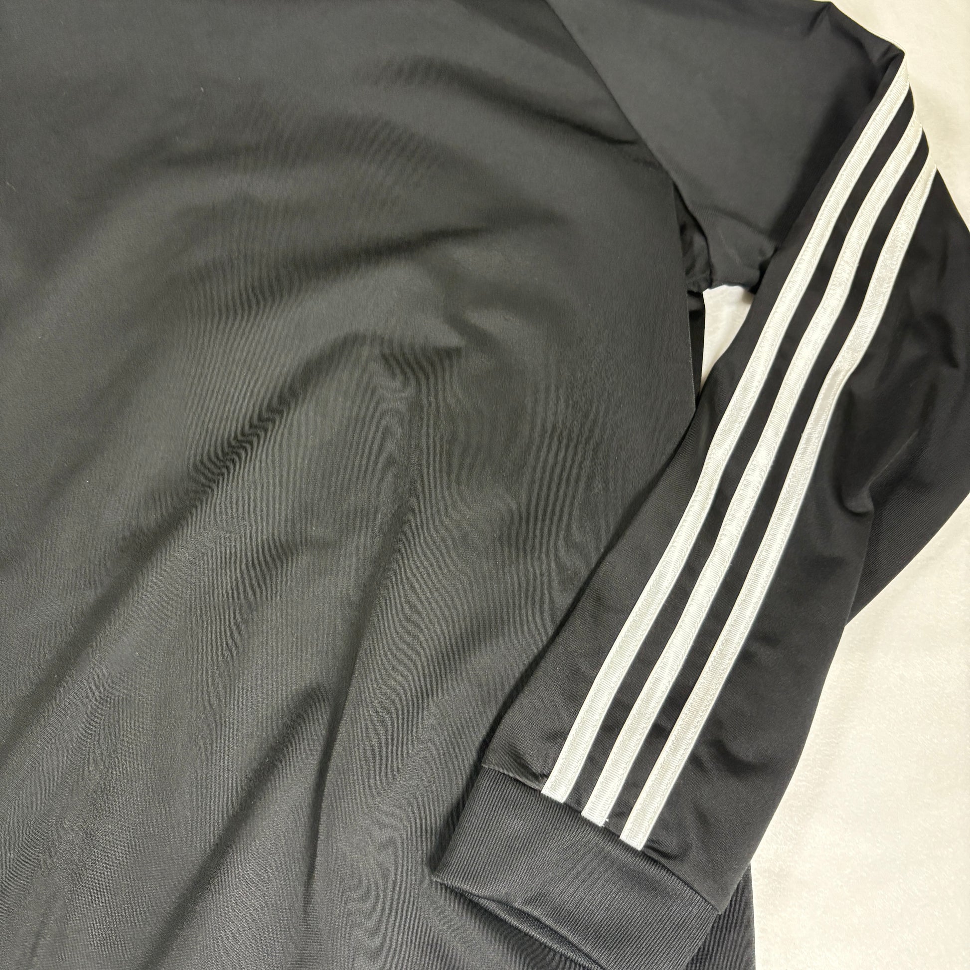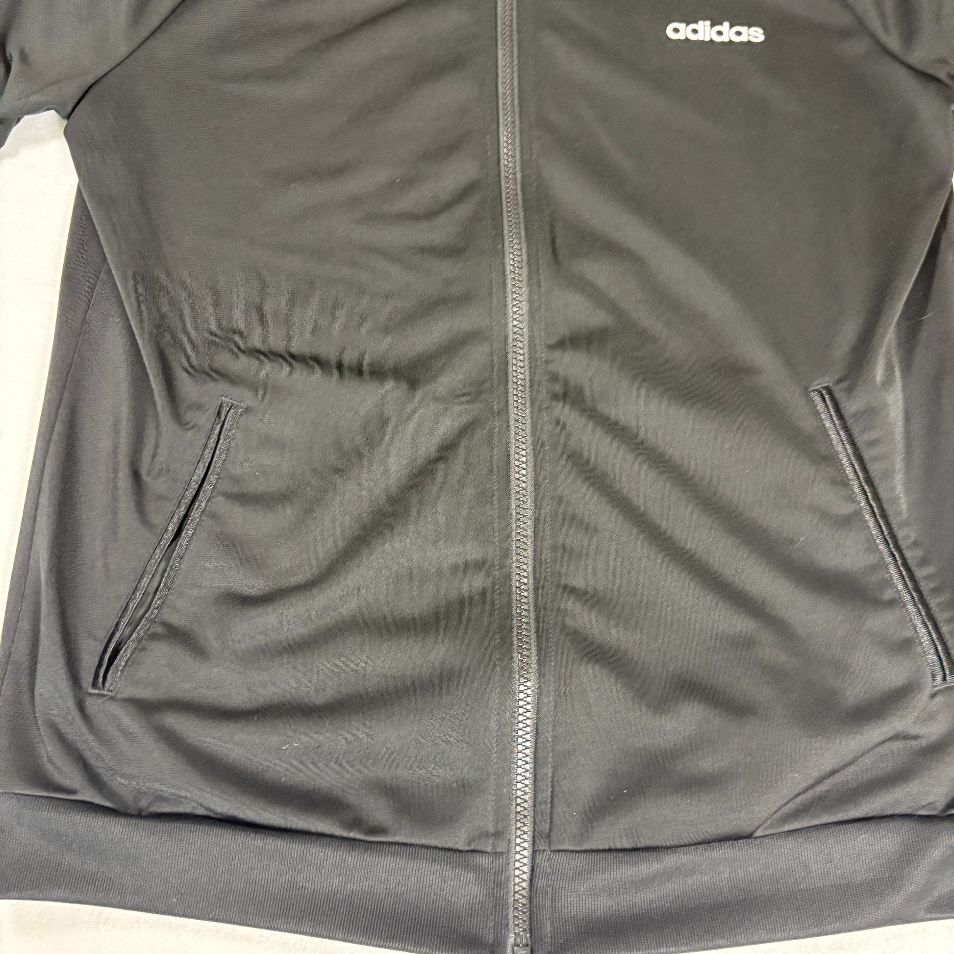 Classic Adidas men’s track jacket in black with iconic white 3-stripes along the sleeves. Features a full zip front, ribbed cuffs and hem, and two zippered side pockets. Embroidered Adidas logo on chest for authentic sporty style. Perfect for training, casual wear, or layering with your streetwear looks. Size Large (tagged, see pictures).