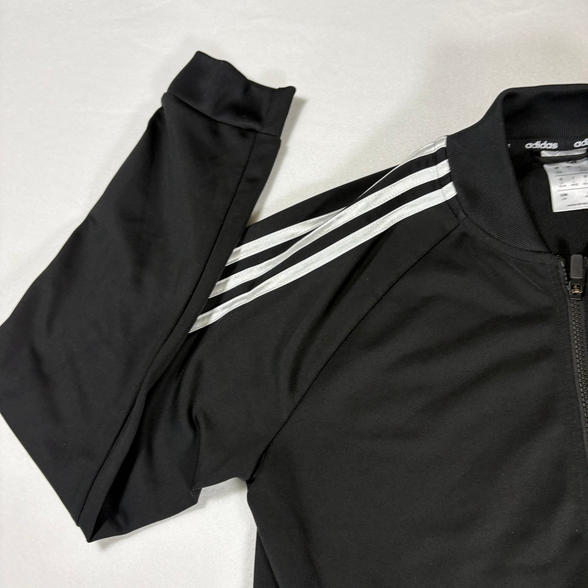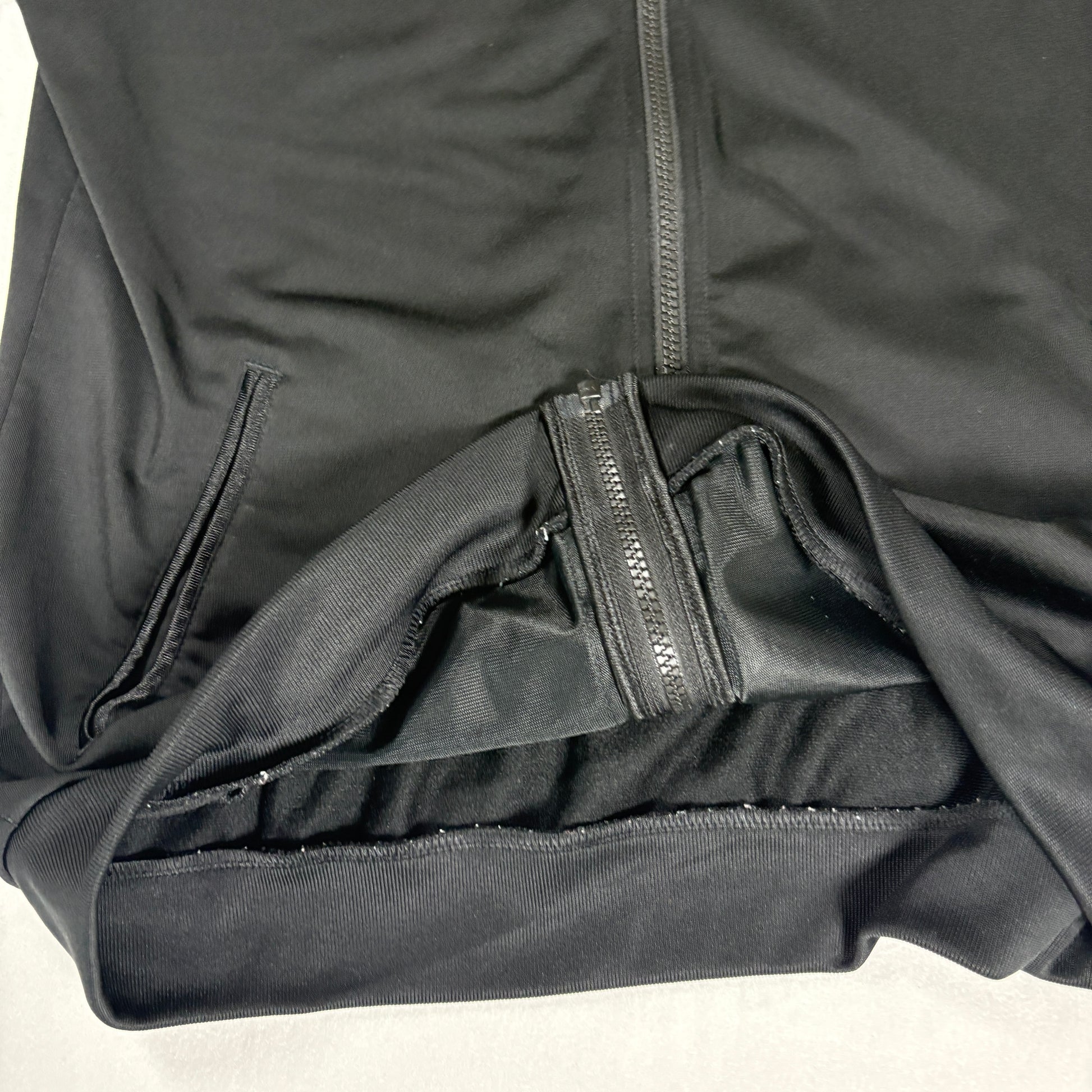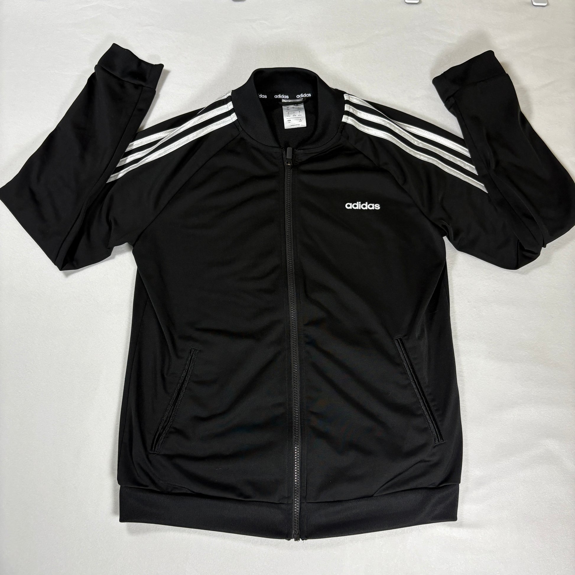 Classic Adidas men’s track jacket in black with iconic white 3-stripes along the sleeves. Features a full zip front, ribbed cuffs and hem, and two zippered side pockets. Embroidered Adidas logo on chest for authentic sporty style. Perfect for training, casual wear, or layering with your streetwear looks. Size Large (tagged, see pictures).