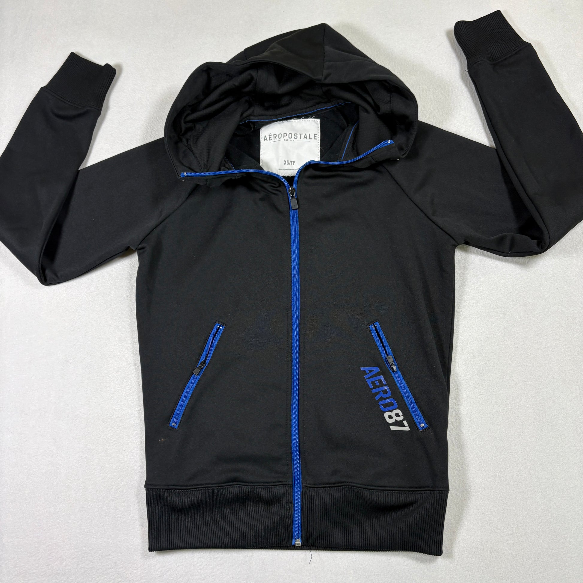 Aeropostale, Mens Hoodie, Black Zip Up, AERO 87, Y2K, Streetwear, Athletic, XS, Blue Trim