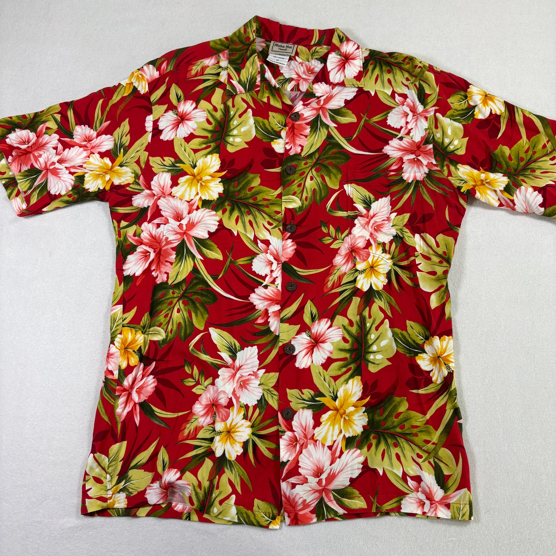 aloha hut, hawaiian shirt, rayon, vintage, y2k, tropical shirt, red floral, vacation, beachwear, mens medium, island style