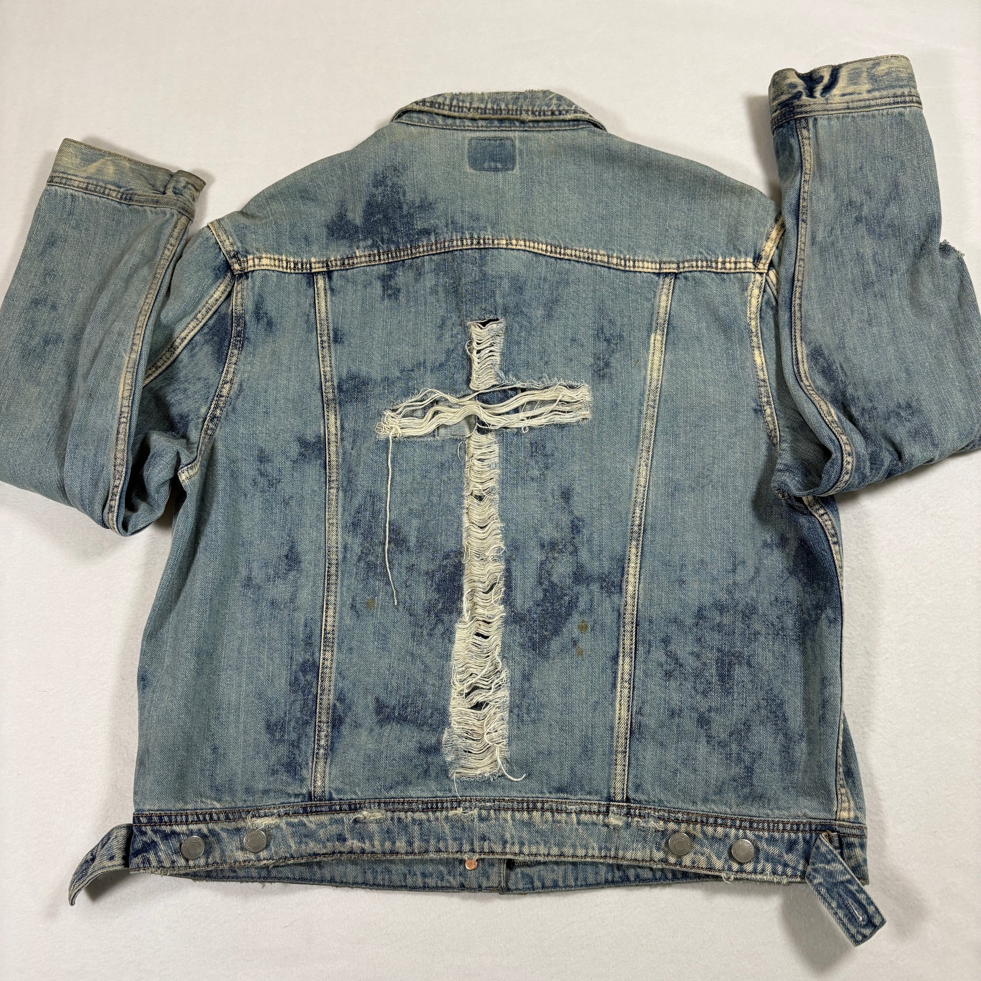 grunge denim jacket, 90s y2k jacket, american eagle mens denim, distressed cross jacket, vintage streetwear