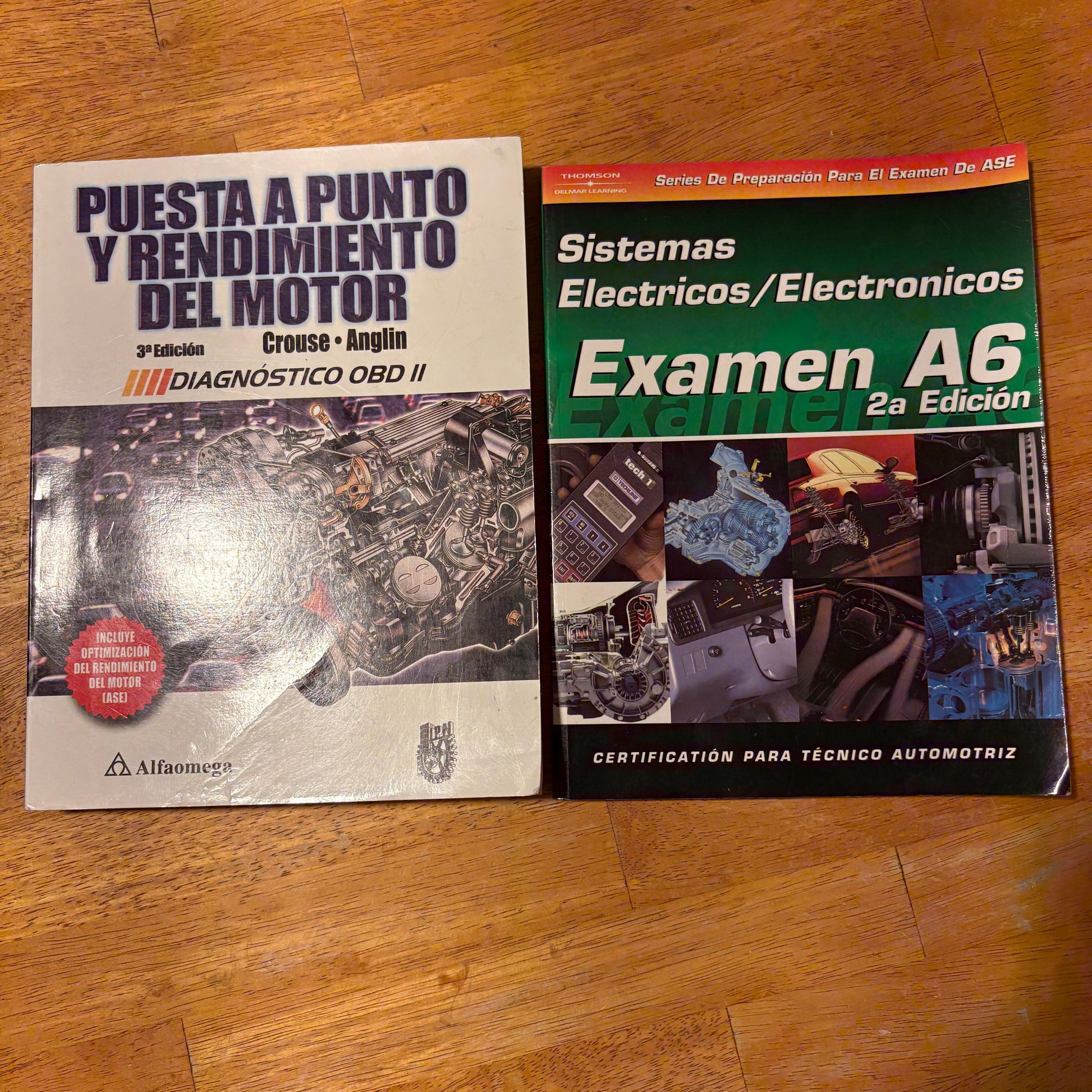 Lot of 2 Spanish-language automotive textbooks for ASE exam preparation and engine performance training.