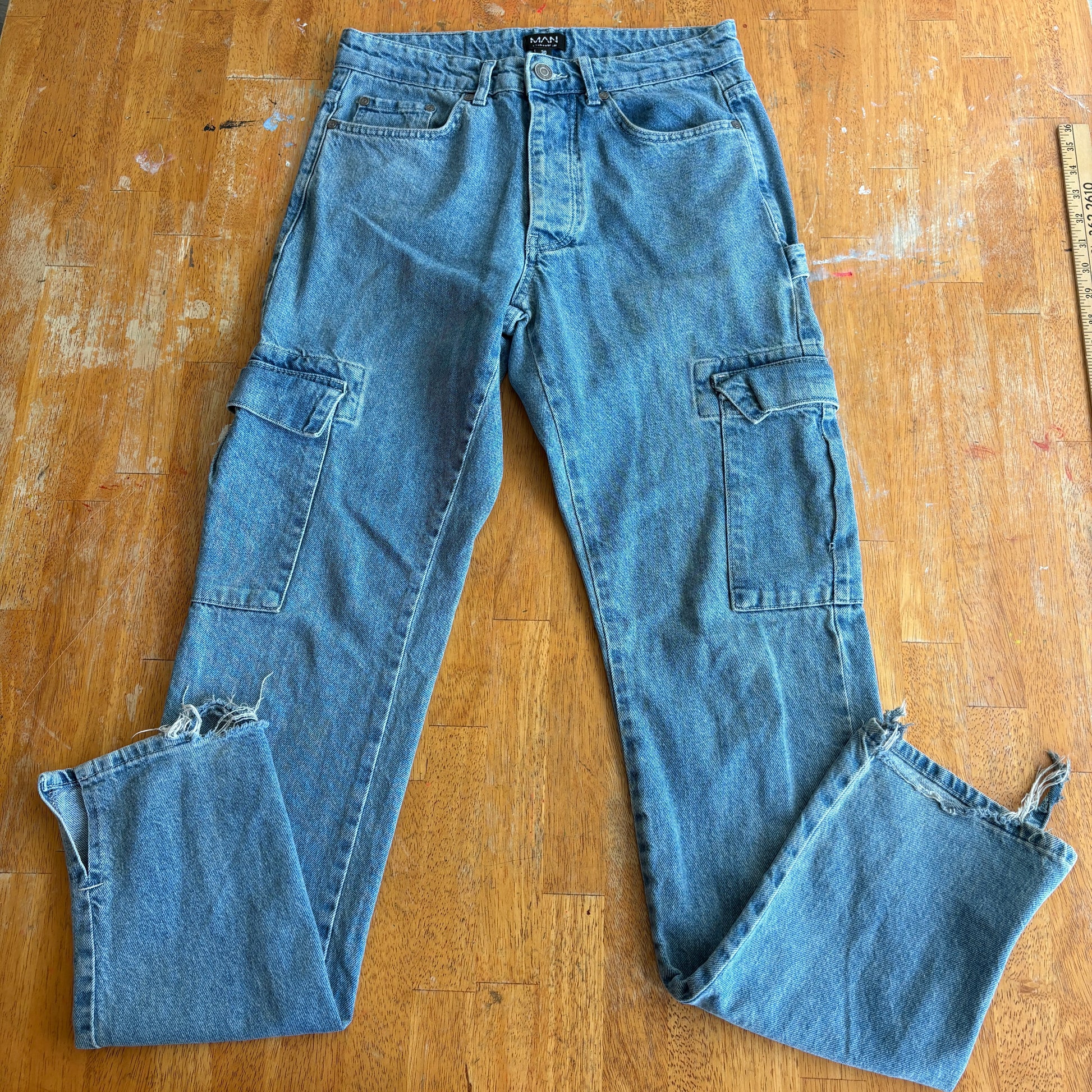BoohooMAN Cargo Jeans Mens 30 Blue Y2K Utility Distressed Denim Streetwear Wide!