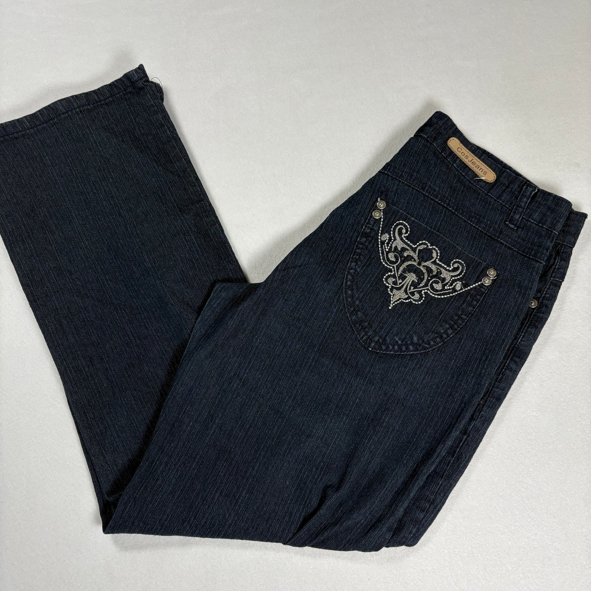 cosjeans womens jeans, embellished jeans, petite bootcut denim, y2k jeans womens, grunge vintage style, size 8p jeans, stretch denim, dark wash jeans