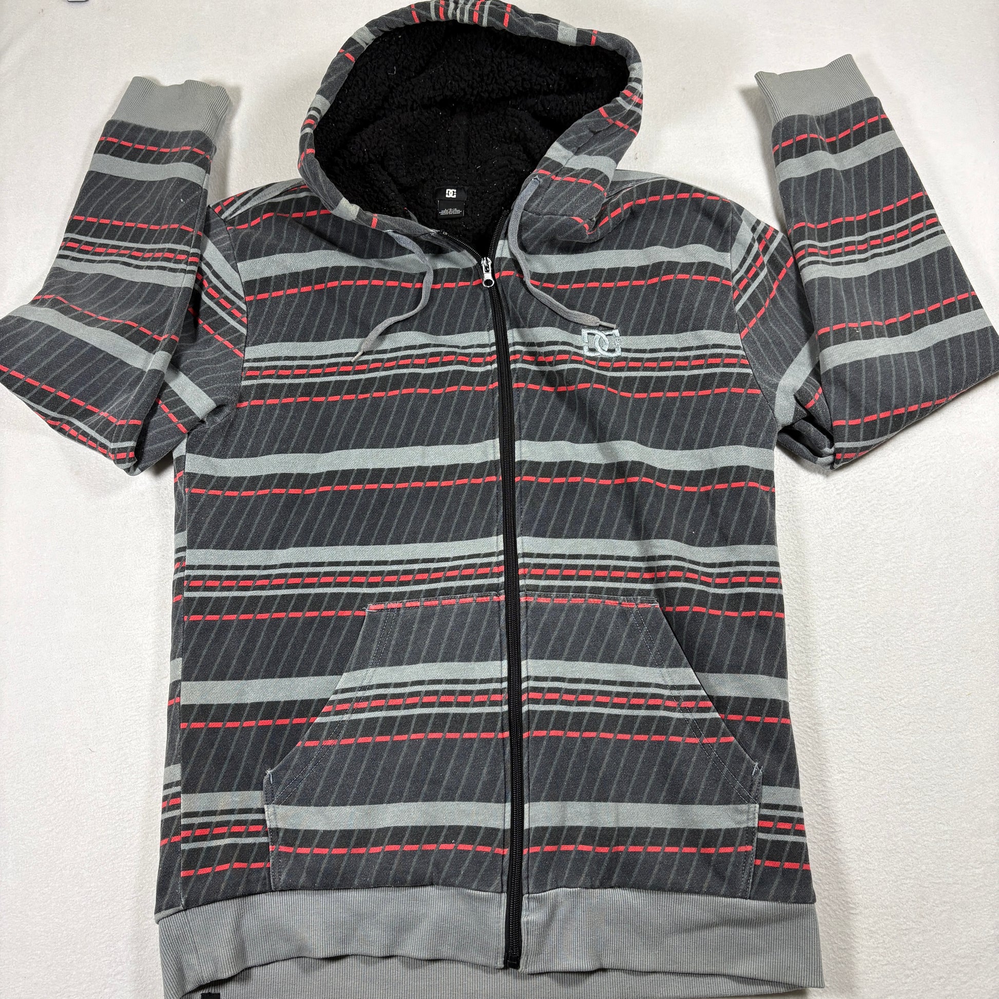 streetwear hoodie, dc shoes hoodie, sherpa zip hoodie, skate jacket, vintage dc, gray red striped hoodie
