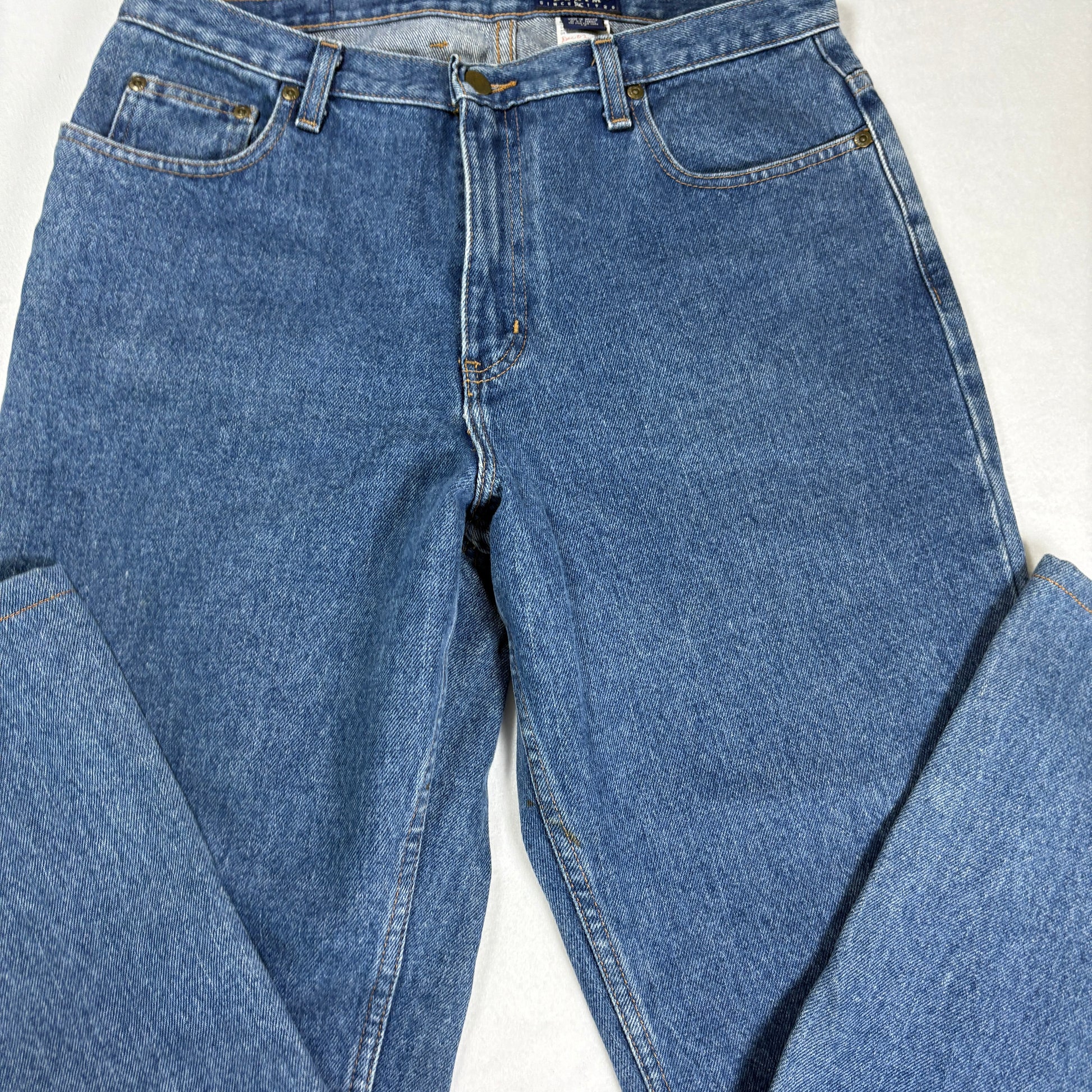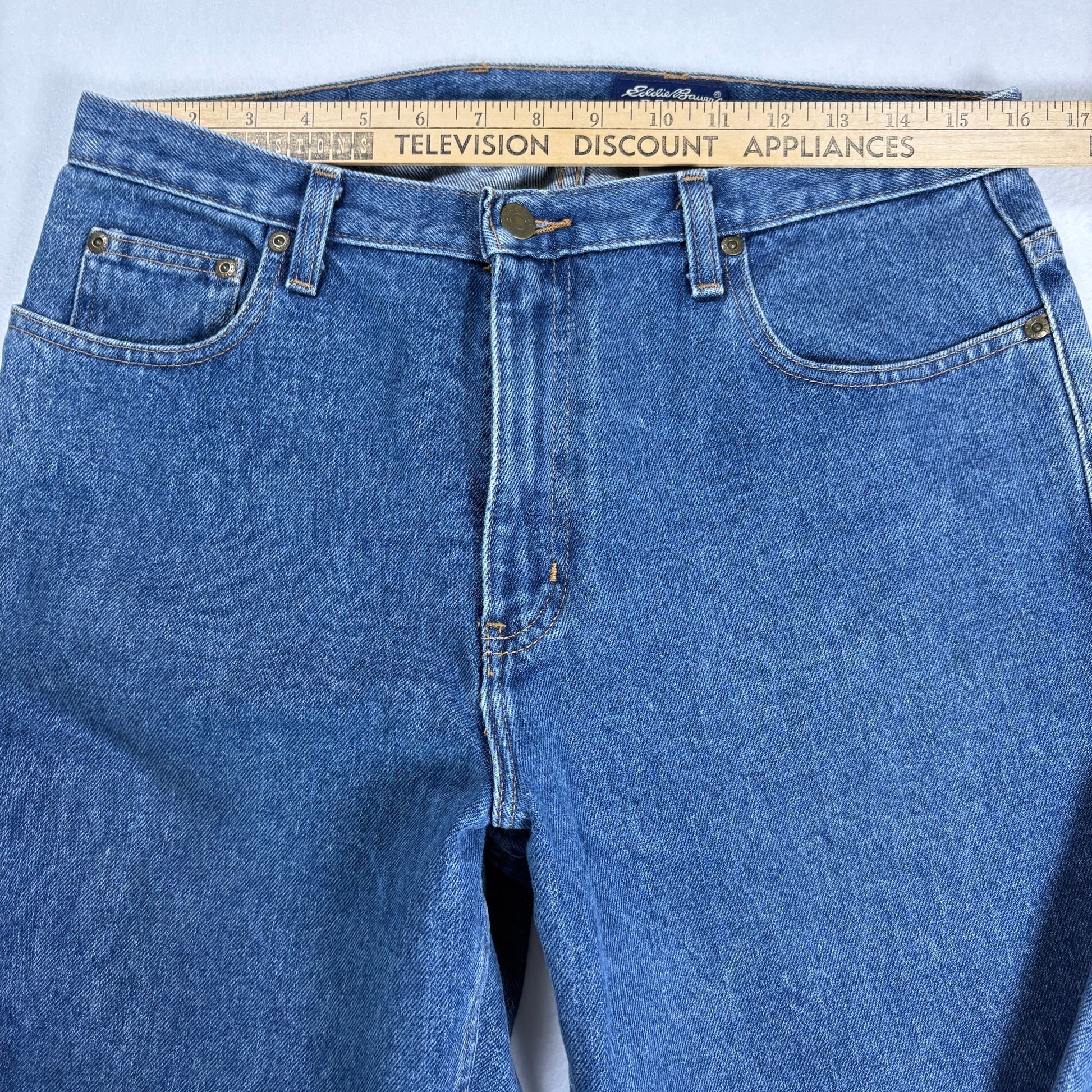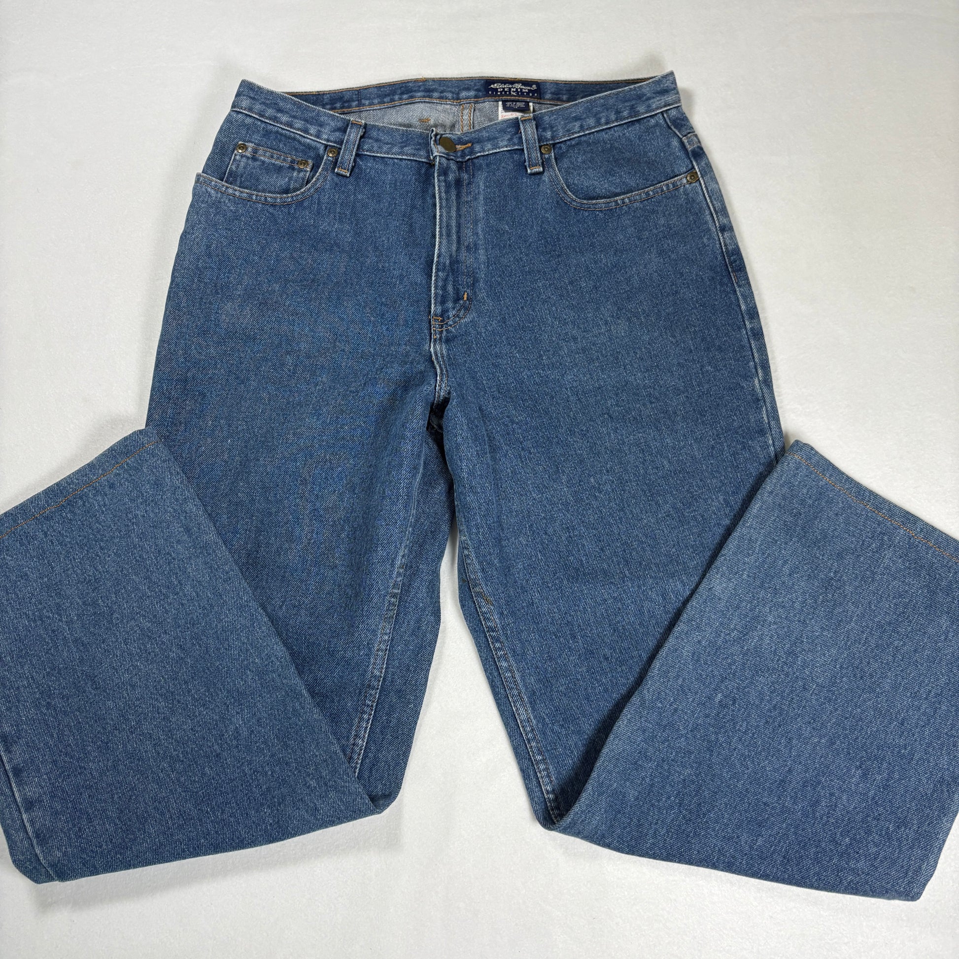 Vintage Eddie Bauer jeans from Dec 2002 in a true 90s/Y2K baggy straight cut. 100% cotton rigid denim with a flattering high rise and timeless medium blue wash. Perfect retro mom-jean silhouette that pairs effortlessly with grunge, vintage, or modern streetwear outfits.