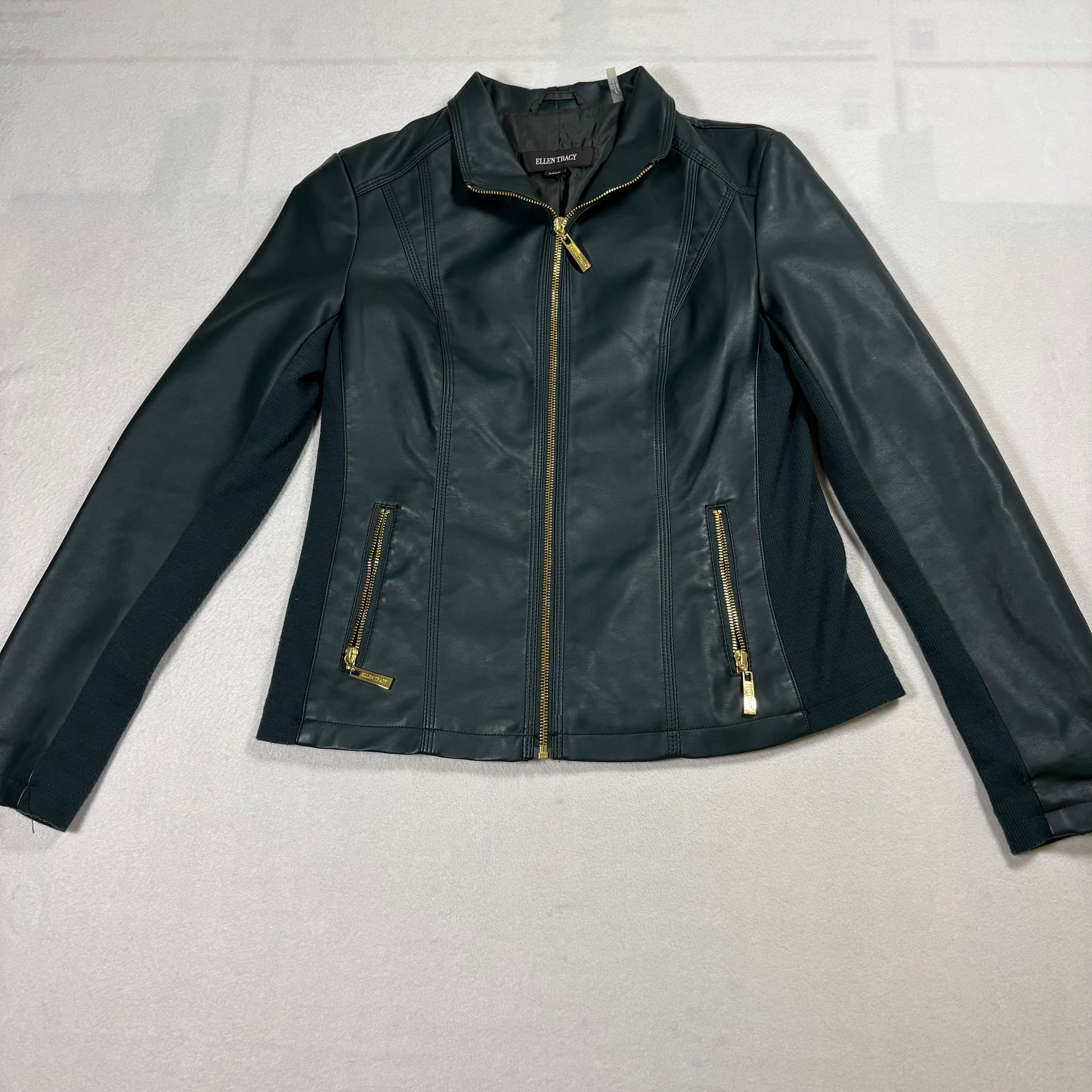 Ellen Tracy Faux Leather Jacket Womens Small Black Gold Zip Moto Style Vegan Coat