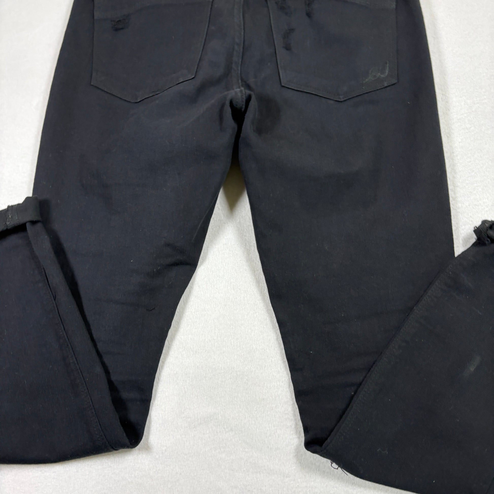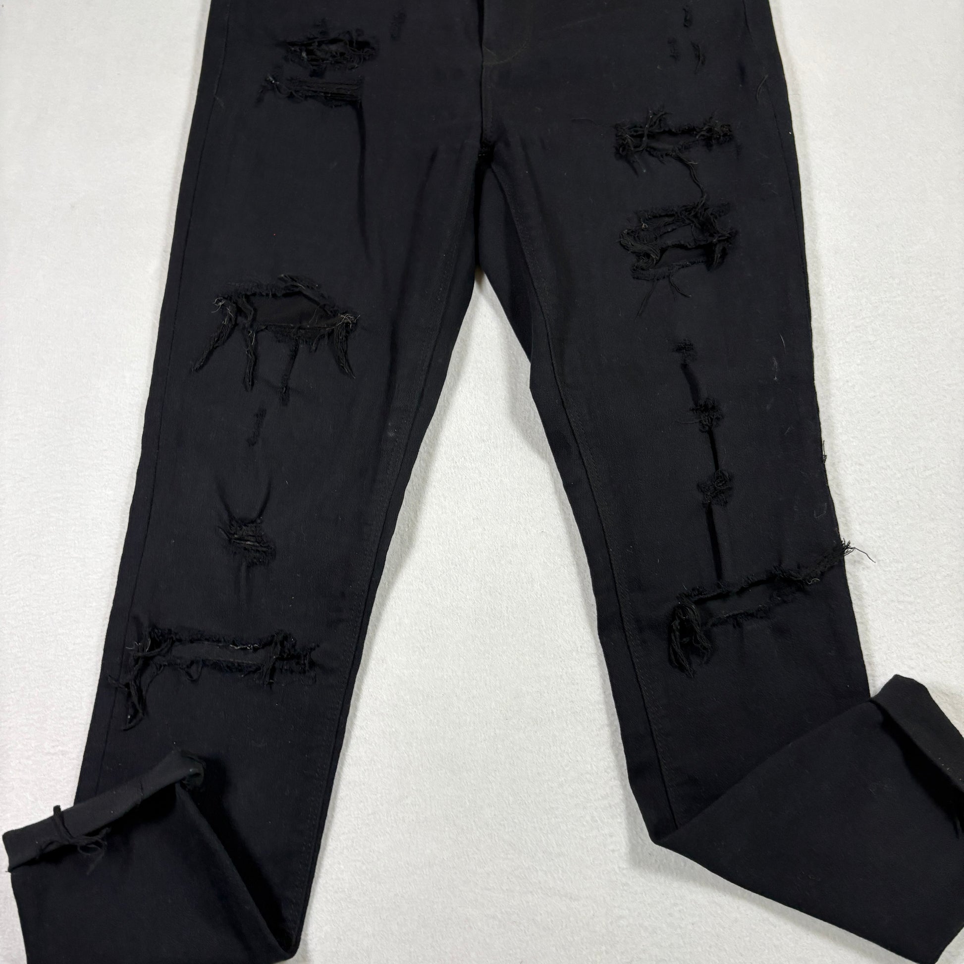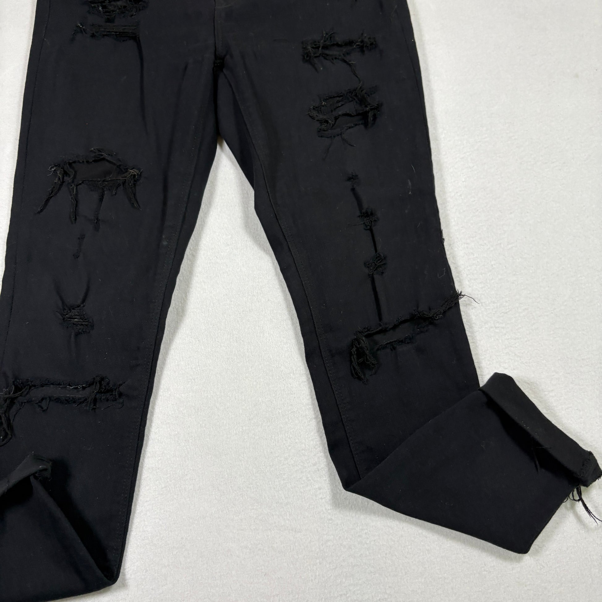 ✓ Details: Heavy distressing, ripped knees and thighs, edgy raw frays