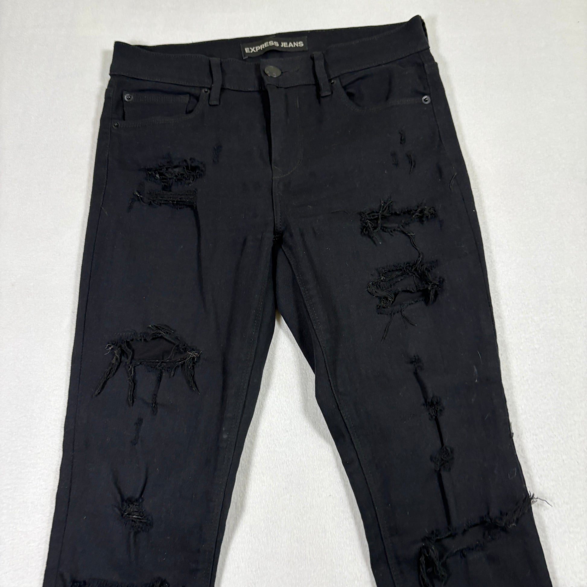 express jeans, womens size 4 jeans, distressed black denim, ripped skinny jeans, mid rise legging, grunge y2k jeans, edgy streetwear, ripped stretch denim