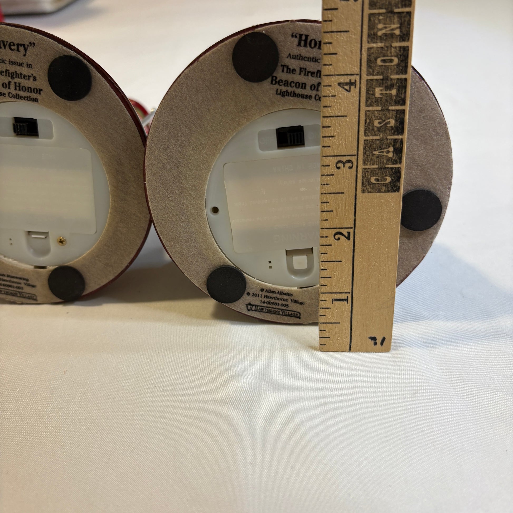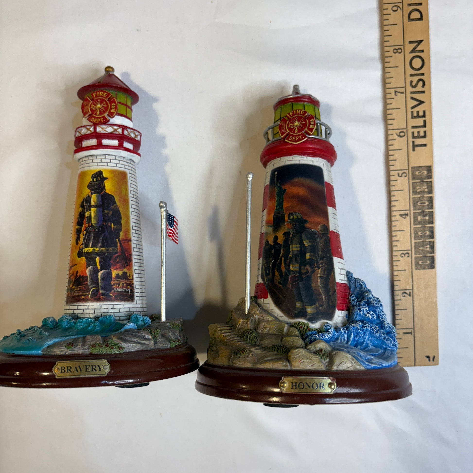 Set of two firefighter-themed lighthouse figurines, “Bravery” and “Honor,” from The Firefighter’s Beacon of Honor Lighthouse Collection. Each lighthouse features a detailed red and white tower with a firefighter emblem and inspirational scene — one depicting a heroic firefighter against a blazing sky, and the other showing a solemn tribute scene with the Statue of Liberty in the background. Both have bases with wave and rock detailing, American flag poles, and a light-up function (battery compartments on the underside). Each stands approximately 10 inches tall. Excellent collectibles for firefighter memorabilia enthusiasts or lighthouse collectors.