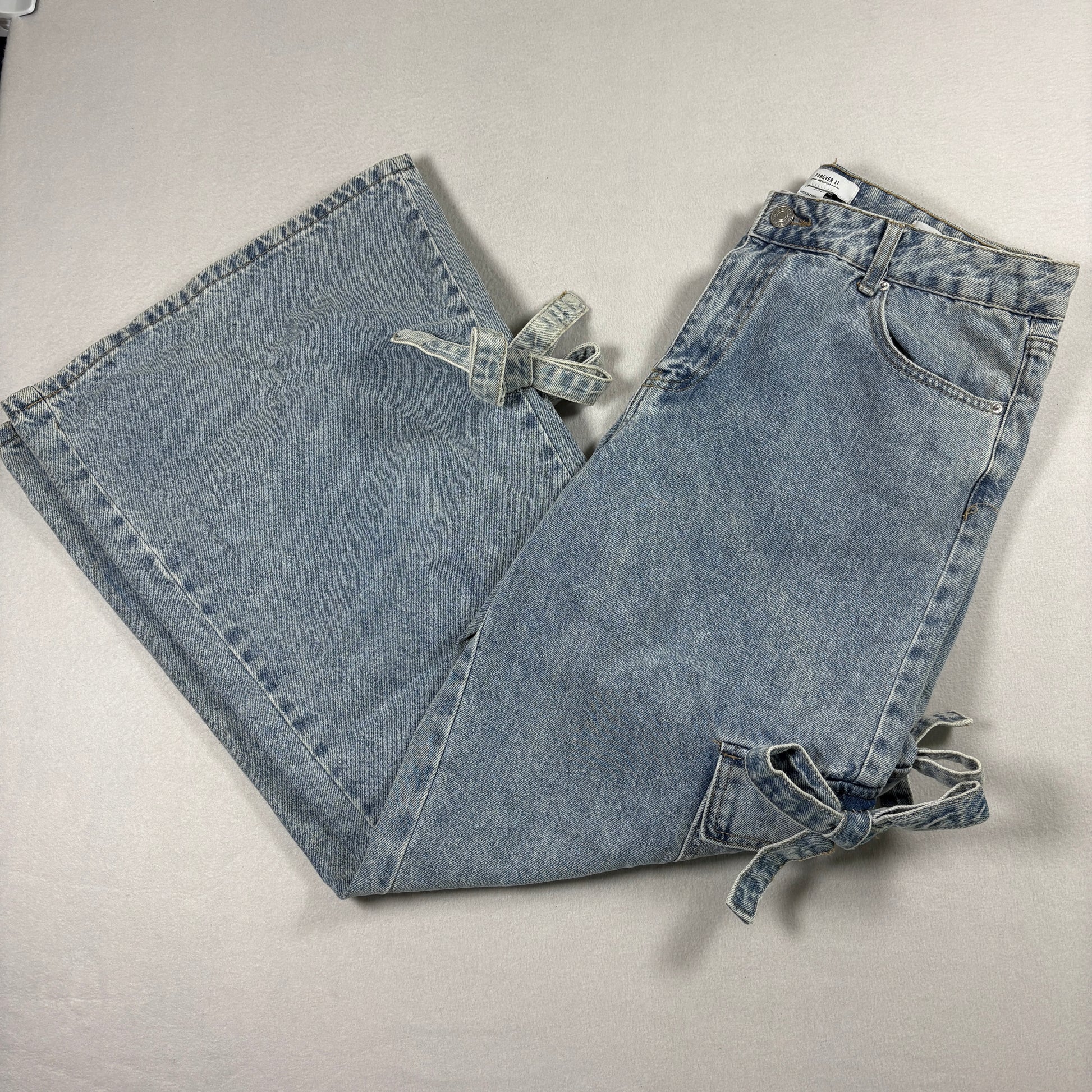 True Y2K aesthetic with these Forever 21 Premium women’s jeans in size 29. Light wash denim with bow-tie accents on the legs and wide flare fit, perfect for grunge, streetwear, or festival styling. Jeans show staining, but still carry strong vintage-inspired appeal. Please see all pictures for condition. We strive to ship same or next business day depending on order time. Free 30 day returns. We combine shipping, so check our store for more jeans and Y2K fashion.