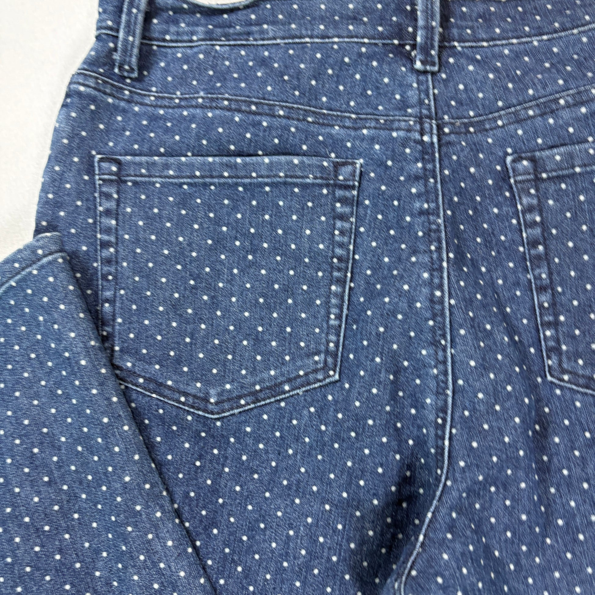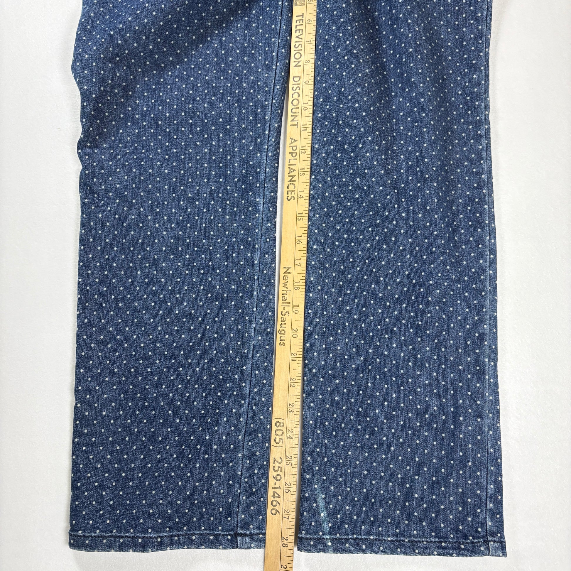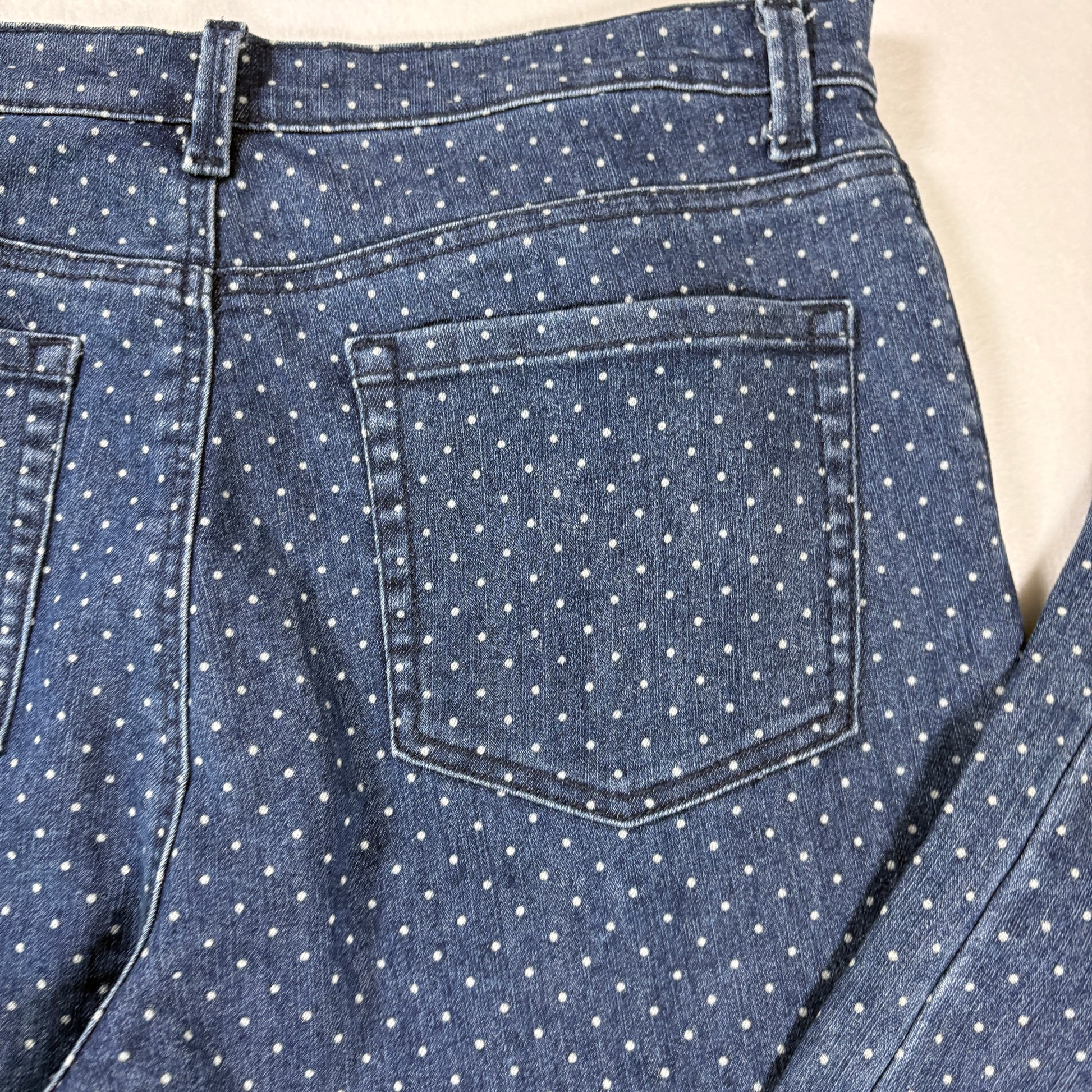 Fun and classic Gloria Vanderbilt Amanda jeans in a playful blue polka dot print. These jeans are a women’s 14P Petite fit, offering a flattering mid rise and straight leg cut. The Amanda line is Gloria Vanderbilt’s most popular style, known for comfort, timeless design, and easy wear.