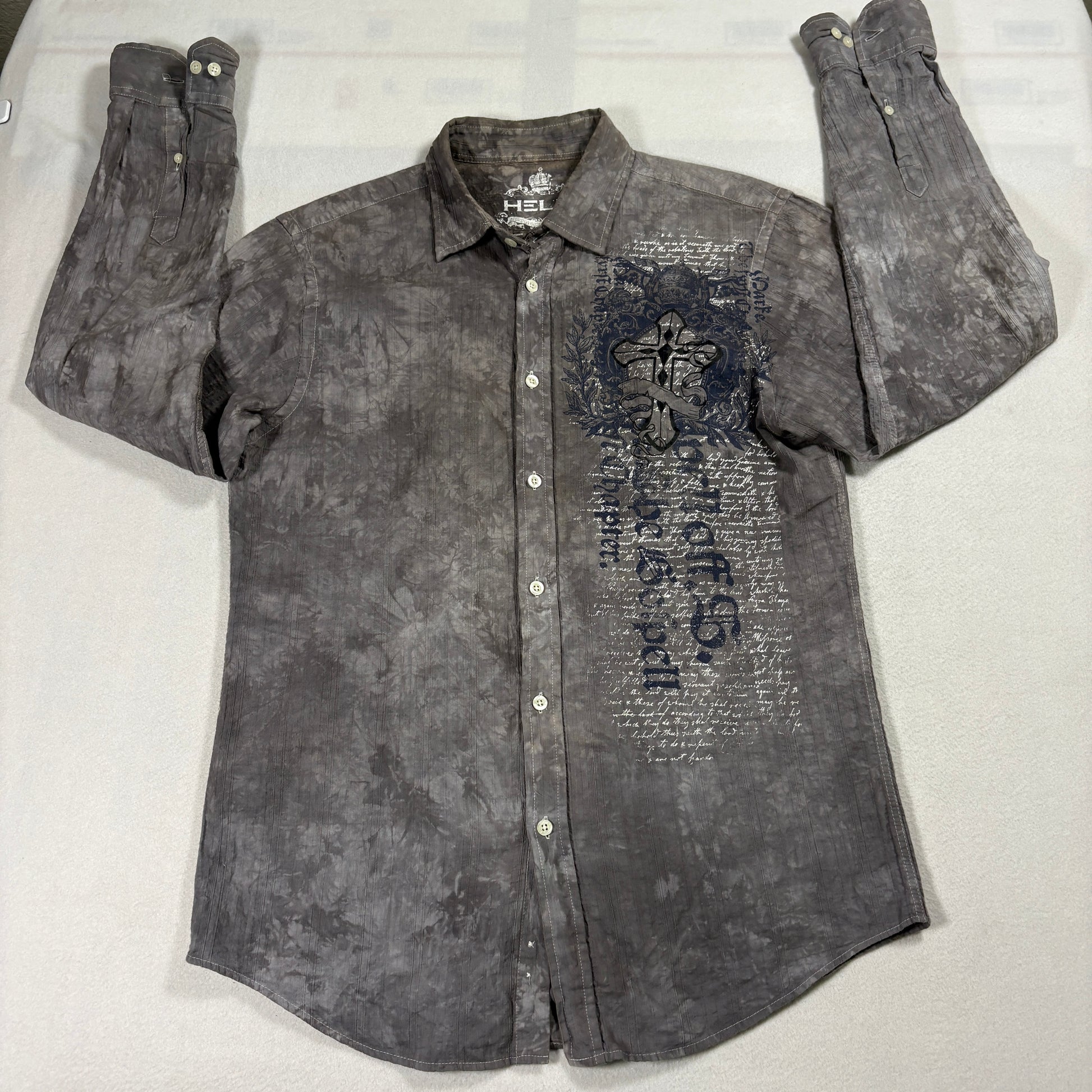 Helix Button Up Shirt Mens Medium Gray Distressed Cross Graphic Y2K Grunge Top