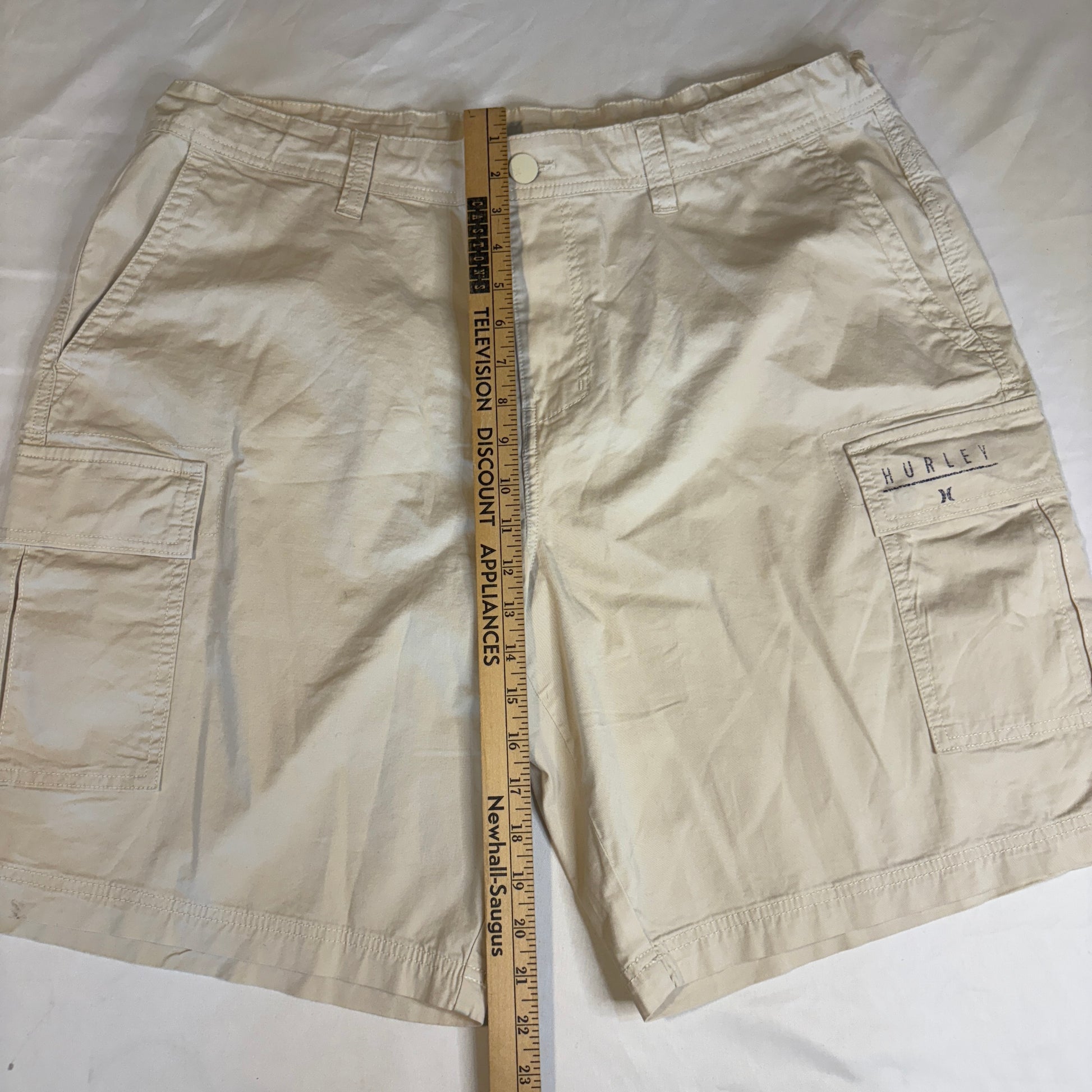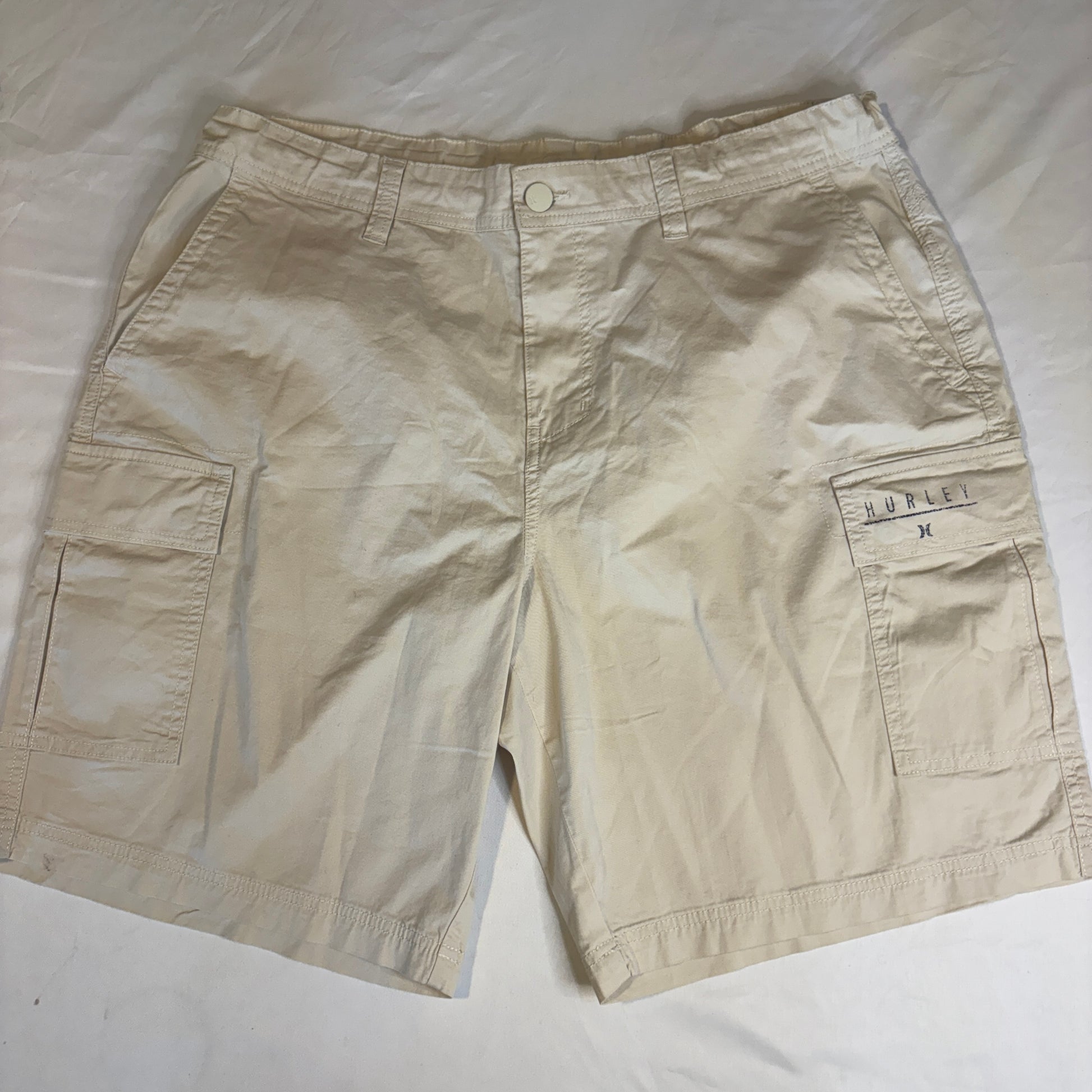 Hurley cargo shorts, beige khaki cotton shorts, men’s 38 casual summer shorts, utility pocket shorts, skate surf outdoor wear