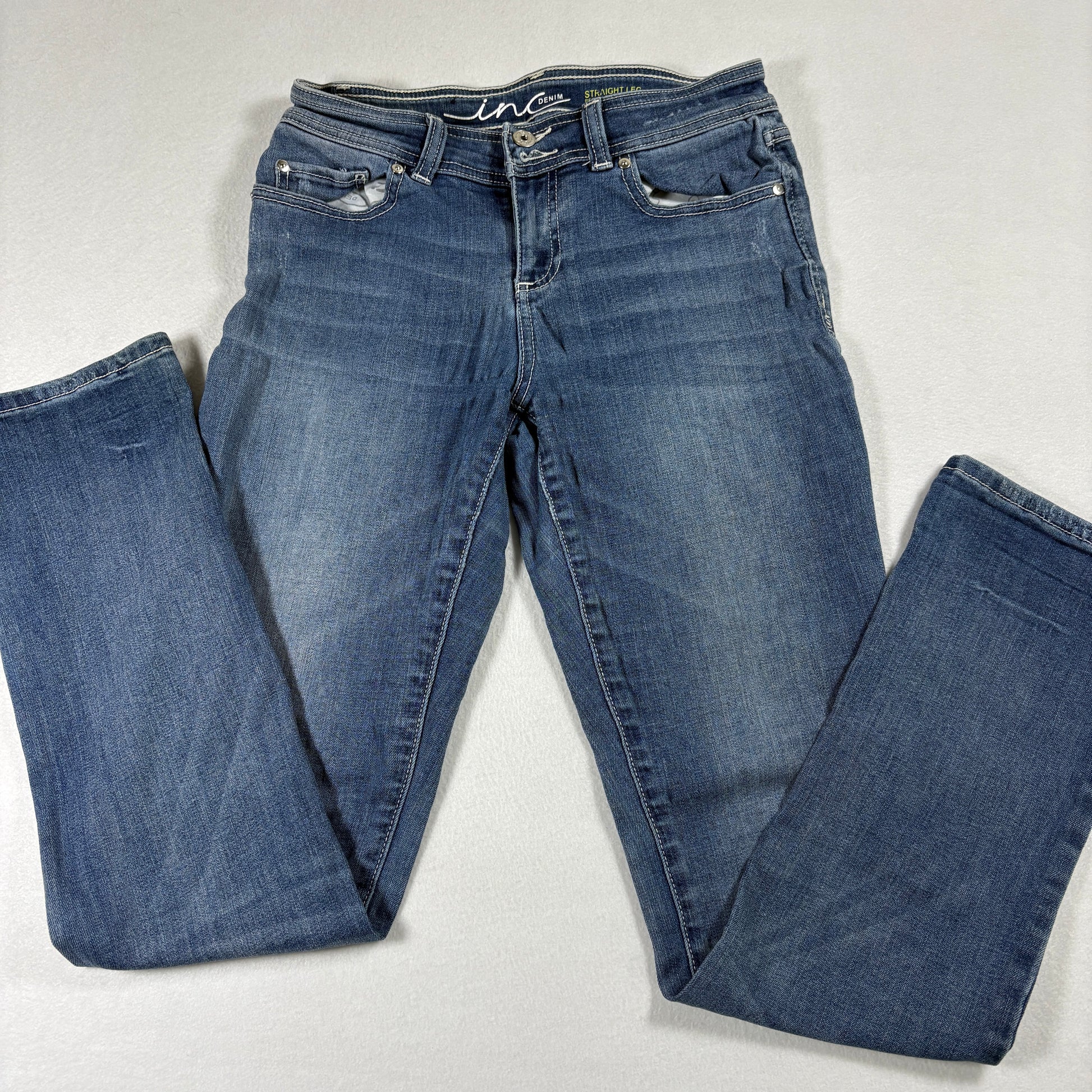 INC Denim straight leg jeans in a classic blue wash with subtle fading for timeless style. Comfortable stretch blend with mid rise fit makes these versatile for everyday wear. A perfect pair of Y2K-inspired vintage basics that work equally well dressed up or casual.