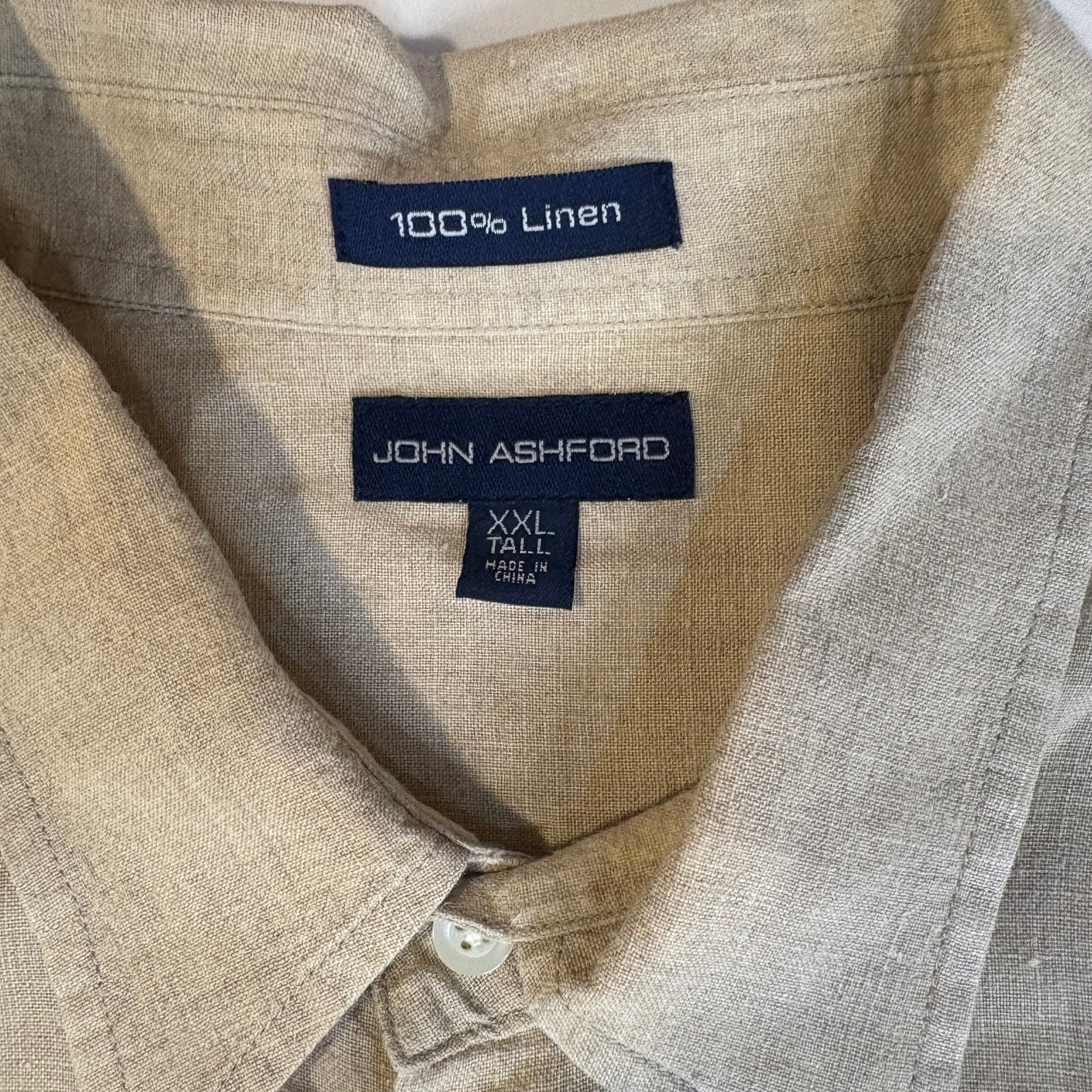 John Ashford men’s short sleeve button-front shirt in XXL Tall. Made from 100% linen for a lightweight, breathable feel—perfect for summer wear. Classic beige color with a chest pocket and collared neckline.
