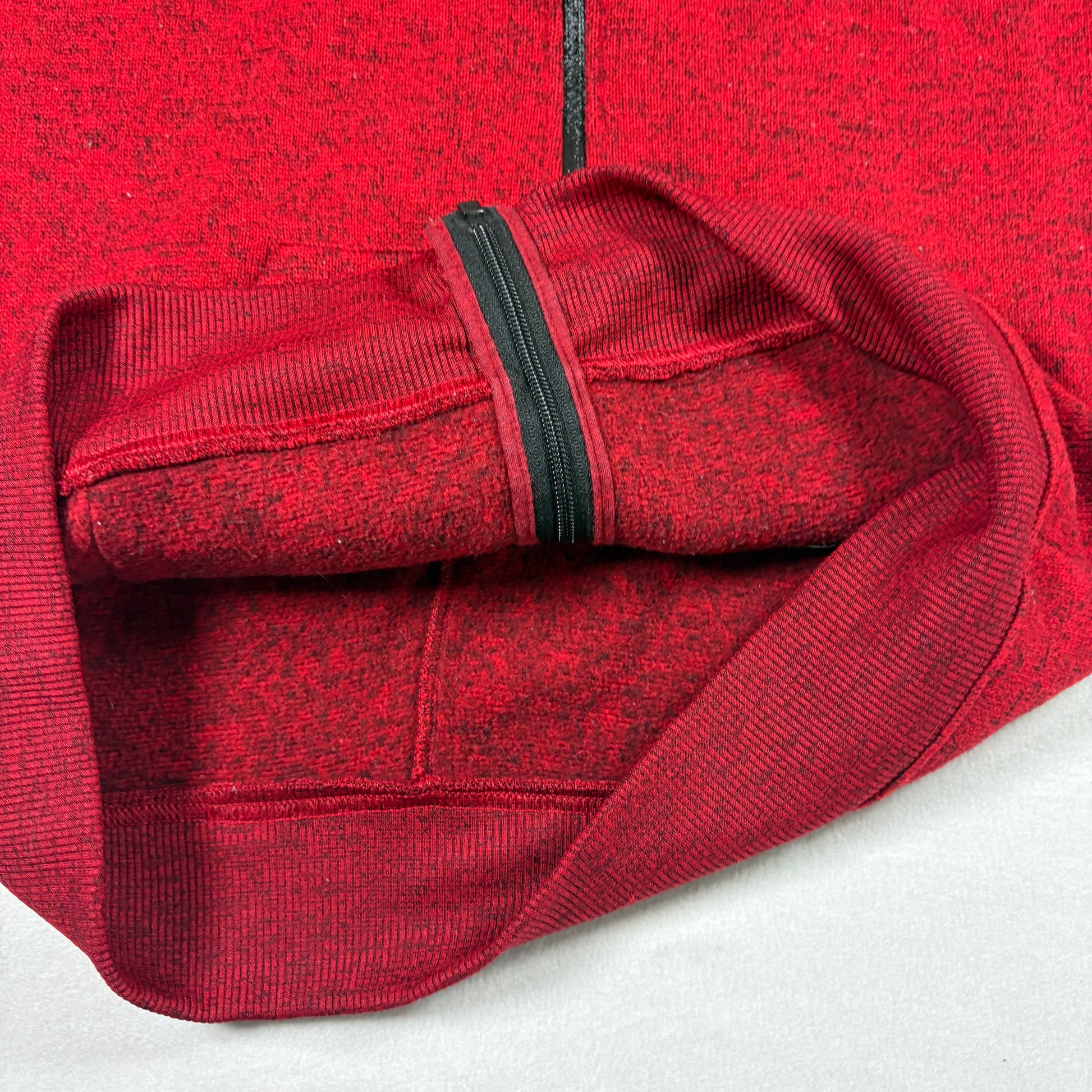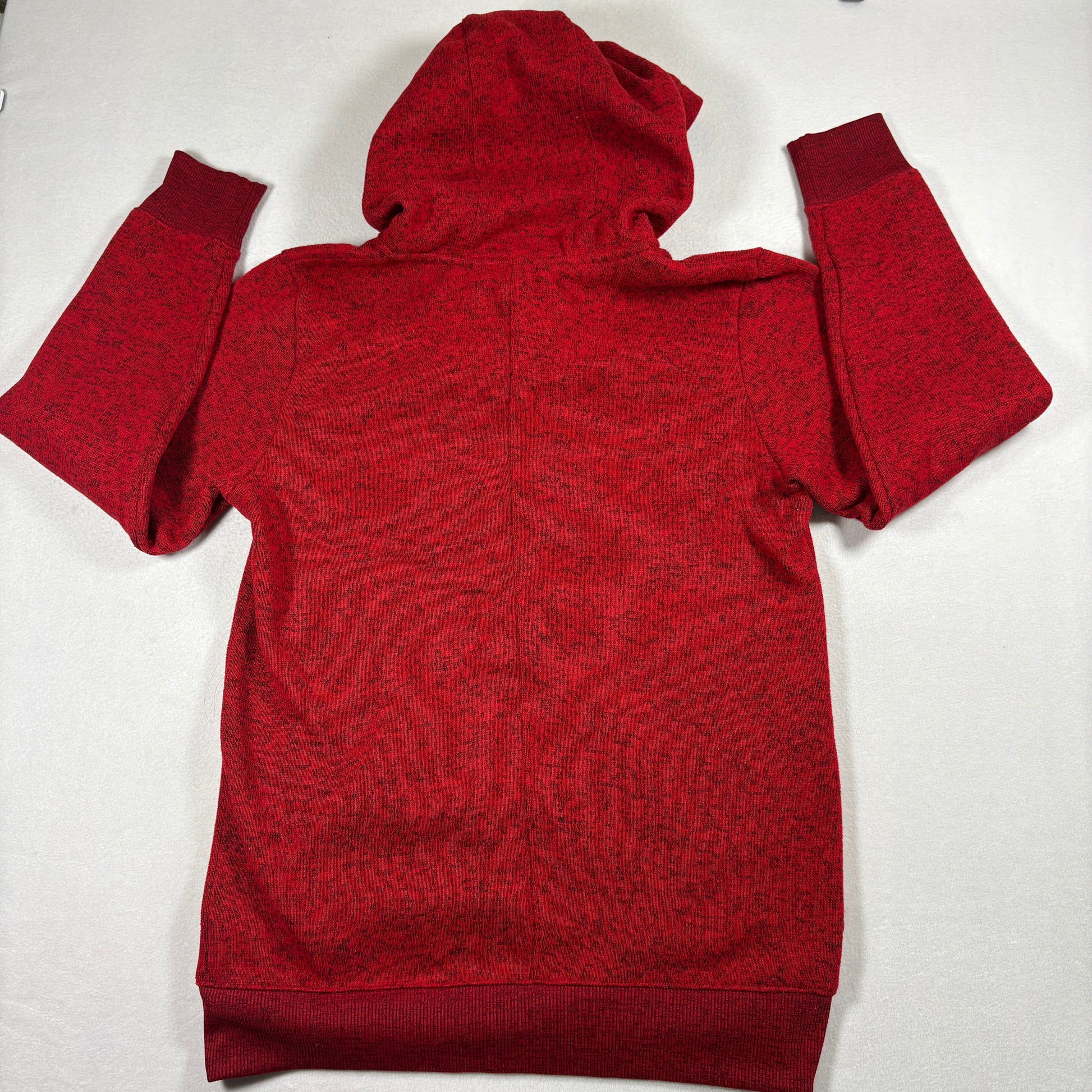✓ Red and black heathered fabric, full zip front
