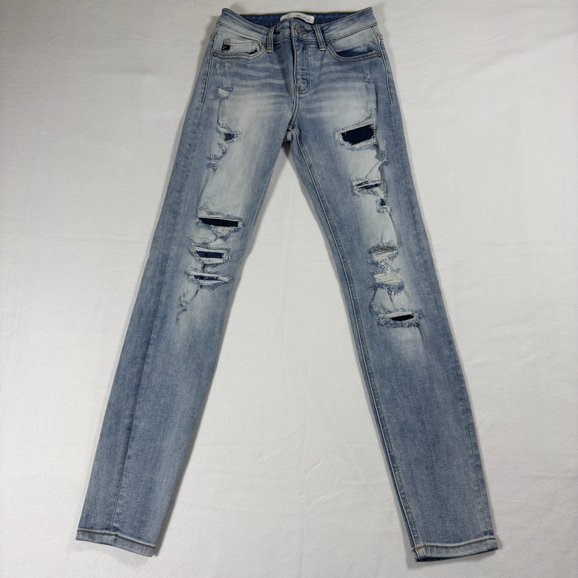 Light-wash KanCan skinny jeans with bold rips and soft stretch—perfect for Y2K, grunge, and streetwear outfits.