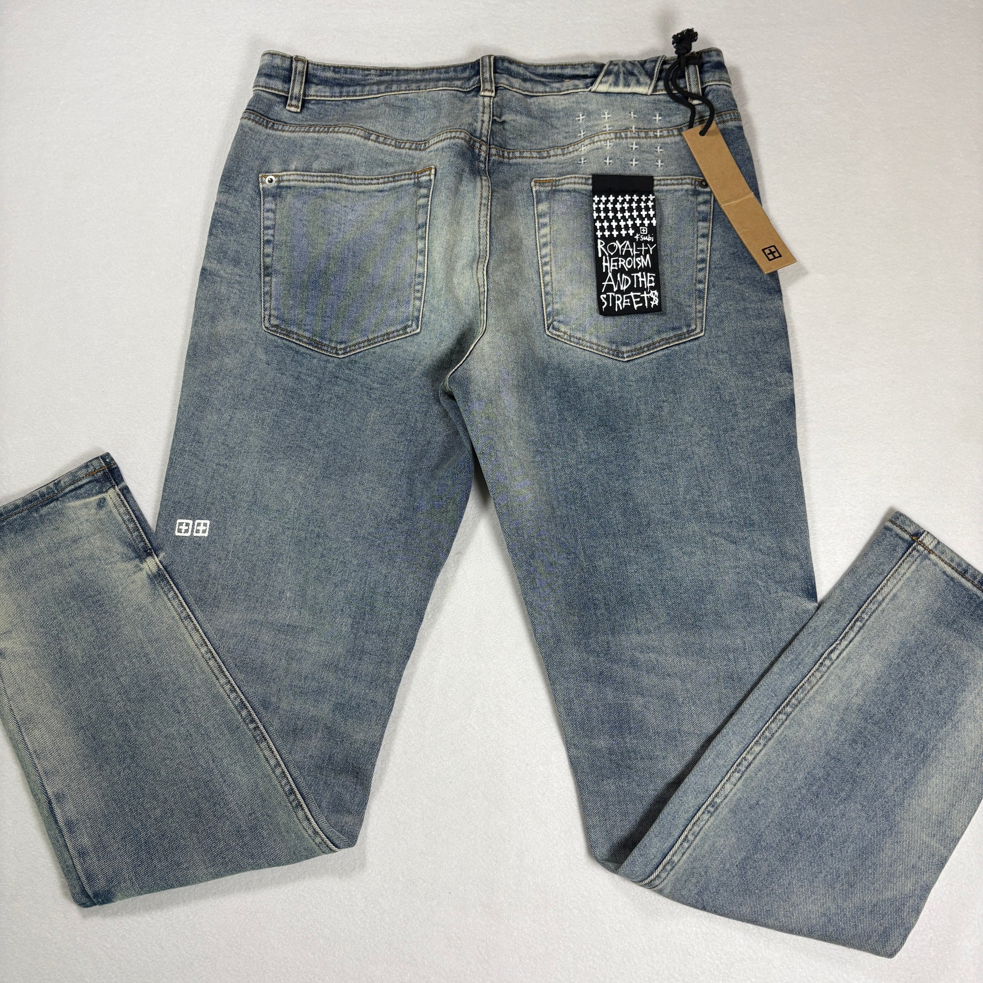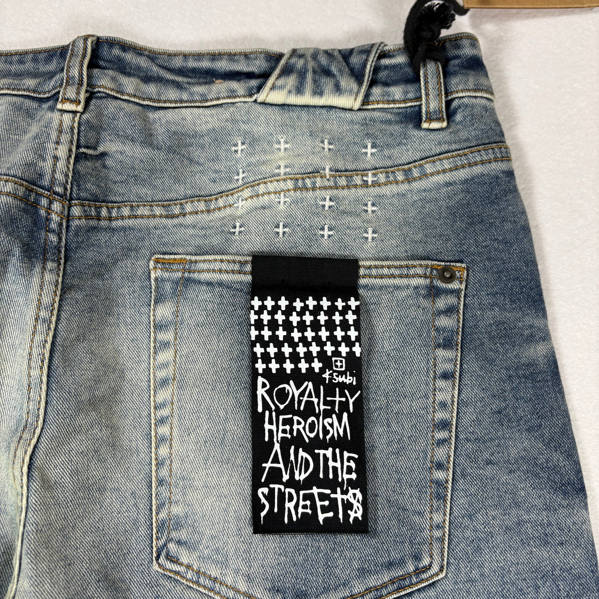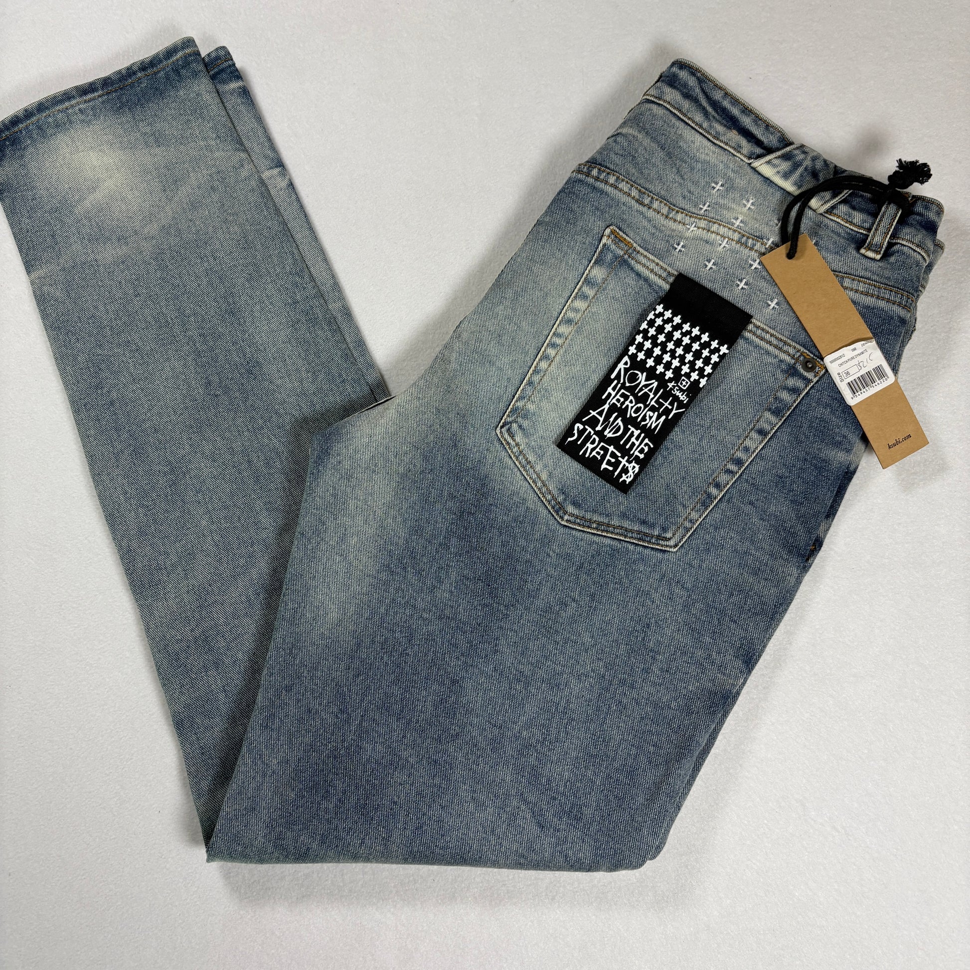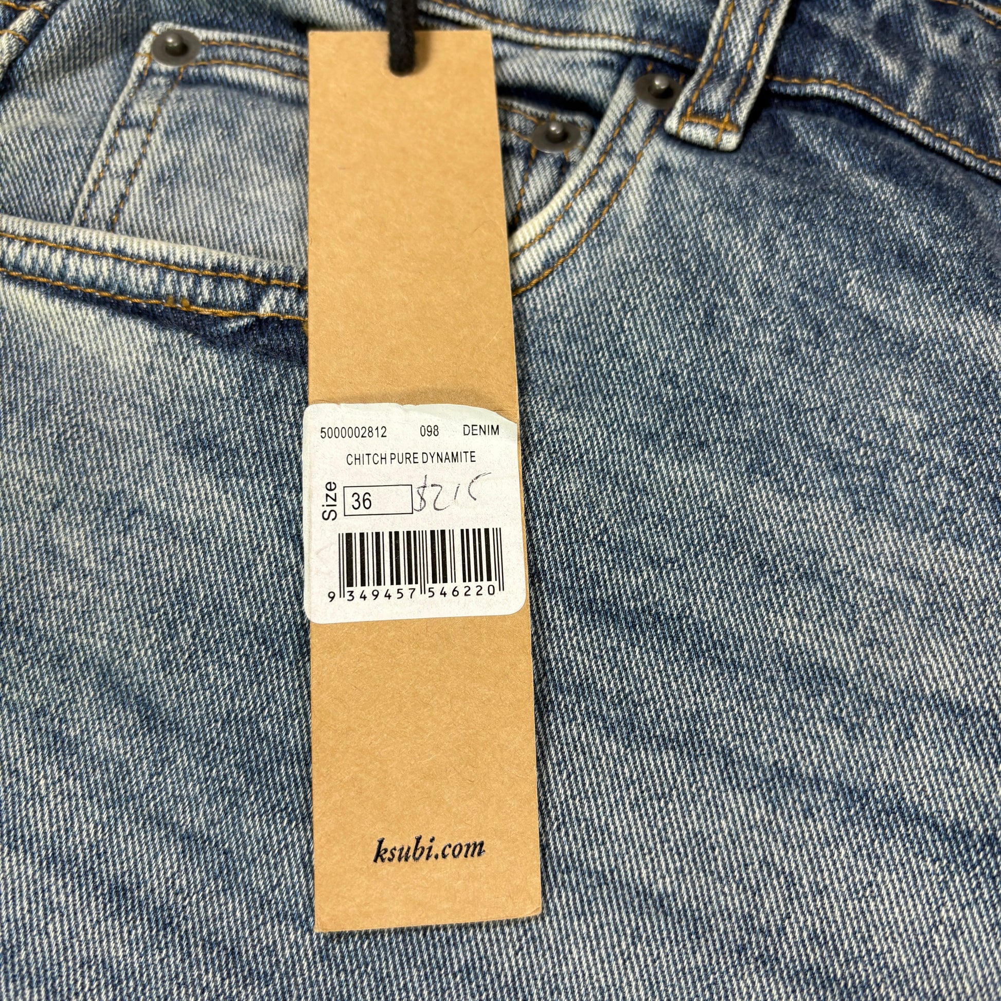 ✓ Ksubi brand, ✓ Mens size 36, ✓ Chitch Pure Dynamite model, ✓ Slim tapered fit, ✓ Light blue wash, ✓ Distressed fading, ✓ Signature rear patch + cross embroidery, ✓ NWT with hang tag, ✓ Premium streetwear denim.