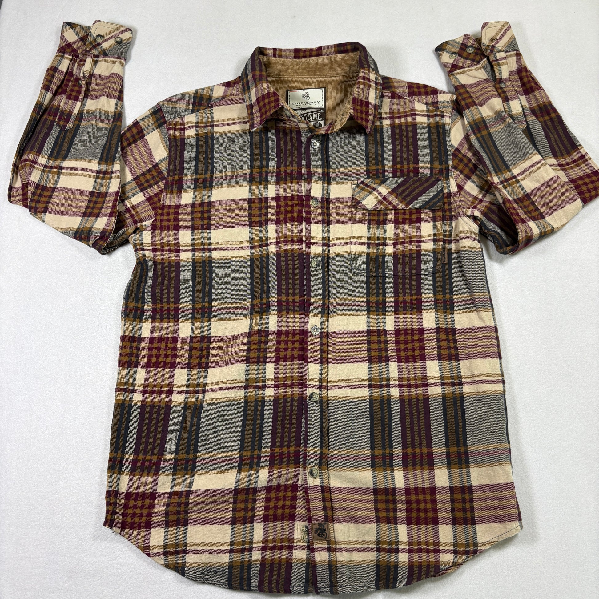 Legendary Whitetails Mens M Buck Camp Flannel Shirt Tan Burgundy Plaid Outdoor
