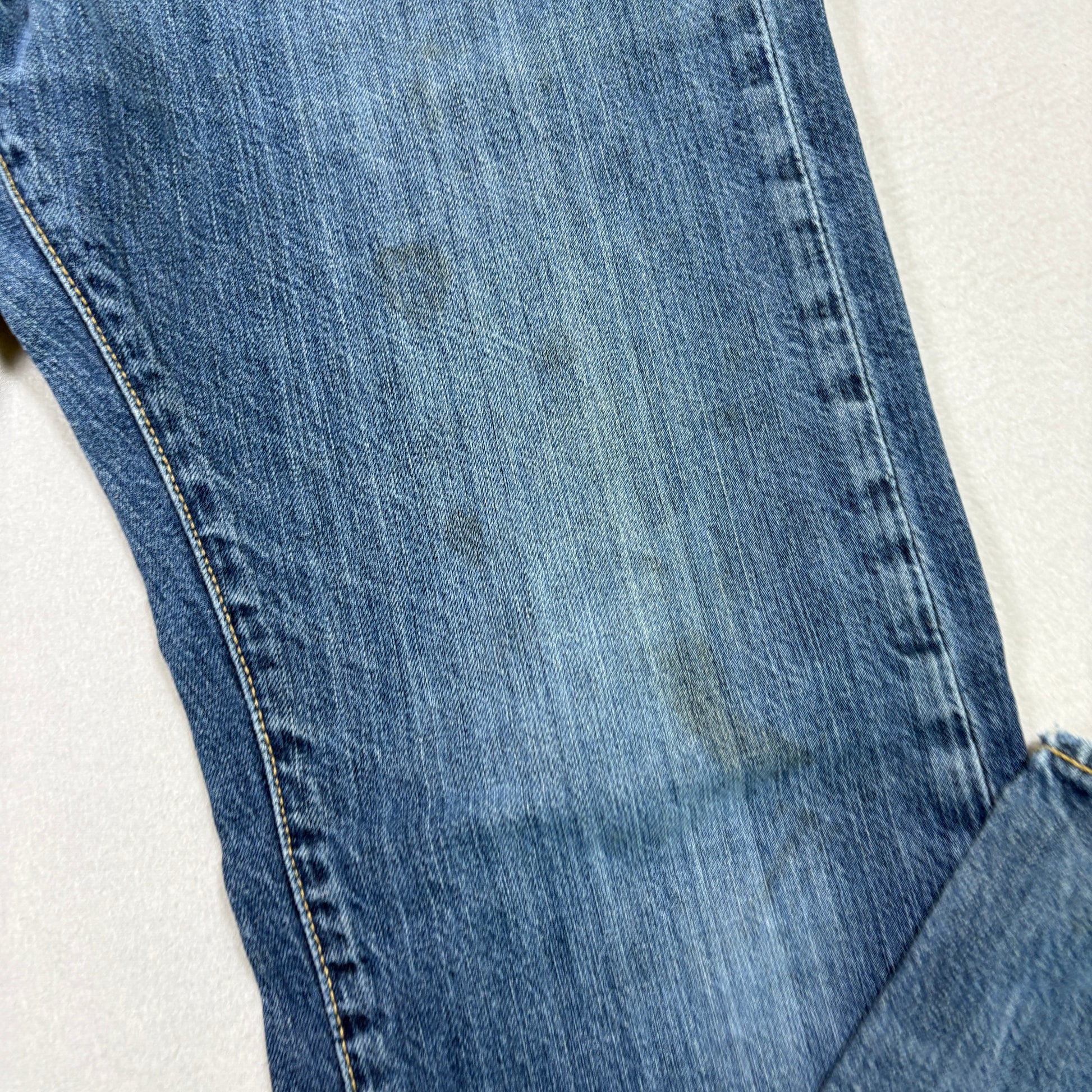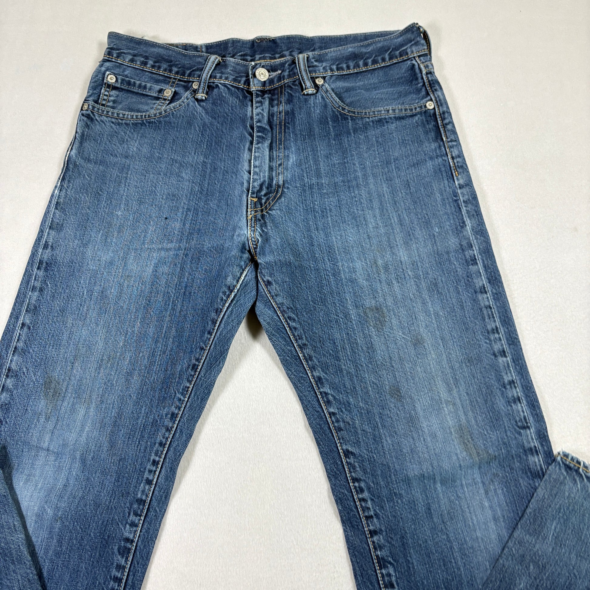 Classic Levi’s 505 straight leg jeans in men’s size 33x34. Durable 100% cotton denim with a timeless medium blue wash and vintage fade. A versatile everyday pair, ideal for casual wear, workwear, or grunge Y2K-inspired fits. Still lots of life left despite cosmetic wear.
