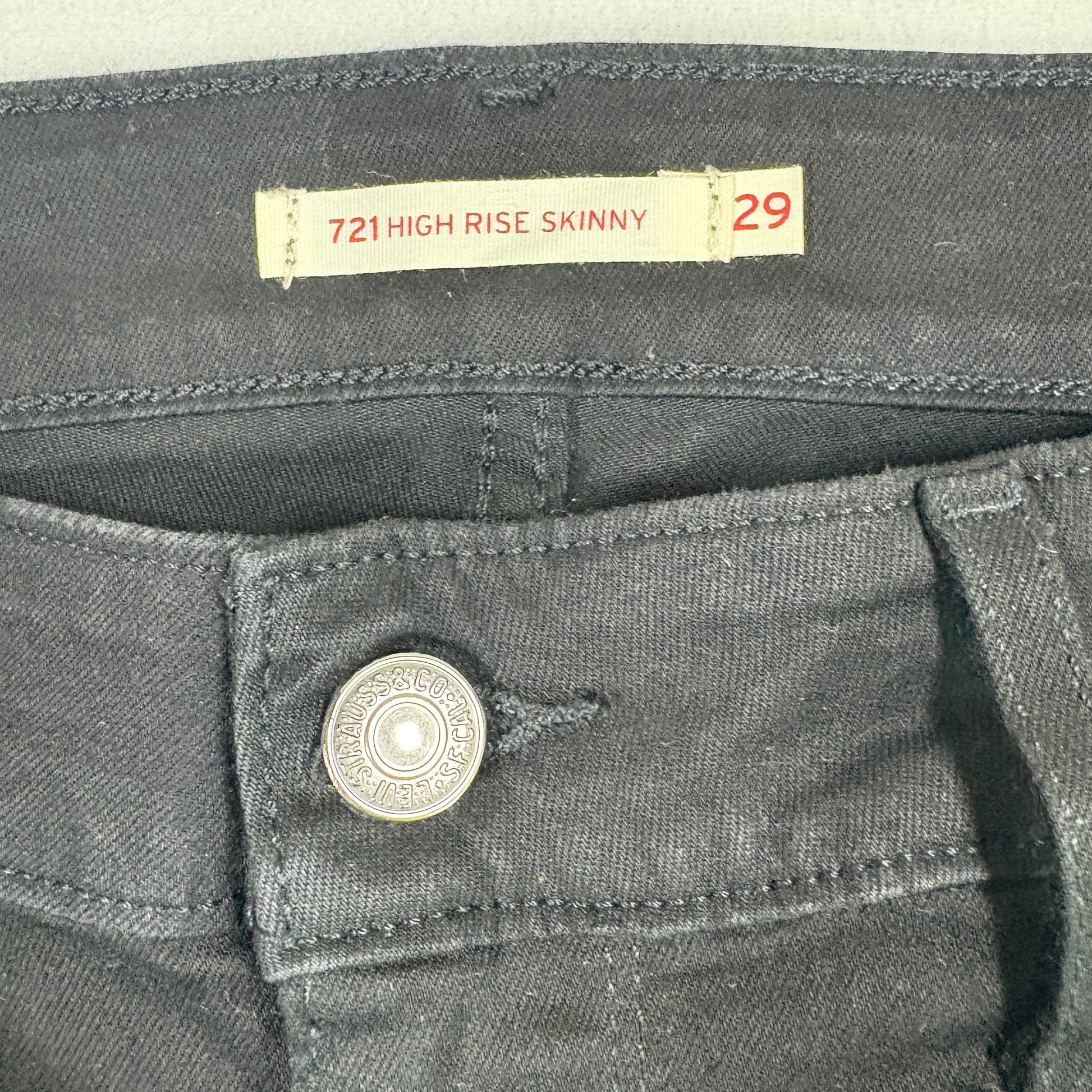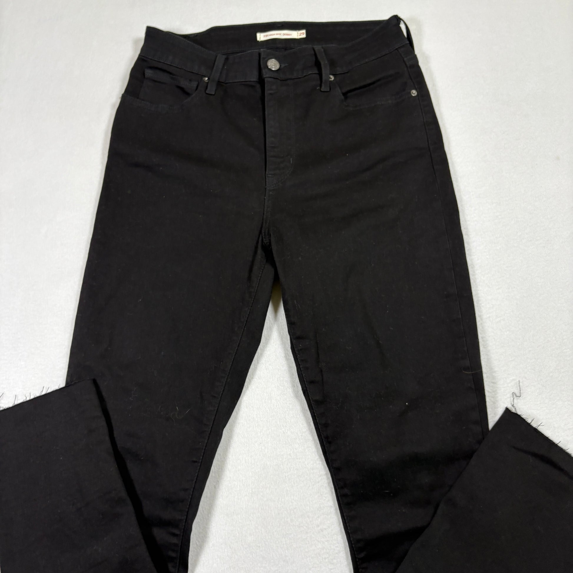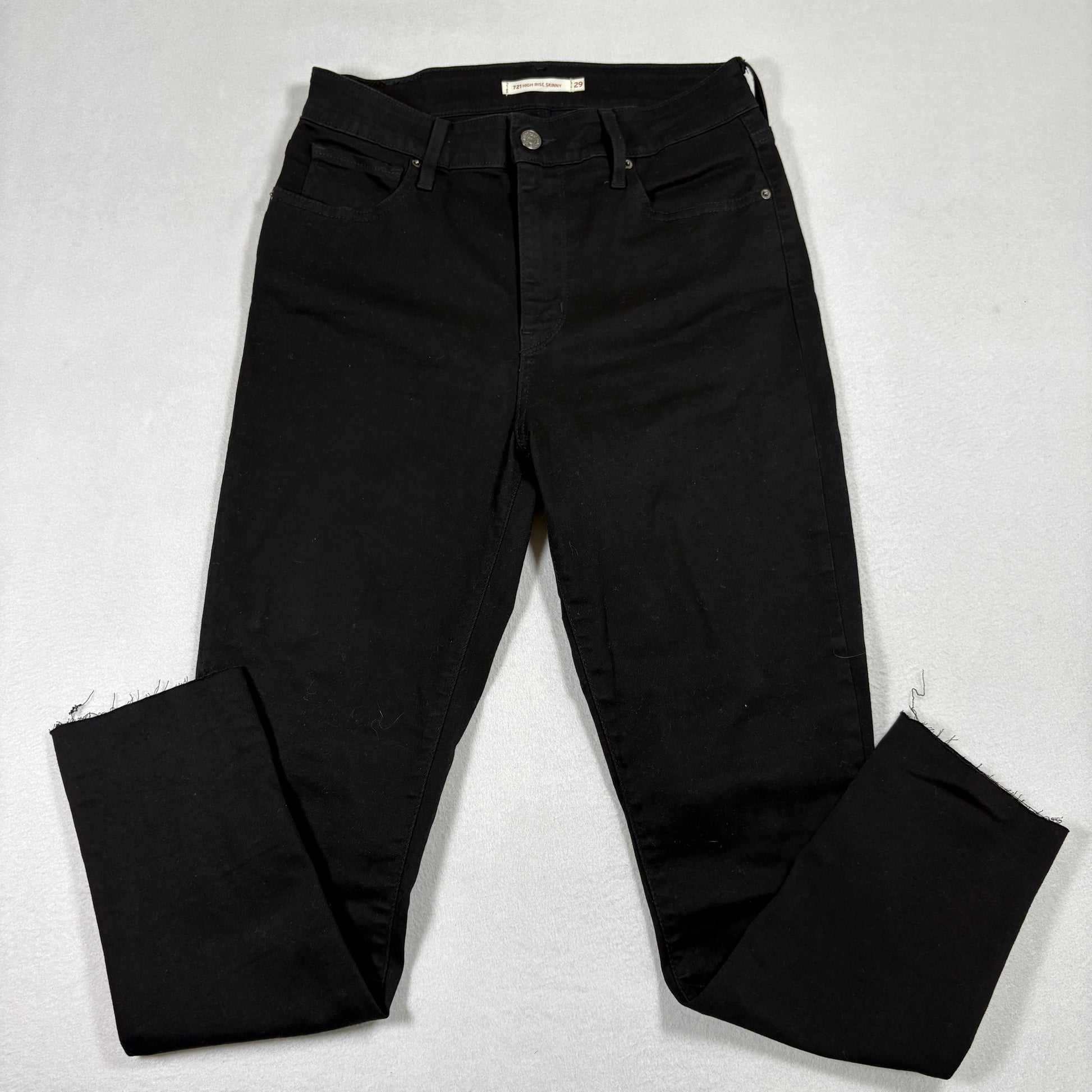 levi’s jeans, womens black denim, 721 high rise skinny, size 29x28, raw hem jeans, grunge y2k jeans, stretchy denim, levi’s waterless, vintage inspired