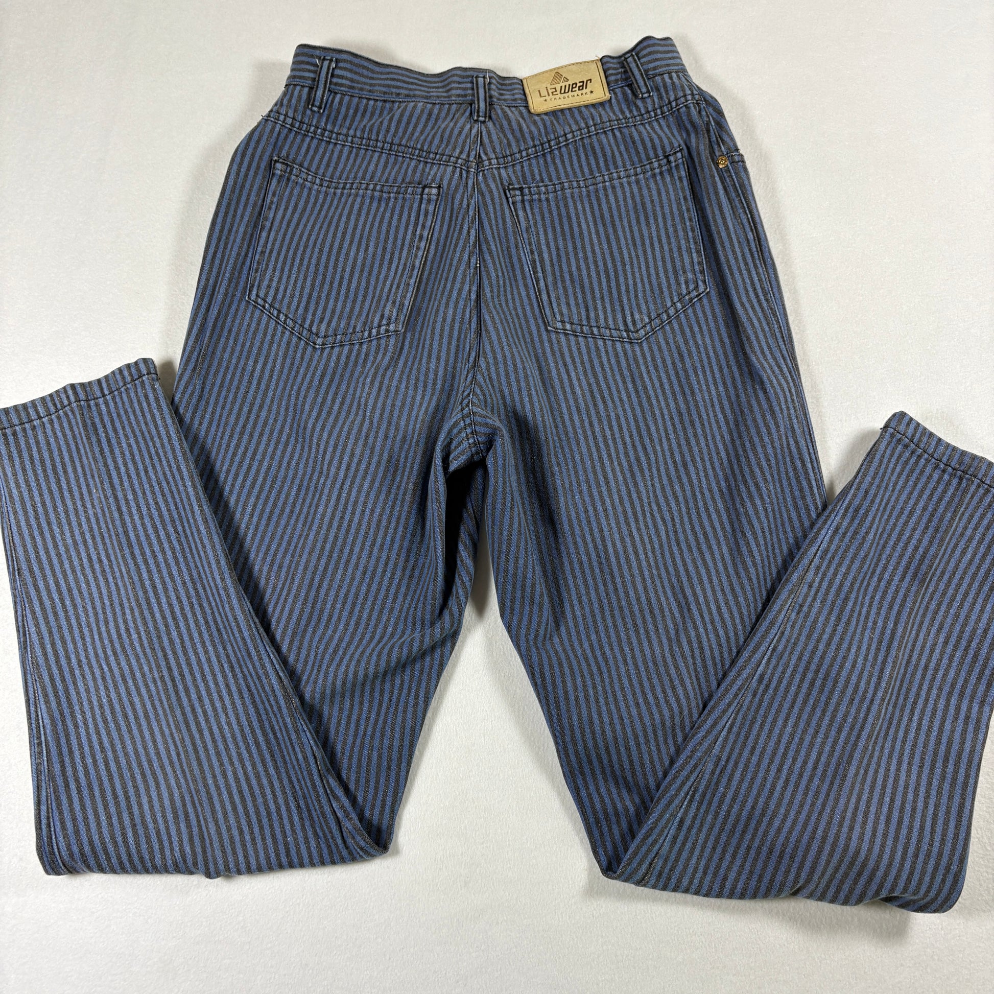Bold and timeless, these vintage Lizwear striped jeans give off authentic 90s Y2K grunge vibes. The high rise fit and blue-black stripe pattern make them stand out, perfect for retro styling or modern streetwear looks. We strive to ship the same or next business day depending on when your order is placed. Free 30 day returns for your peace of mind. Please refer to all pictures for details. We combine shipping, so visit our store for more unique vintage denim finds.