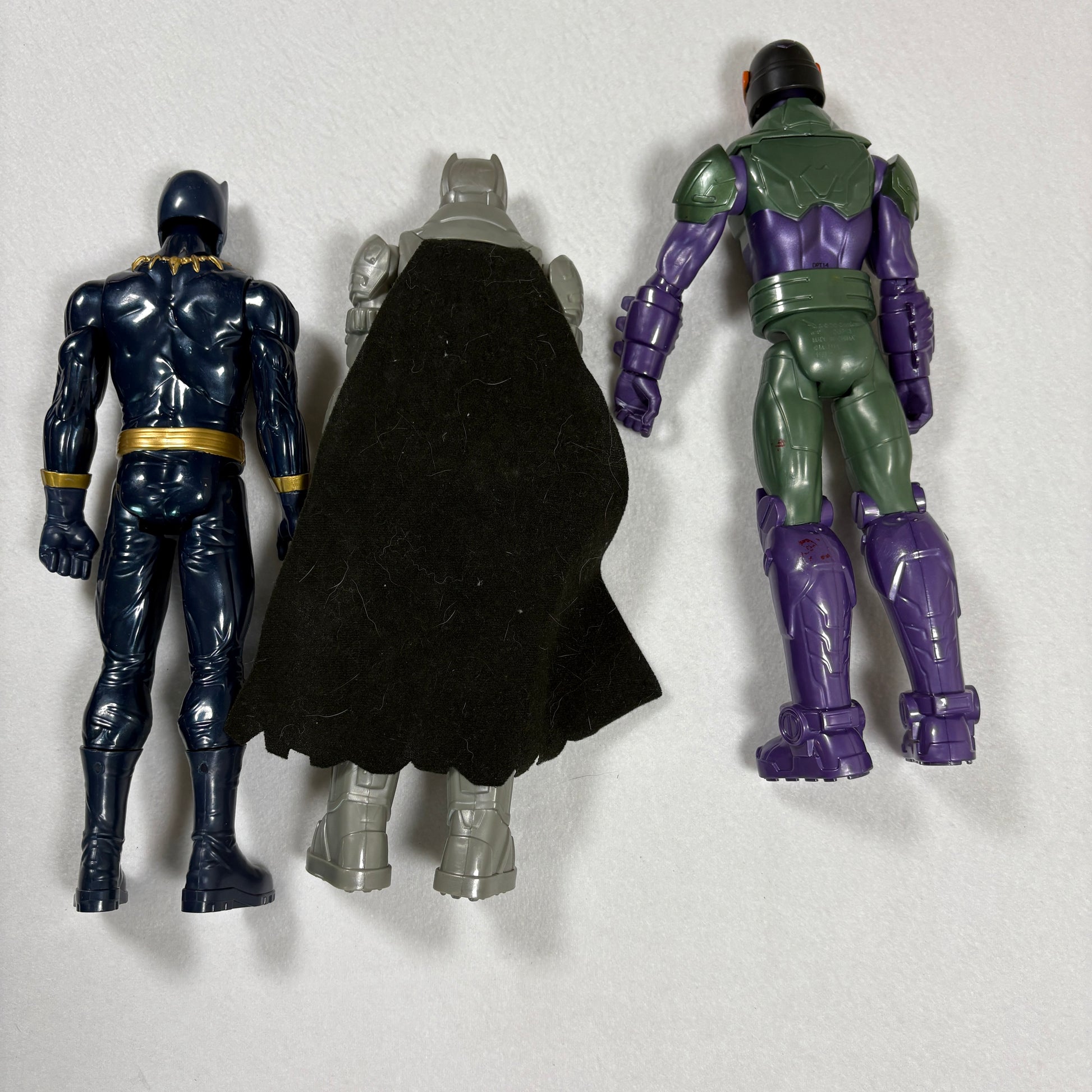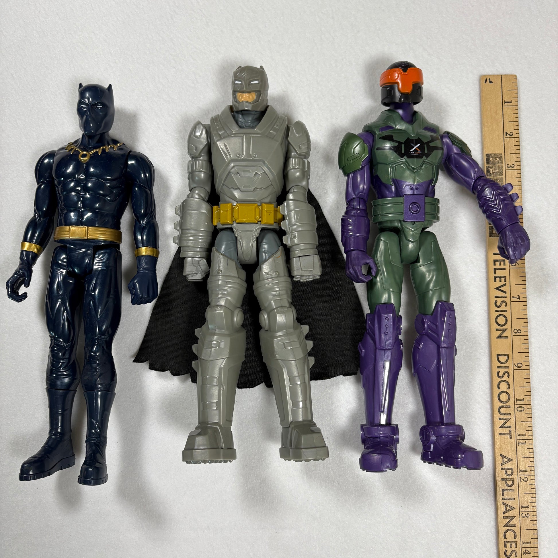 ✓ Lot of 3 action figures, ✓ Includes Black Panther, Batman Armored suit (gray w/ cape), and green/purple armored figure, ✓ Approx. 12” tall, ✓ Mixed DC Comics & Marvel characters, ✓ Pre-owned with light play wear, ✓ Sold as pictured.