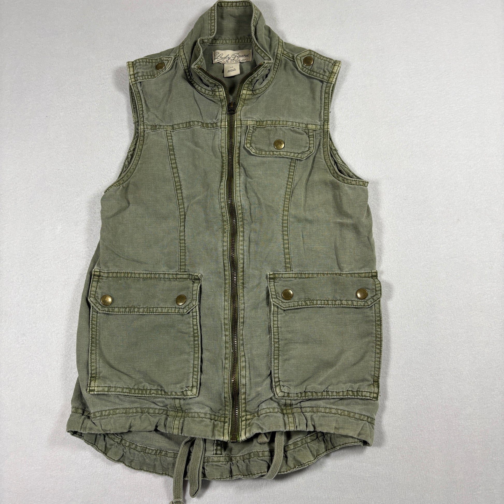 Timeless Lucky Brand vest with military-inspired utility design. Features a zip front, cargo pockets, and adjustable drawstring hem for a versatile Y2K grunge look. Great lightweight layering piece for casual or festival wear.