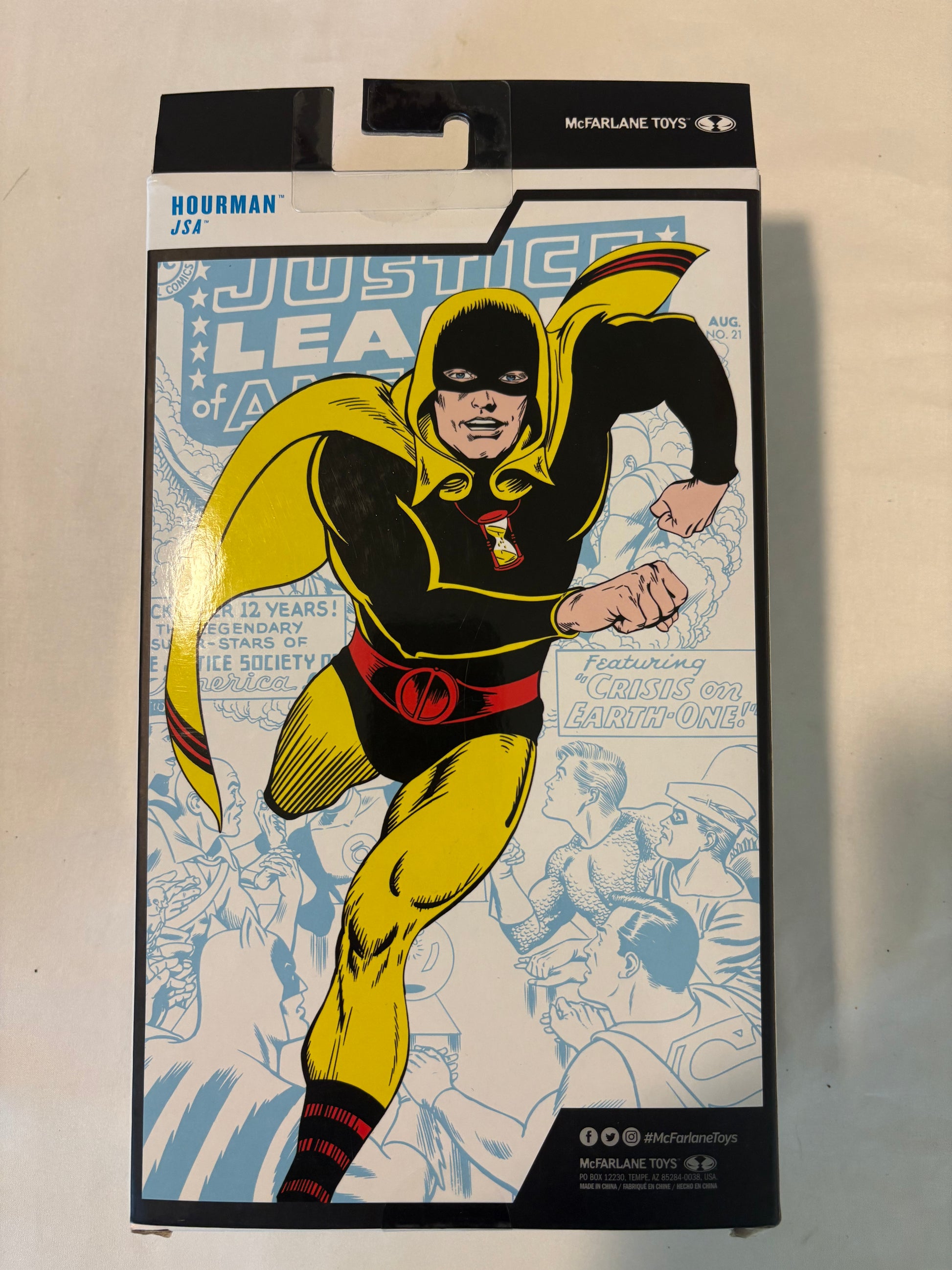 Unleash a piece of the DC Universe with this McFarlane Toys DC Multiverse Hourman action figure from the exclusive Gold Label Collection. This highly detailed 7-inch figure features Hourman in his classic yellow and black costume with red belt and stripe details. The packaging is factory sealed and includes the collectible comic-style art card and accessories.