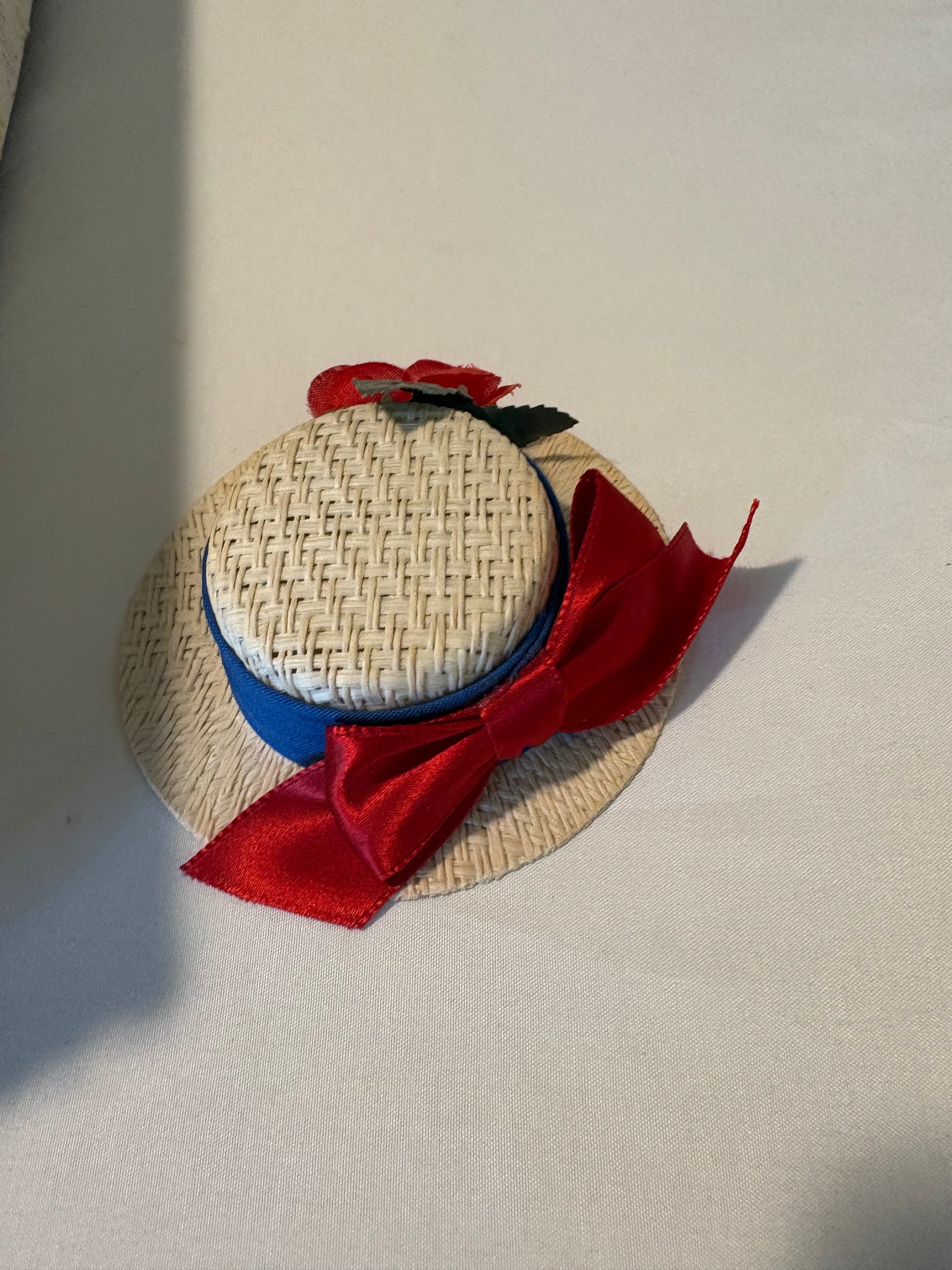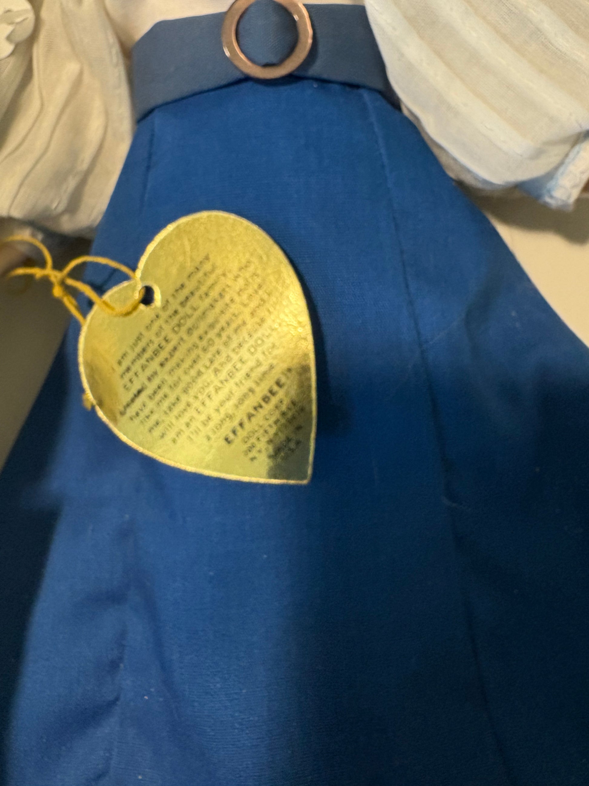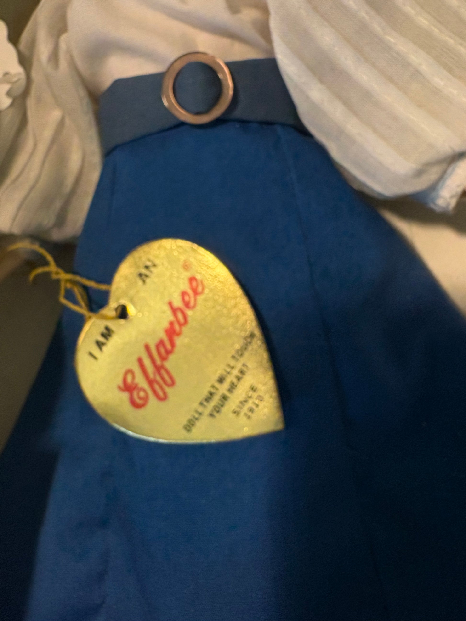This beautiful collectible Meyer’s 1914 Dolly Shopper doll by Effanbee is a tribute to early 20th-century fashion. Dressed in a classic blue skirt, white blouse, and straw hat with red flowers, this elegant doll stands approximately 13 inches tall and comes in her original box with the Certificate of Authenticity (#641 of 1200).
