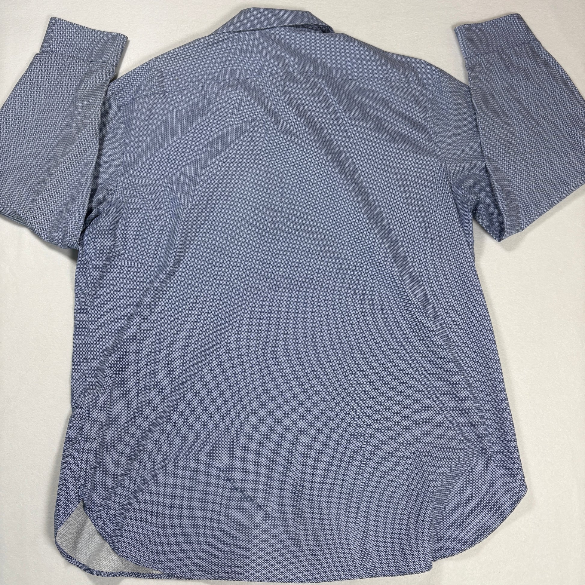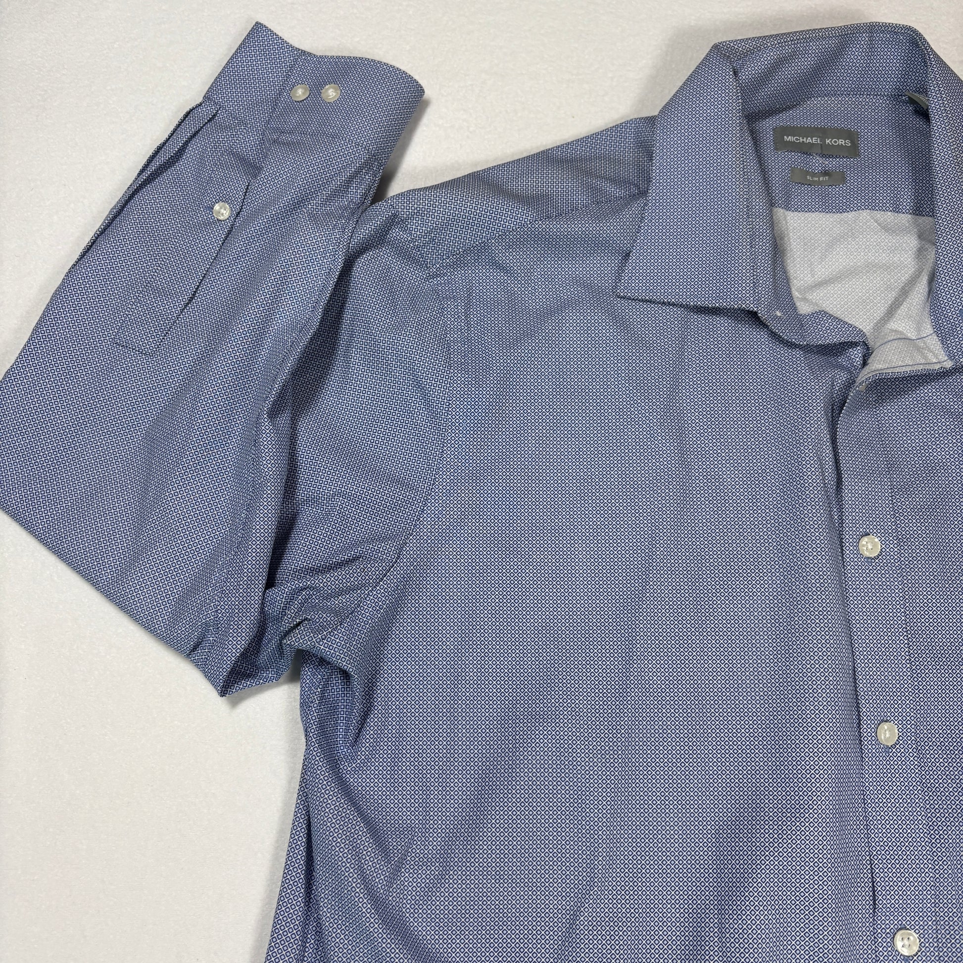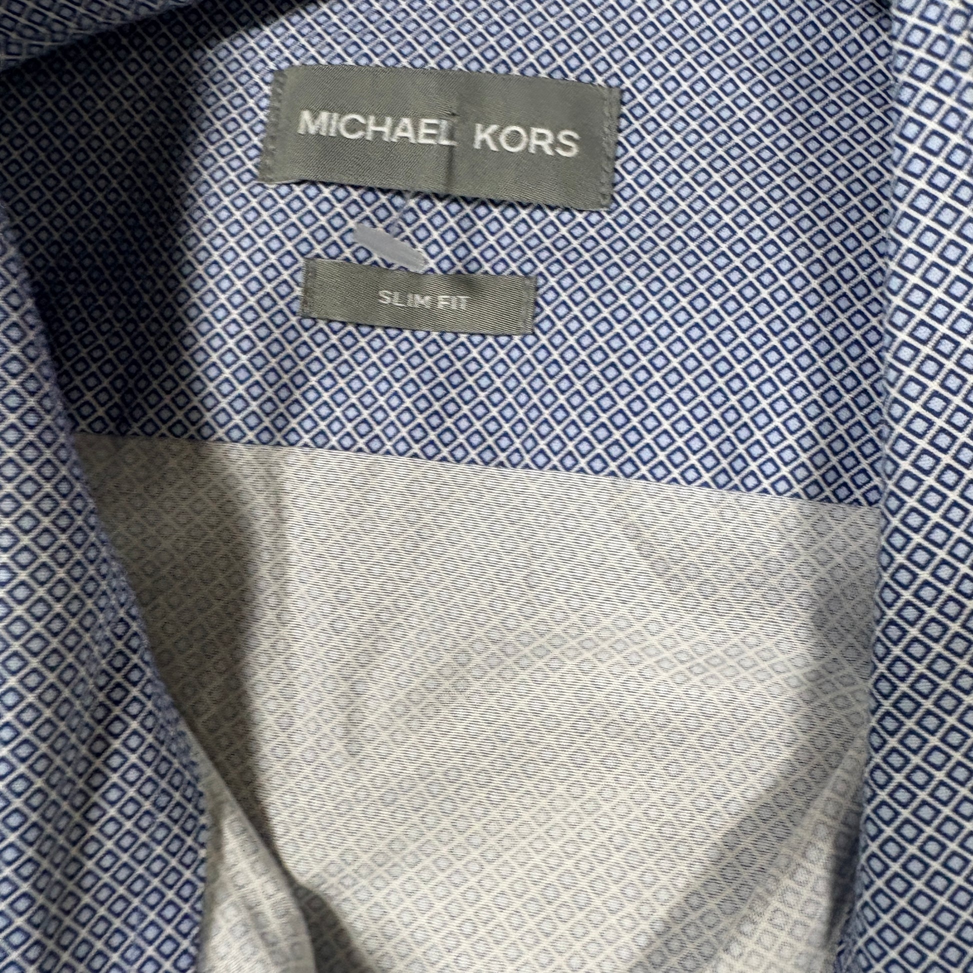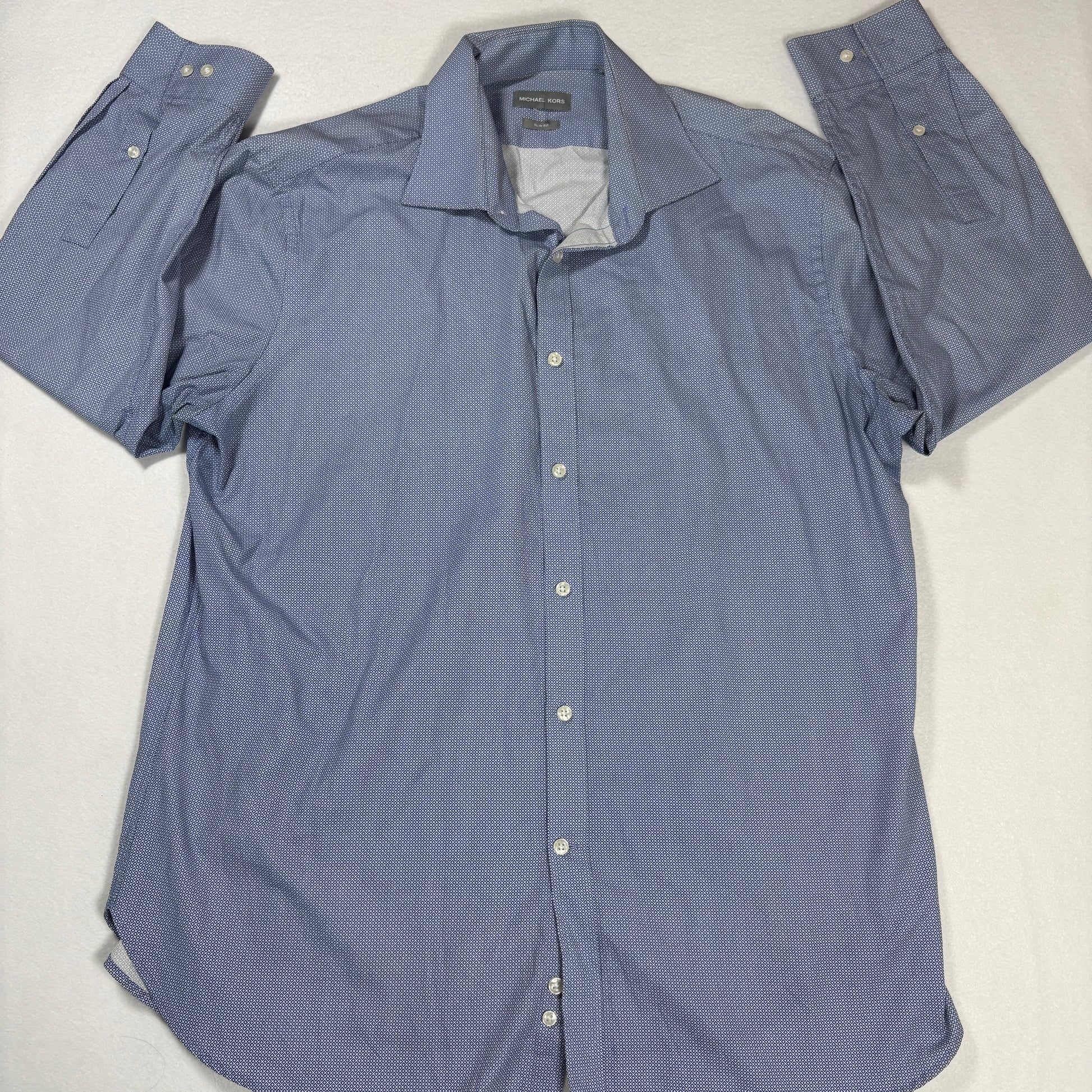 michael kors dress shirt, mens slim fit button up, xl blue geometric shirt, long sleeve business shirt, stained shirt discounted, formal casual shirt
