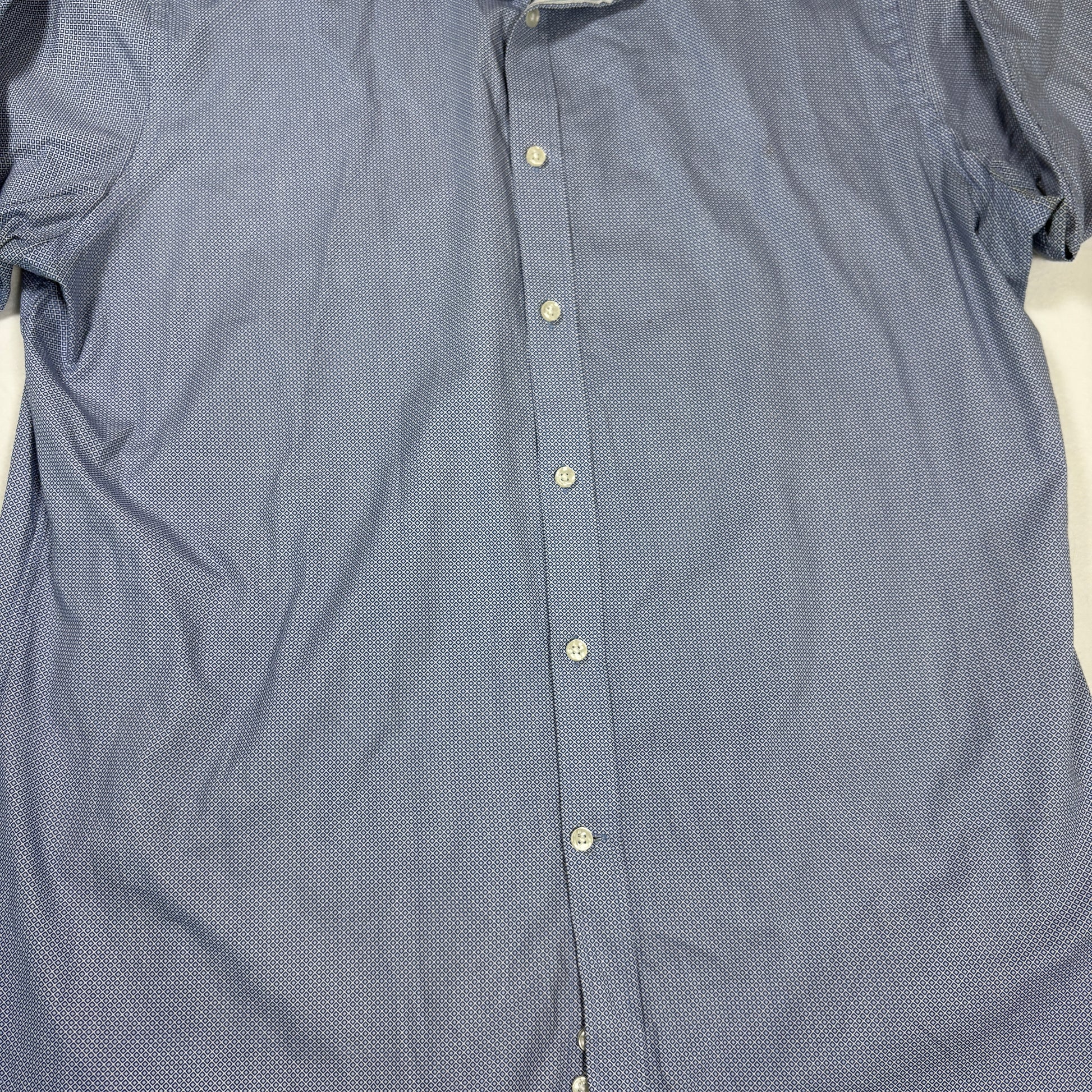 A sharp slim fit dress shirt from Michael Kors with an eye-catching geometric pattern. Great for business, events, or casual wear under a blazer. Please note: this shirt has visible staining, sold as-is at a discounted price.