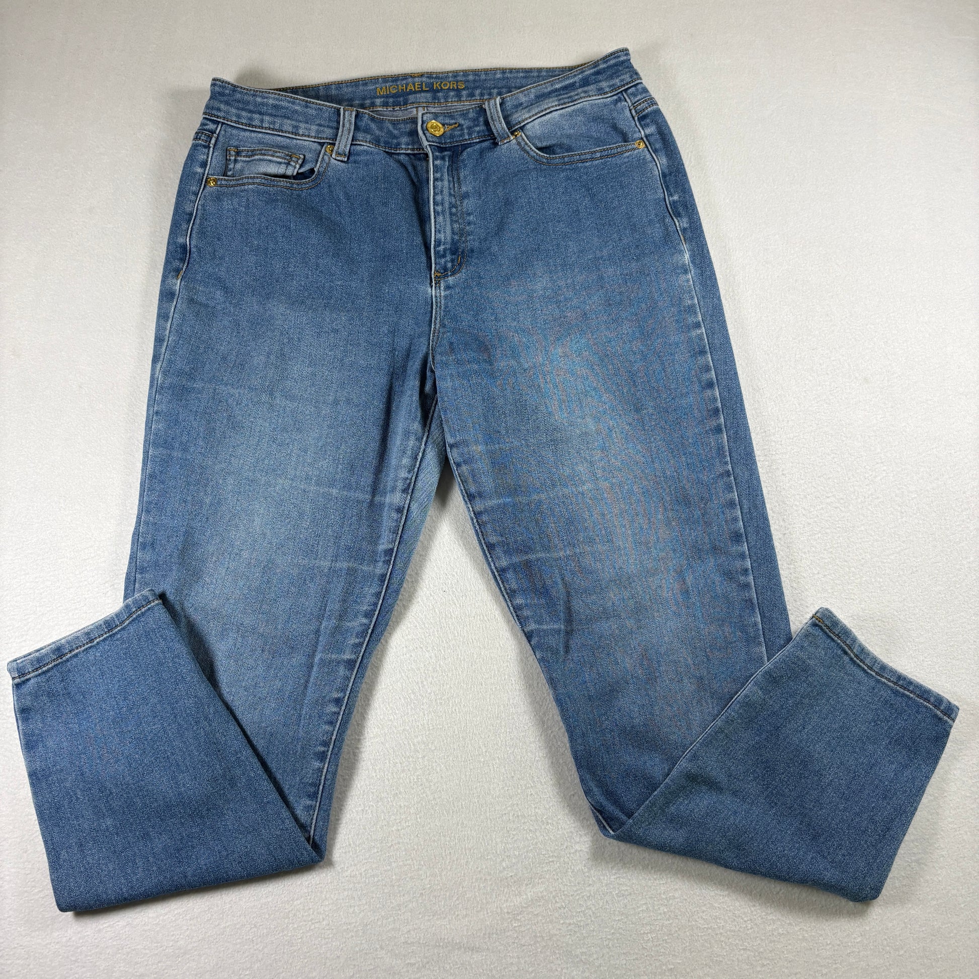 Michael Kors women’s jeans in size 10. A versatile pair of blue denim jeans with straight leg fit, perfect for casual everyday wear. Features the signature MK logo detail, stretch fabric blend, and timeless styling.
