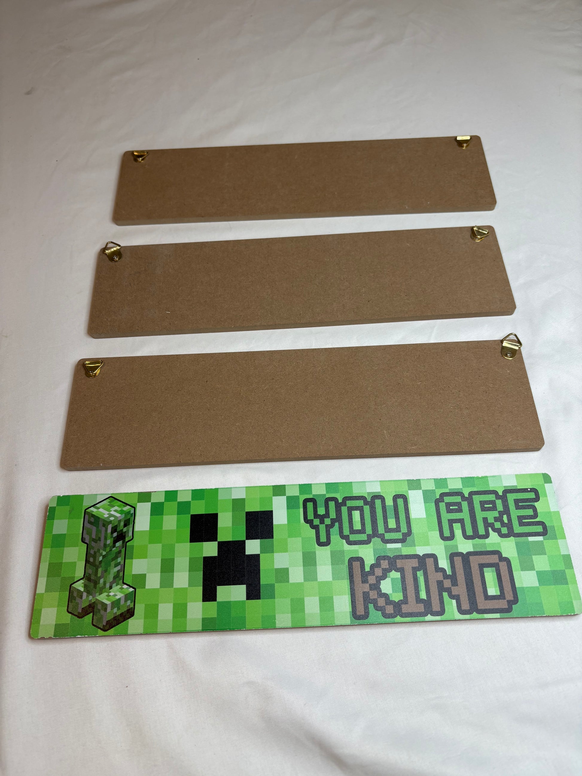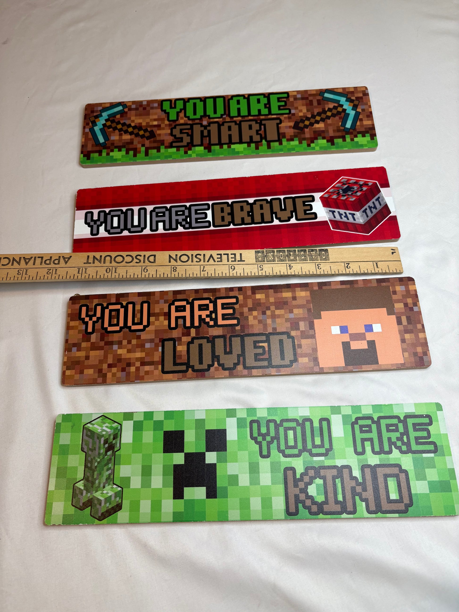 Add a pop of pixelated positivity to your space with this set of 4 Minecraft-style wall art signs. Each sign features a unique encouraging message with vibrant pixel designs inspired by the hit game. Perfect for bedrooms, gaming setups, classrooms, or playrooms.