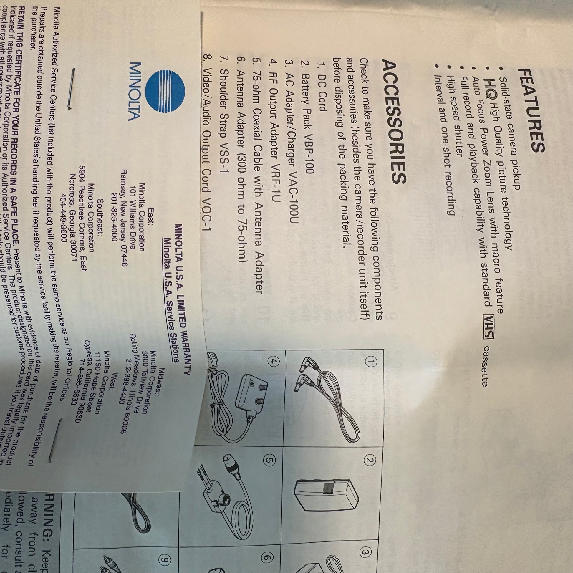 Capture nostalgia with this Minolta Master Series-V1R VHS camcorder in excellent tested condition. Comes complete with its original hard case, power adapter, cables, and user manual. This vintage camcorder is perfect for collectors, retro shooters, or display.