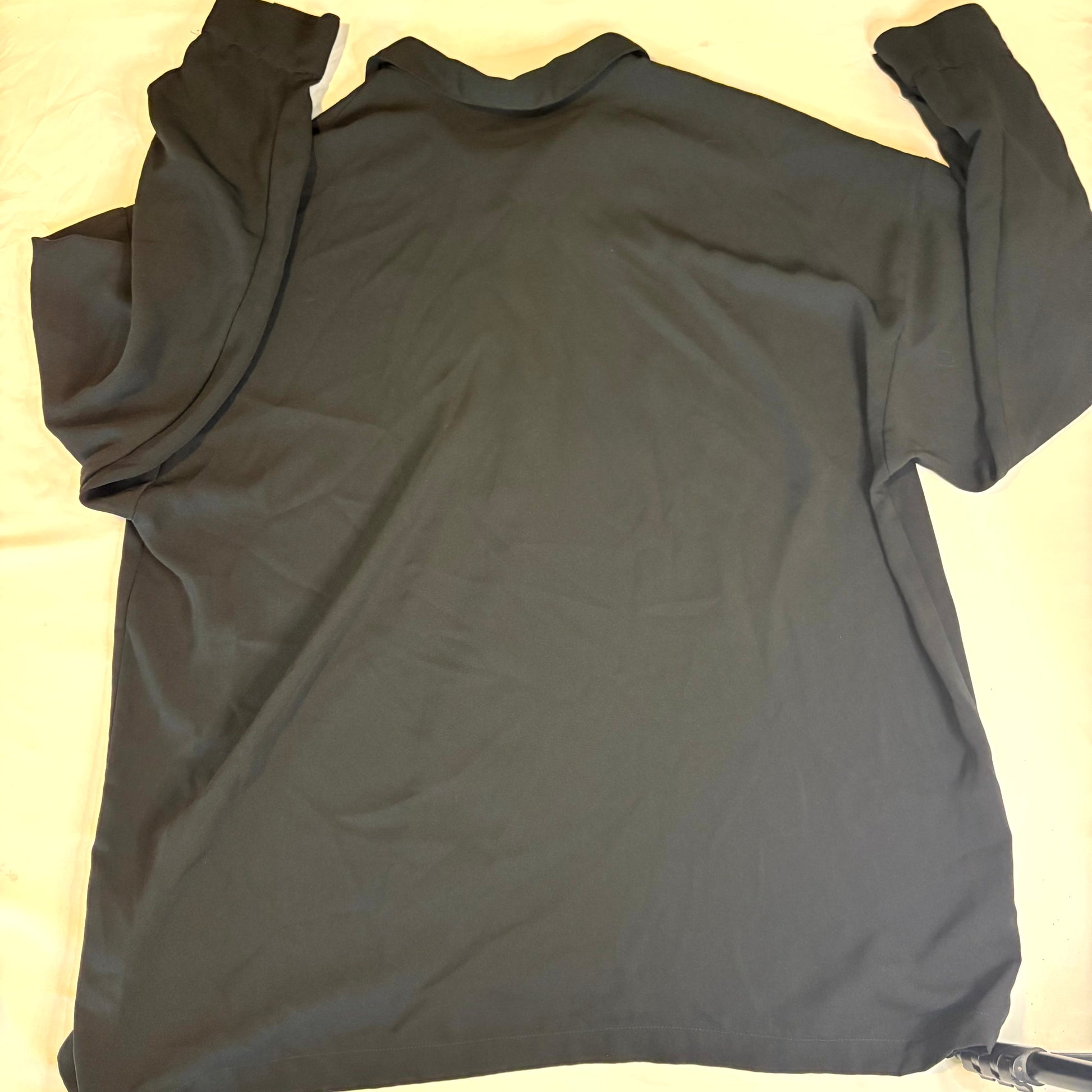Features a solid black color, long sleeves with button cuffs, and a traditional point collar.
