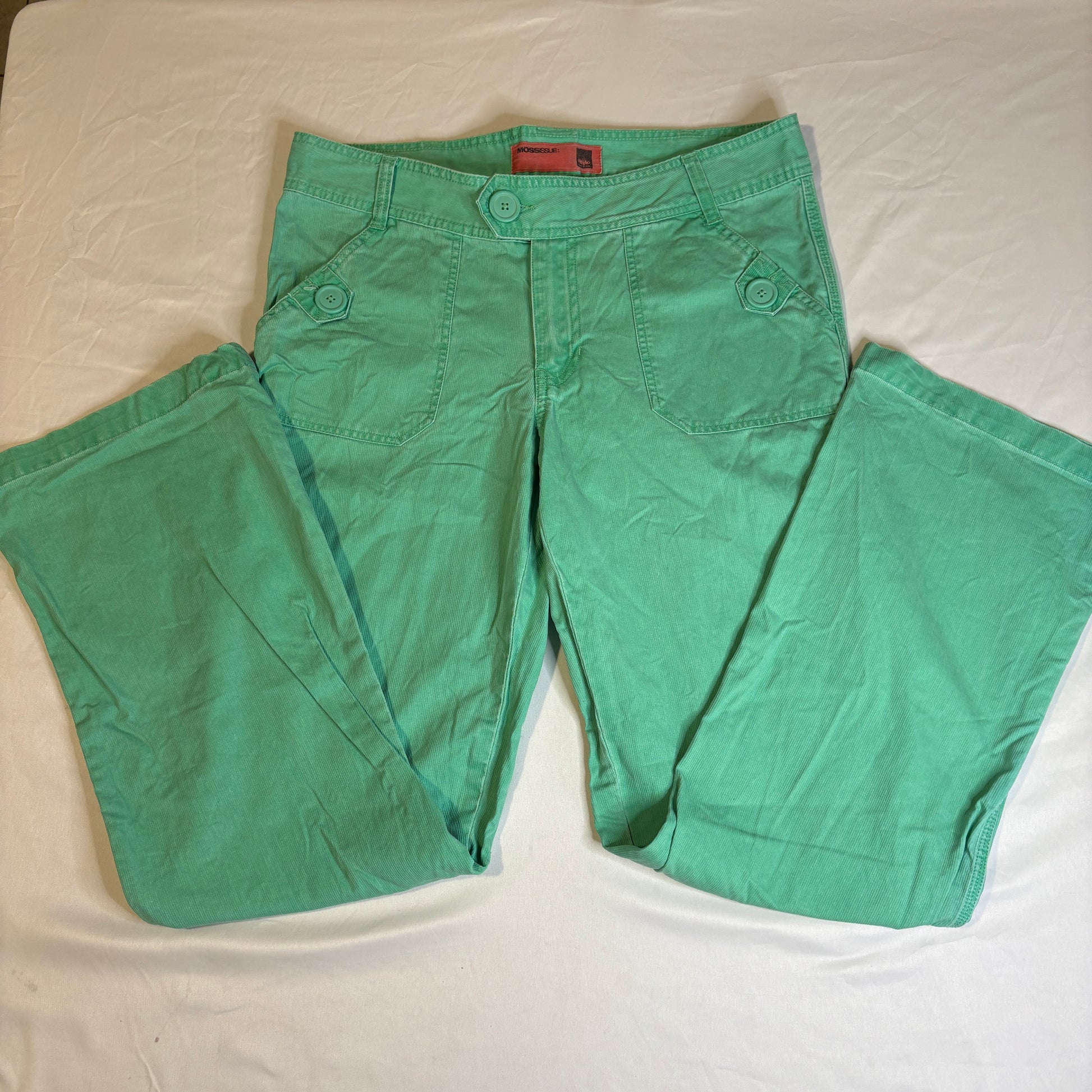 women’s bootcut pants, Mossimo green pants, size 13 casual pants, cotton bootcut trousers, colorful festival pants, relaxed fit
