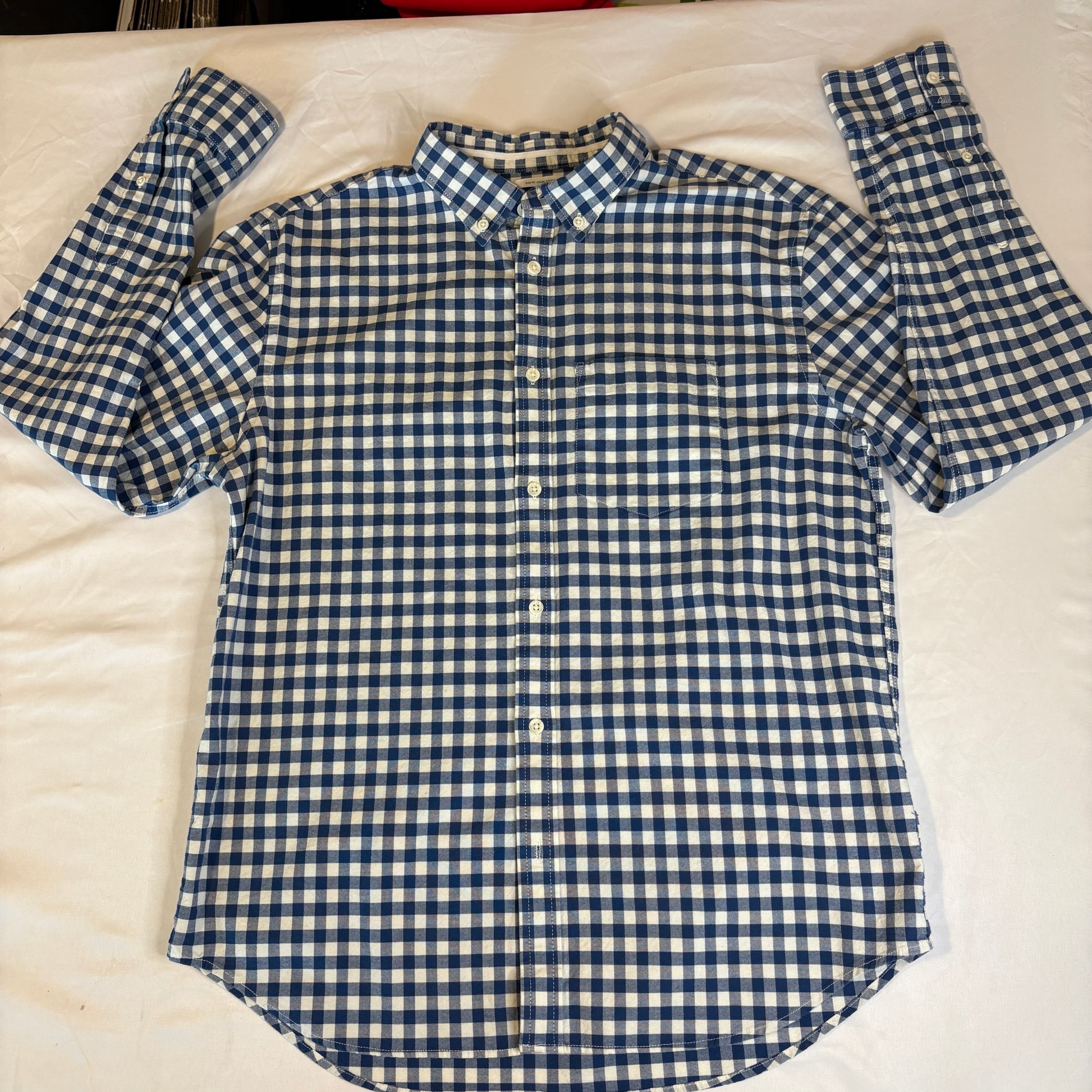 Old Navy men’s Oxford shirt in size large, featuring a blue and white gingham check pattern. Slim fit design with a bit of stretch for comfort and mobility. Made from soft cotton-blend fabric, this button-down shirt includes a chest pocket and button-down collar, perfect for both casual and smart-casual wear.