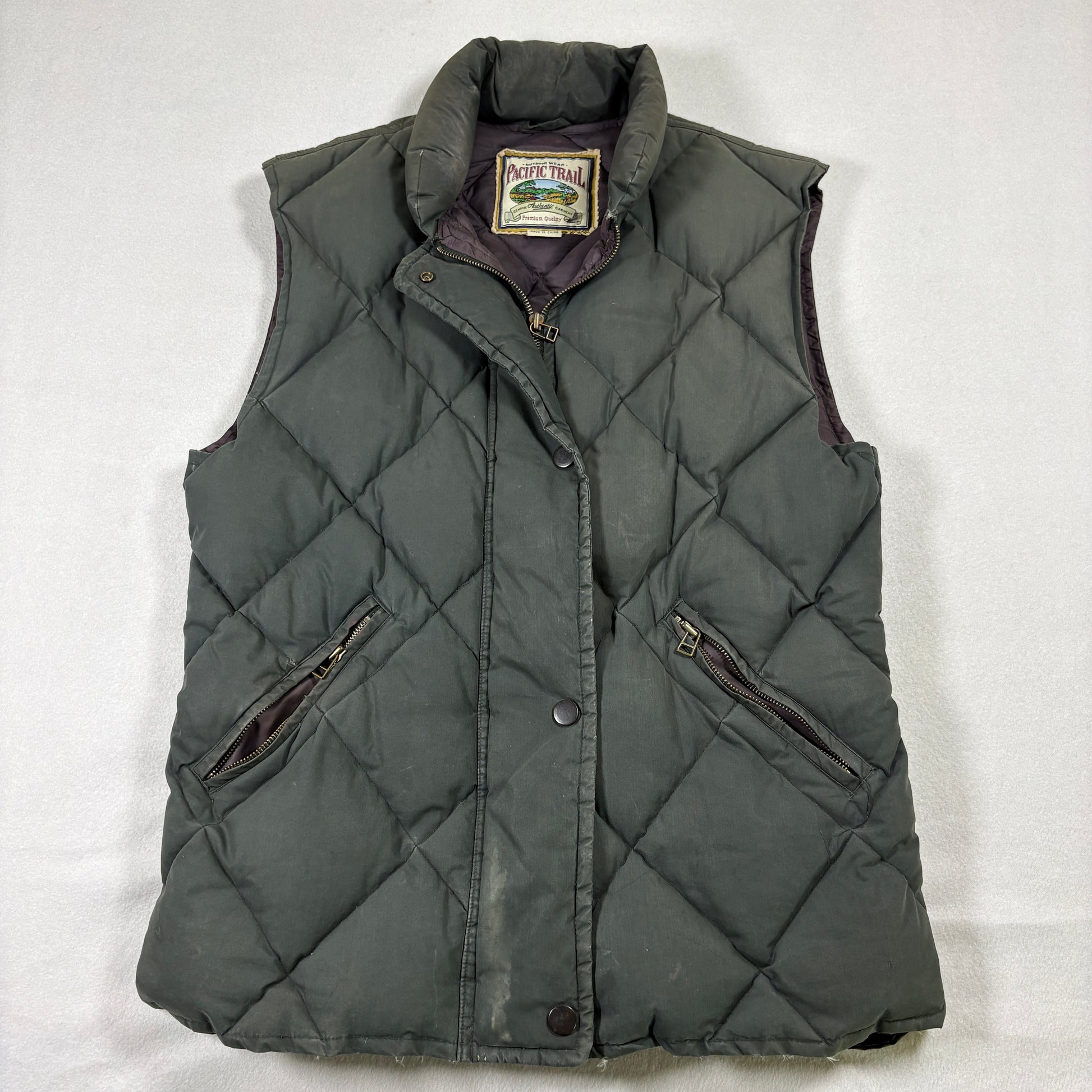 Vintage Pacific Trail mens quilted puffer vest in classic dark green. Rugged outdoor style with diamond quilt design, zip + snap closure, and functional zip pockets. A versatile layering piece for camping, hiking, workwear, or 90s/Y2K grunge streetwear looks.
