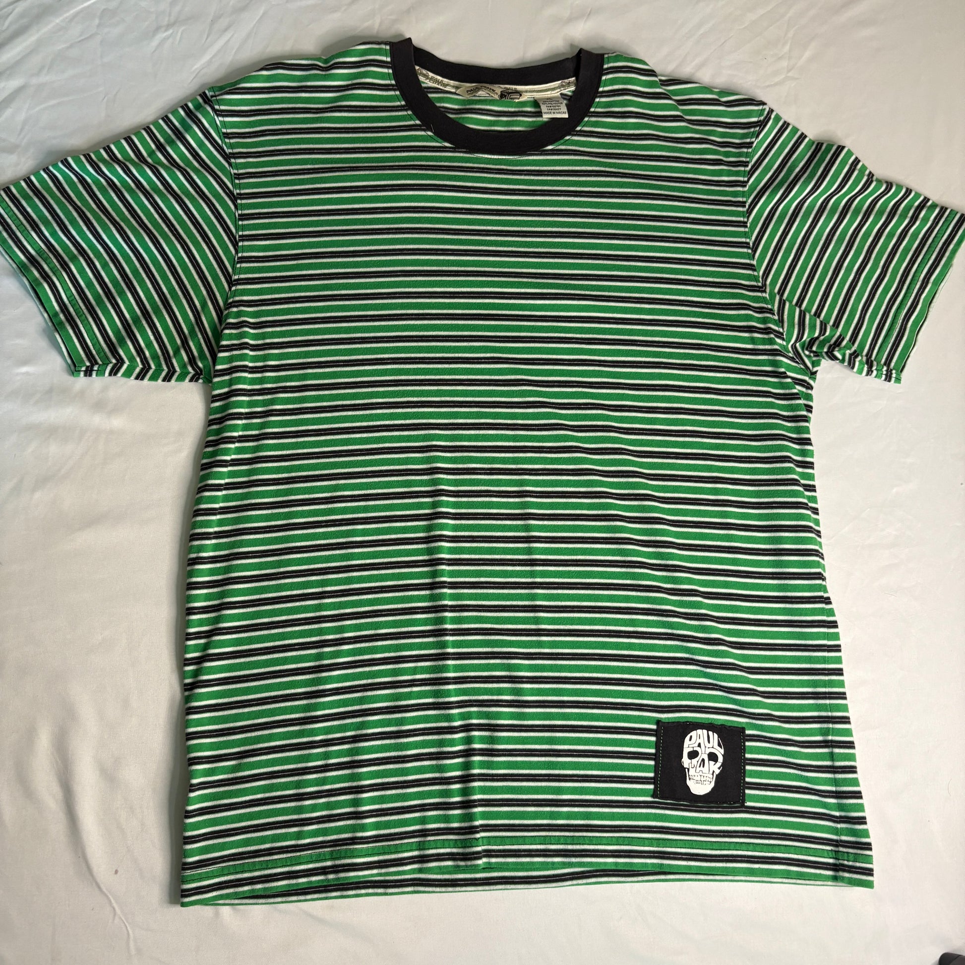 Paul Frank Men’s XL Striped T-Shirt Green Black Skull Patch Y2K Streetwear Retro