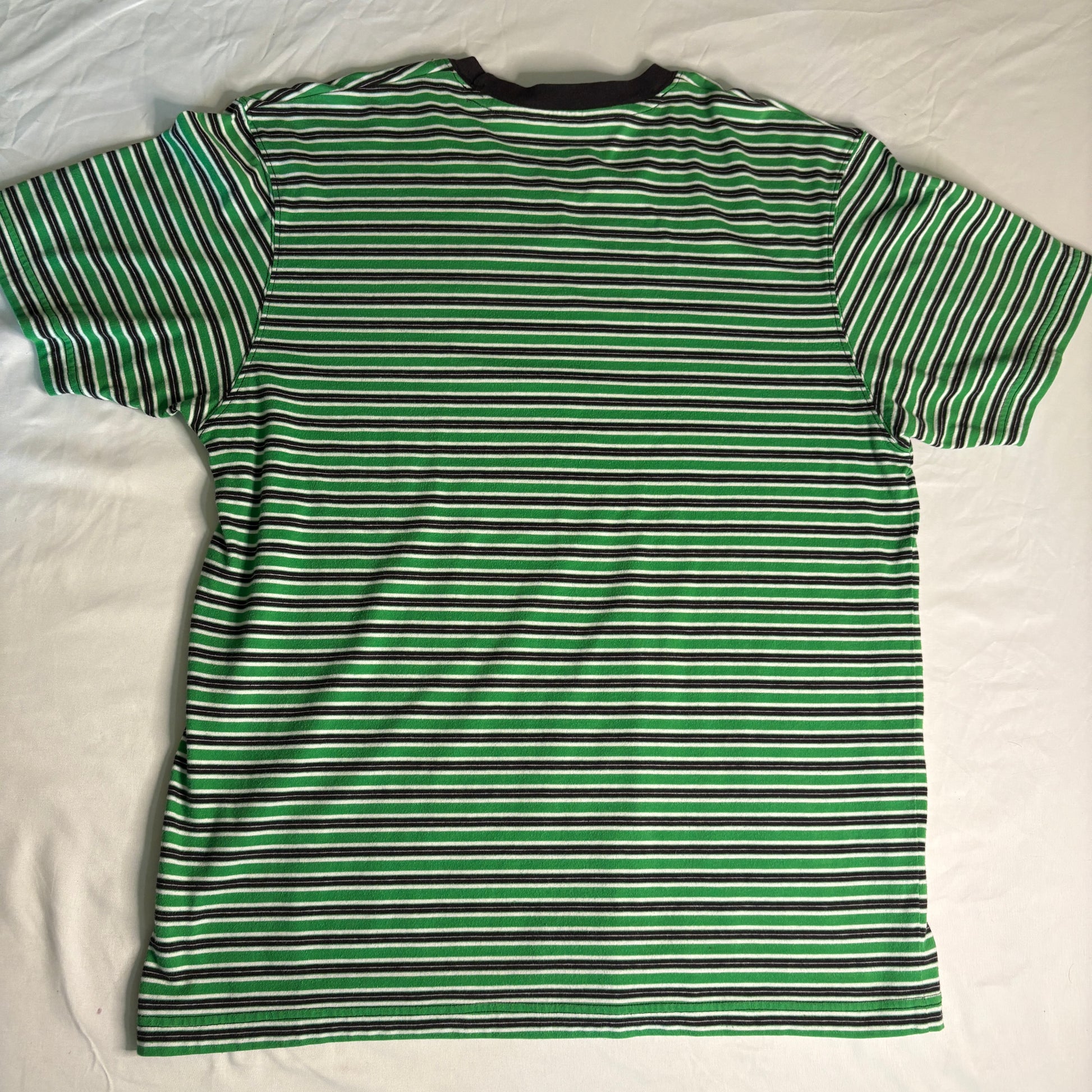 Vintage Paul Frank men’s striped t-shirt in green, black, and white with a bold skull patch logo on the lower front. Features a ribbed black crew neckline, soft cotton-poly blend fabric, and classic Y2K streetwear style.