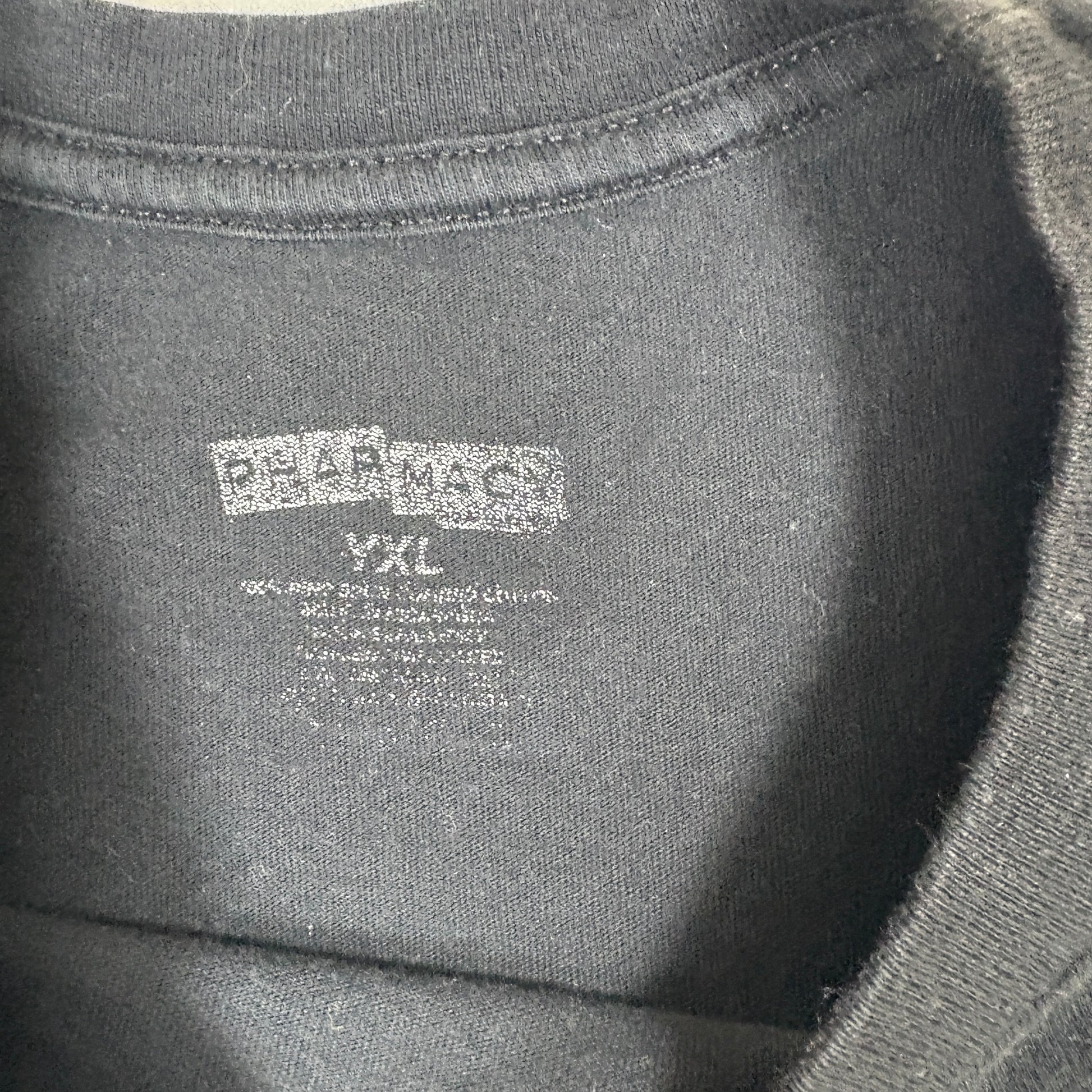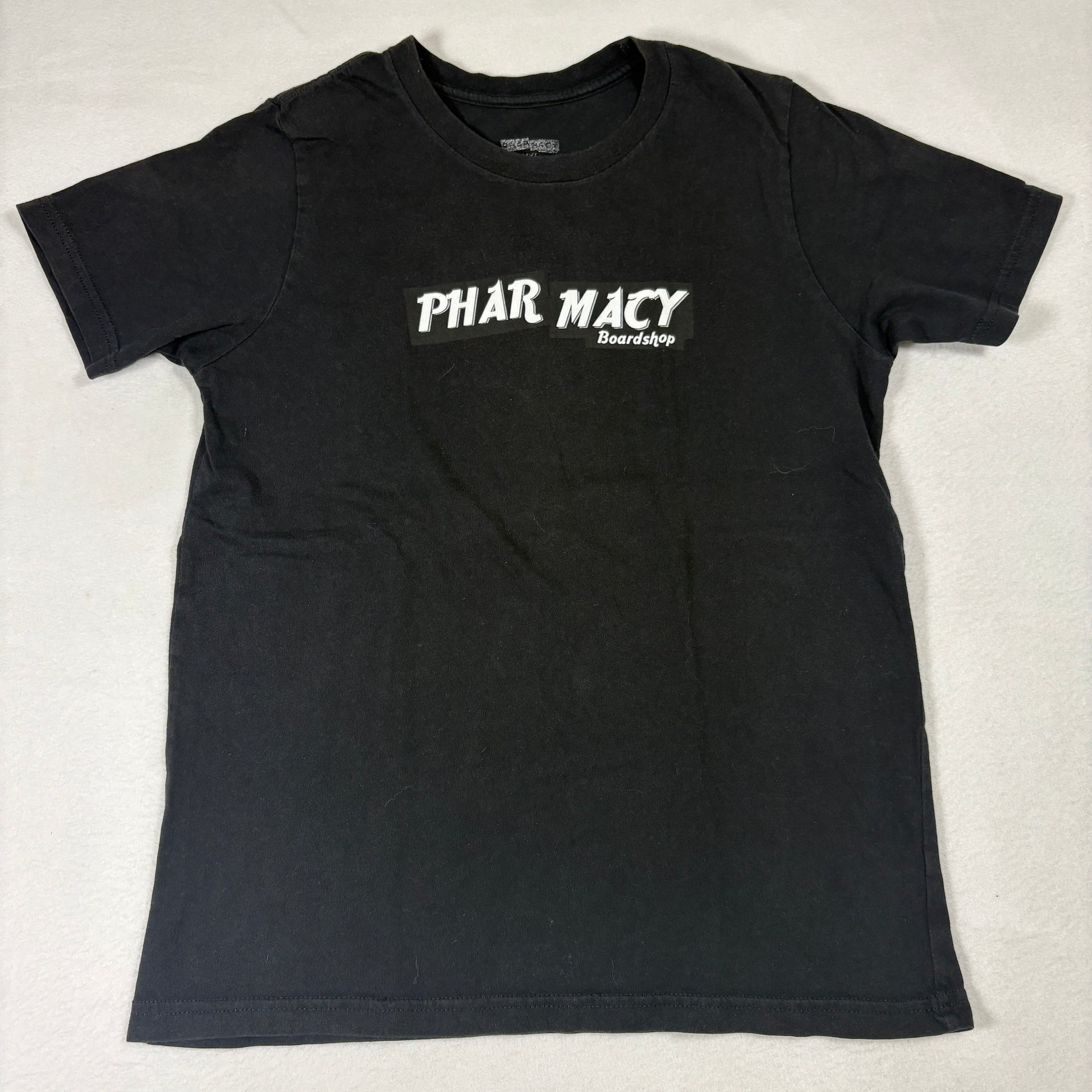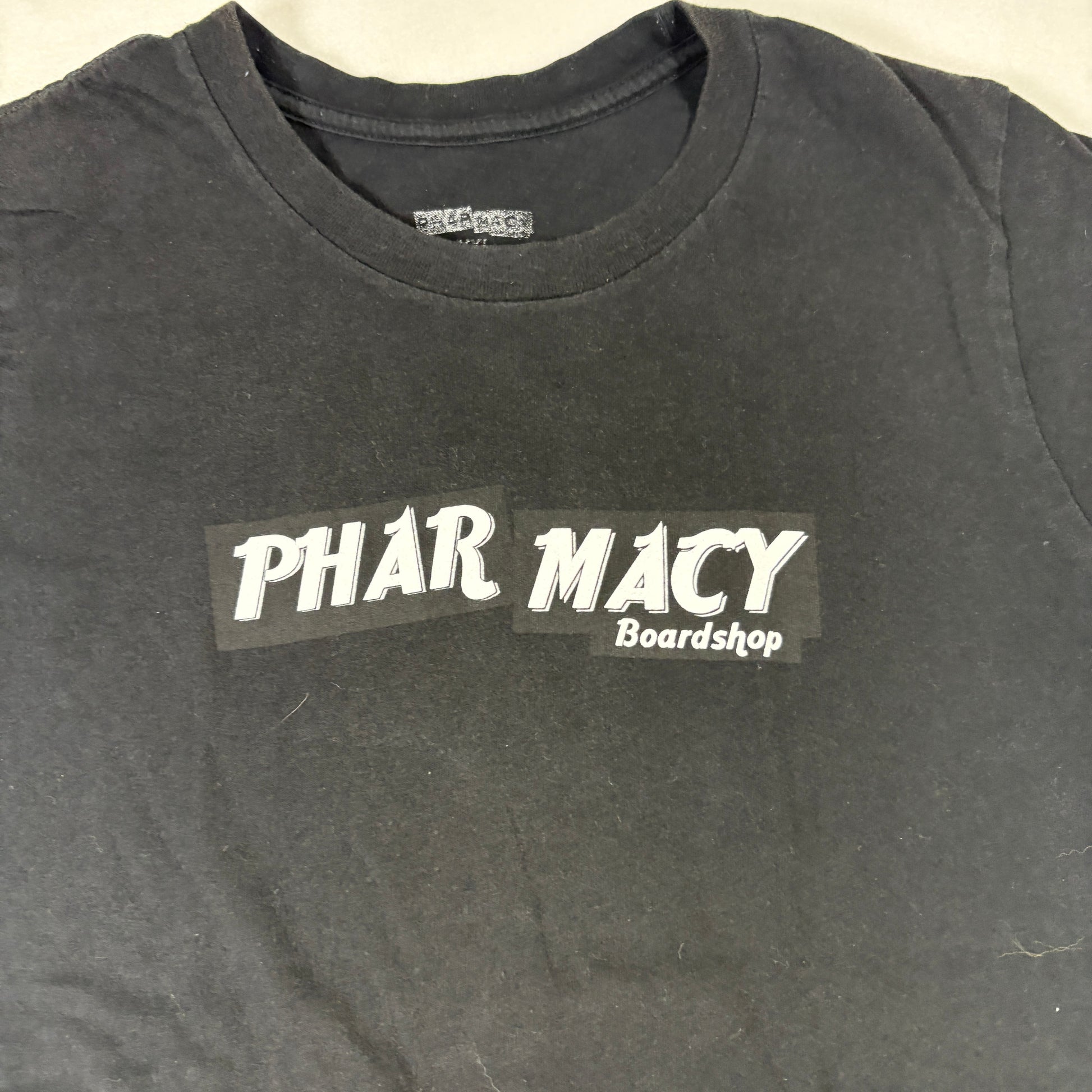 keywords: pharmacy boardshop, skate tee, youth xxl, black graphic shirt, y2k streetwear, grunge skate, vintage style