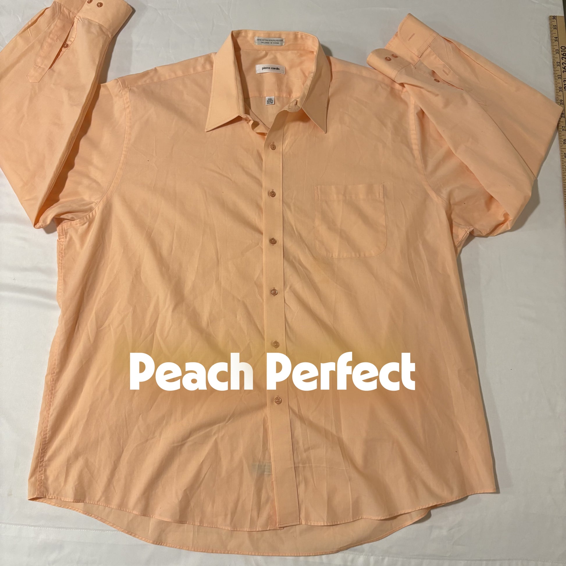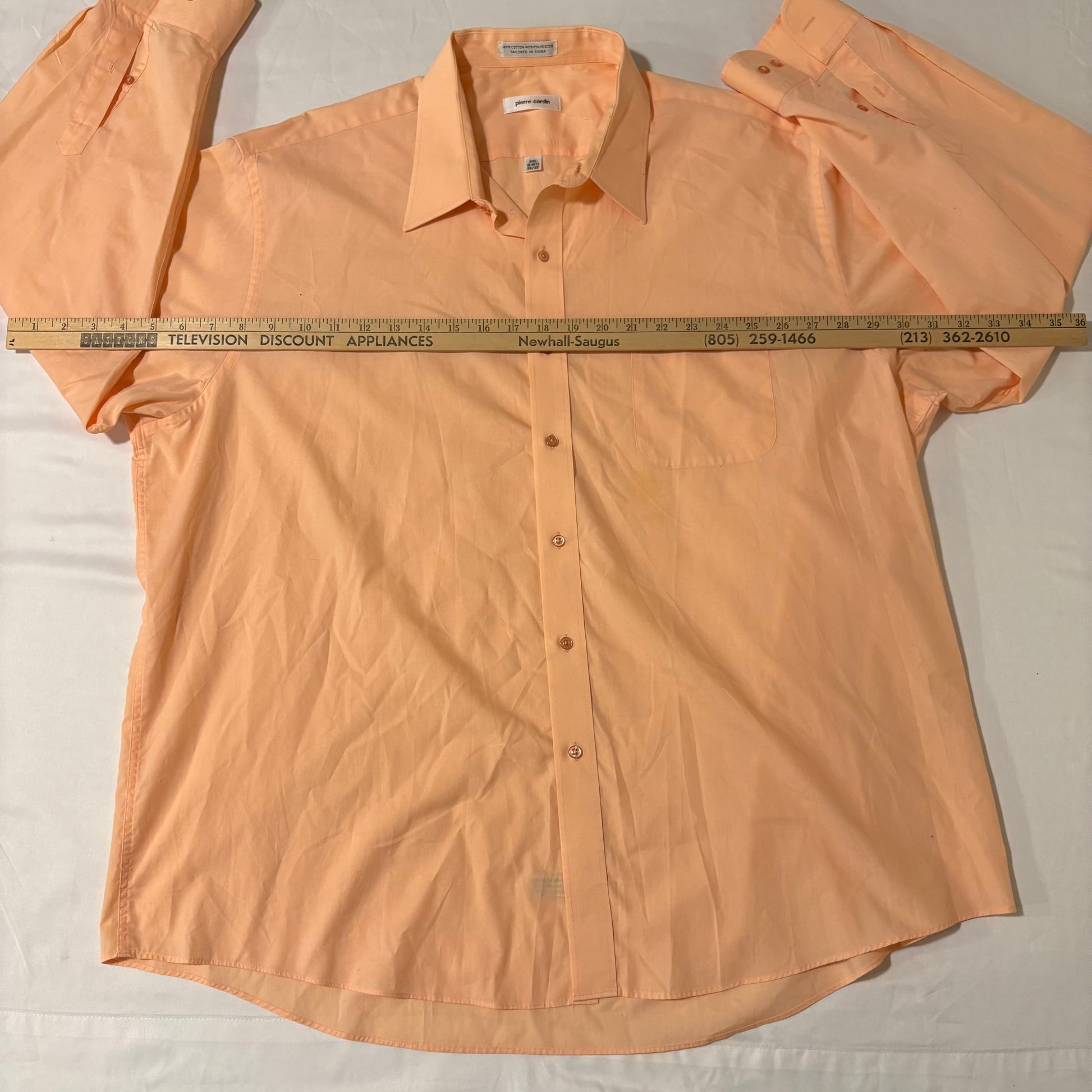 Look sharp in this Pierre Cardin men's XXL dress shirt in a refreshing peach tone. With a classic fit, point collar, chest pocket, and a cotton-polyester blend for wrinkle resistance and all-day comfort, it's ideal for work, events, or date nights. Tag reads 18-18.5 neck and 34/35 sleeve. A versatile pop of color for any wardrobe.