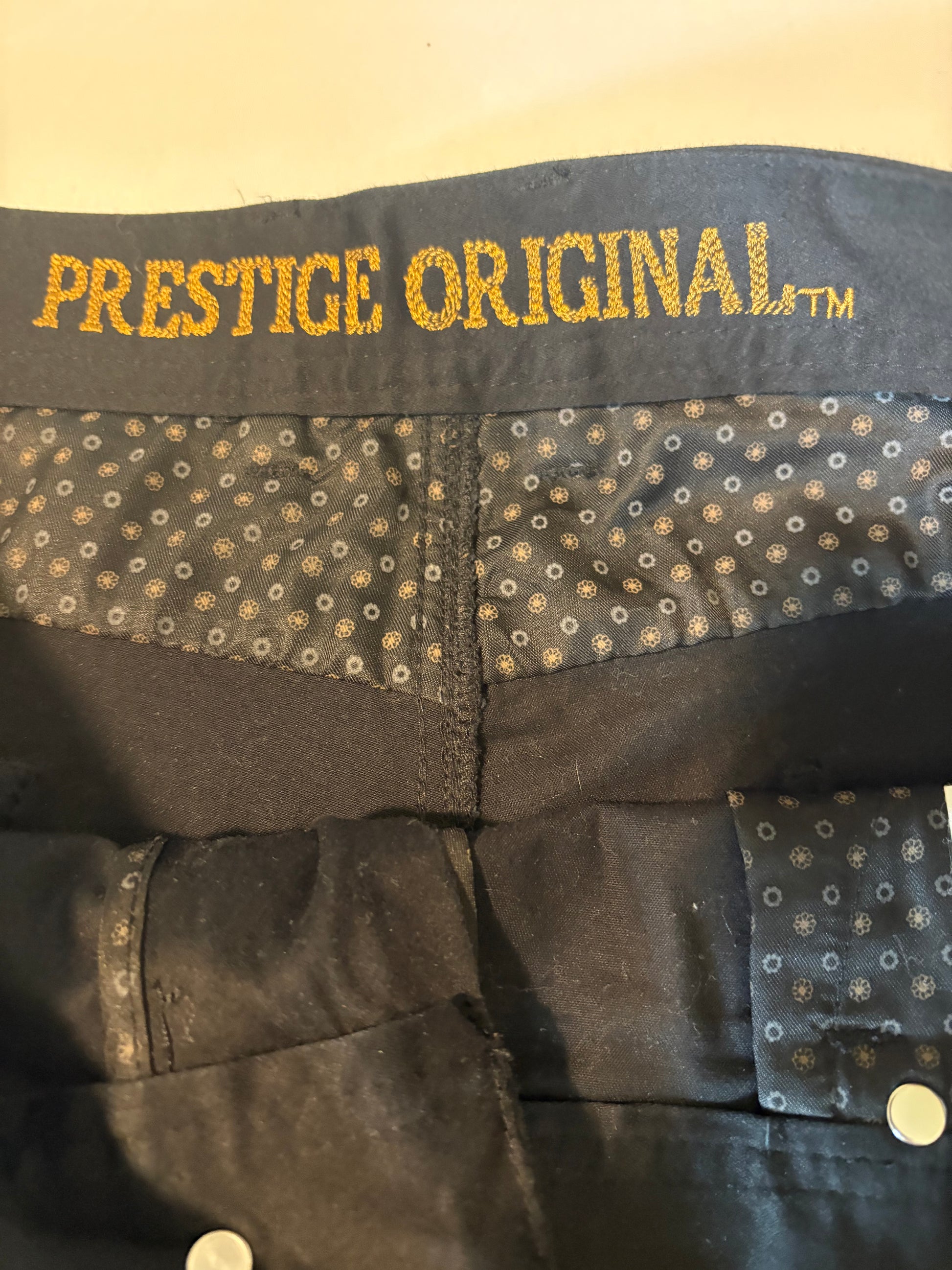 Upgrade your everyday style with these PRESTIGE Original men’s black pants in size 40. Made with a soft cotton-spandex blend, these pants offer a modern slim fit that moves with you for ultimate comfort. Classic five-pocket design, clean silhouette, and gold button/waistband detailing make these a standout piece for casual or dressy looks. Whether you're heading to the office, a night out, or just running errands, these pants deliver style and flexibility.