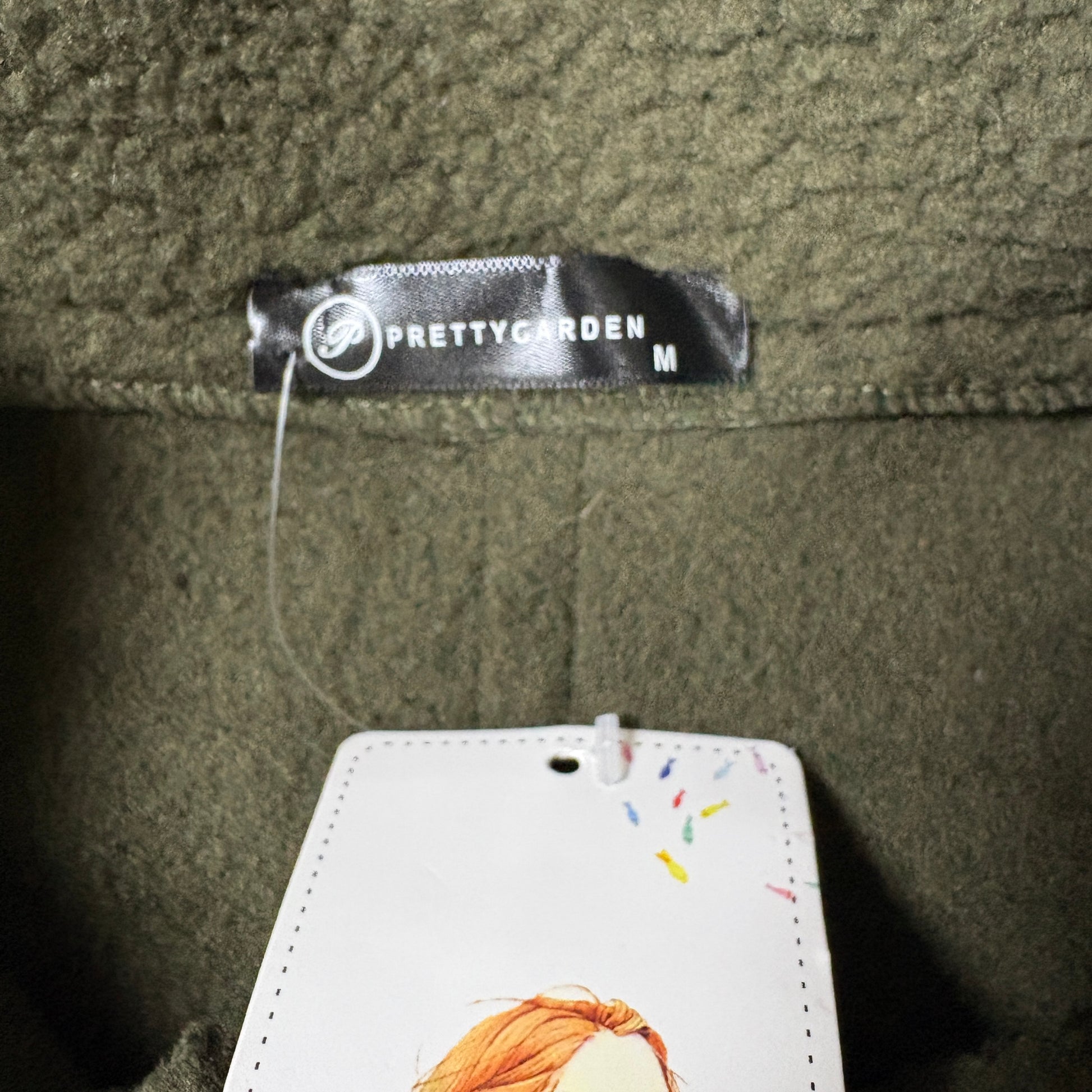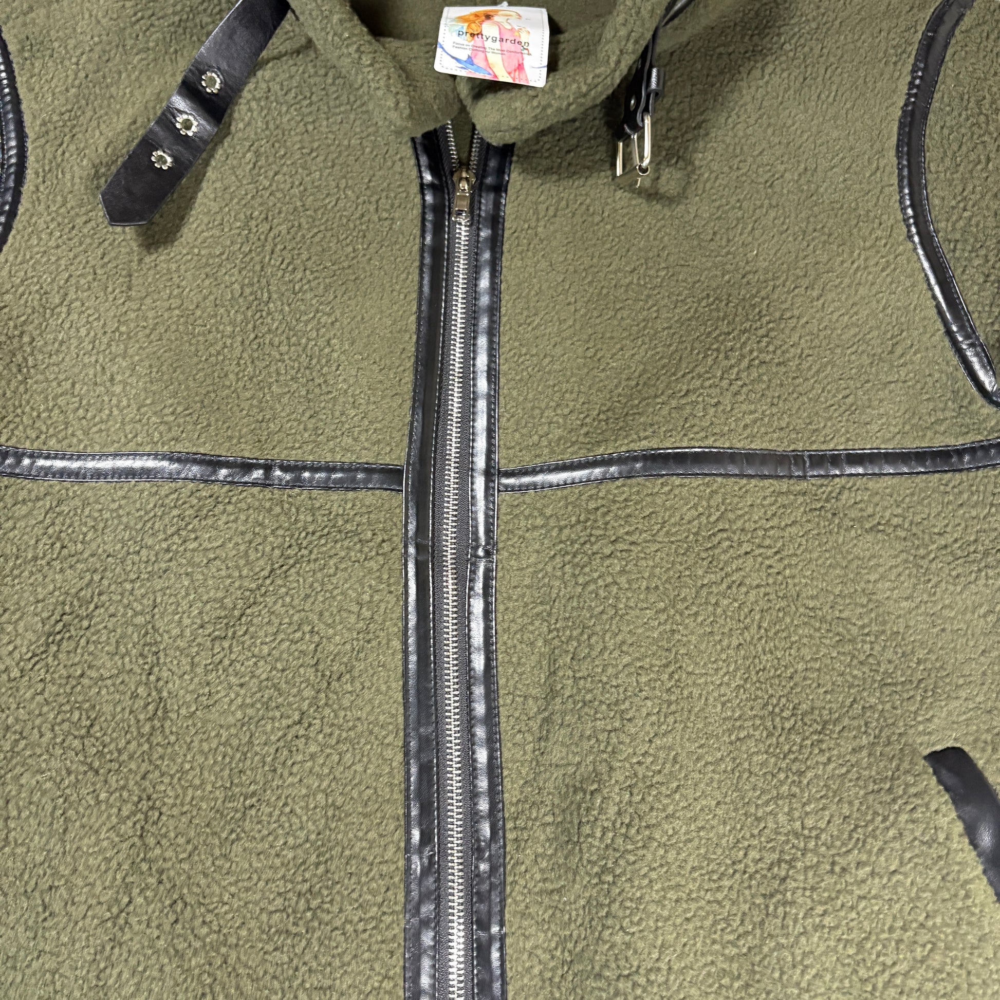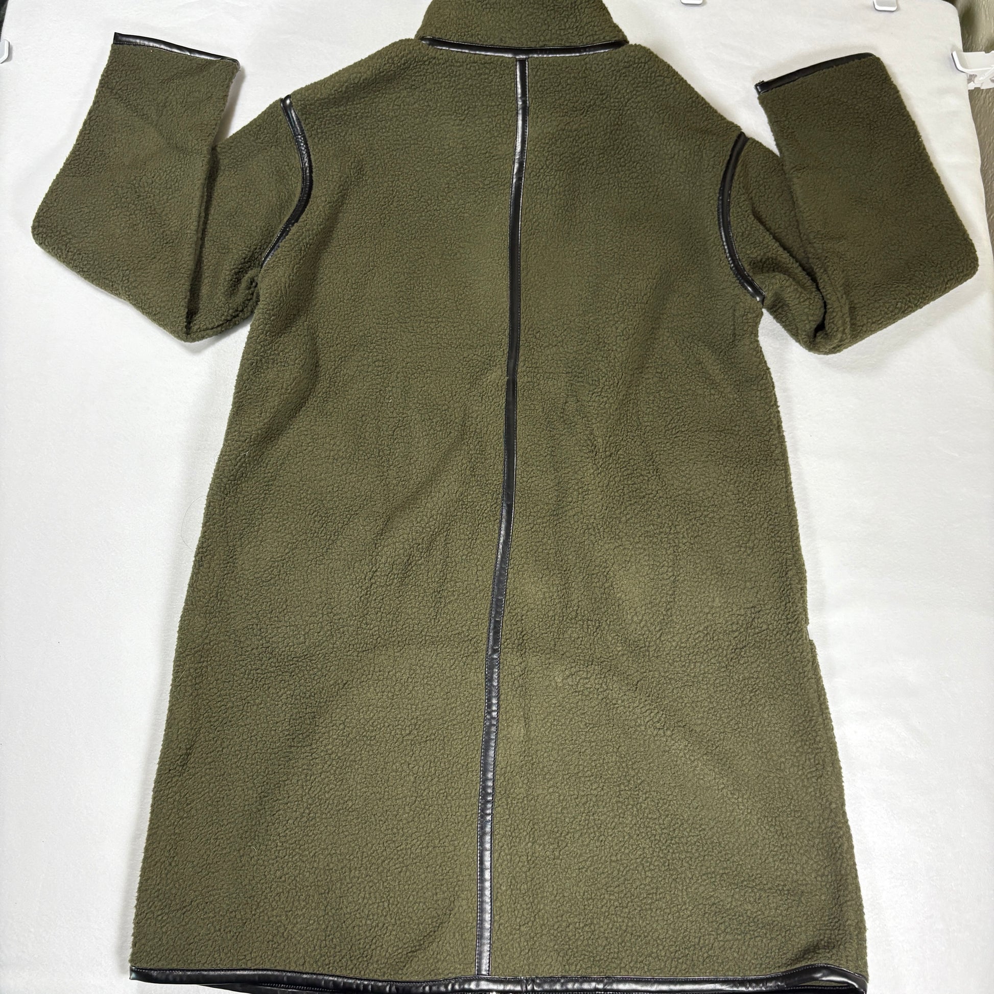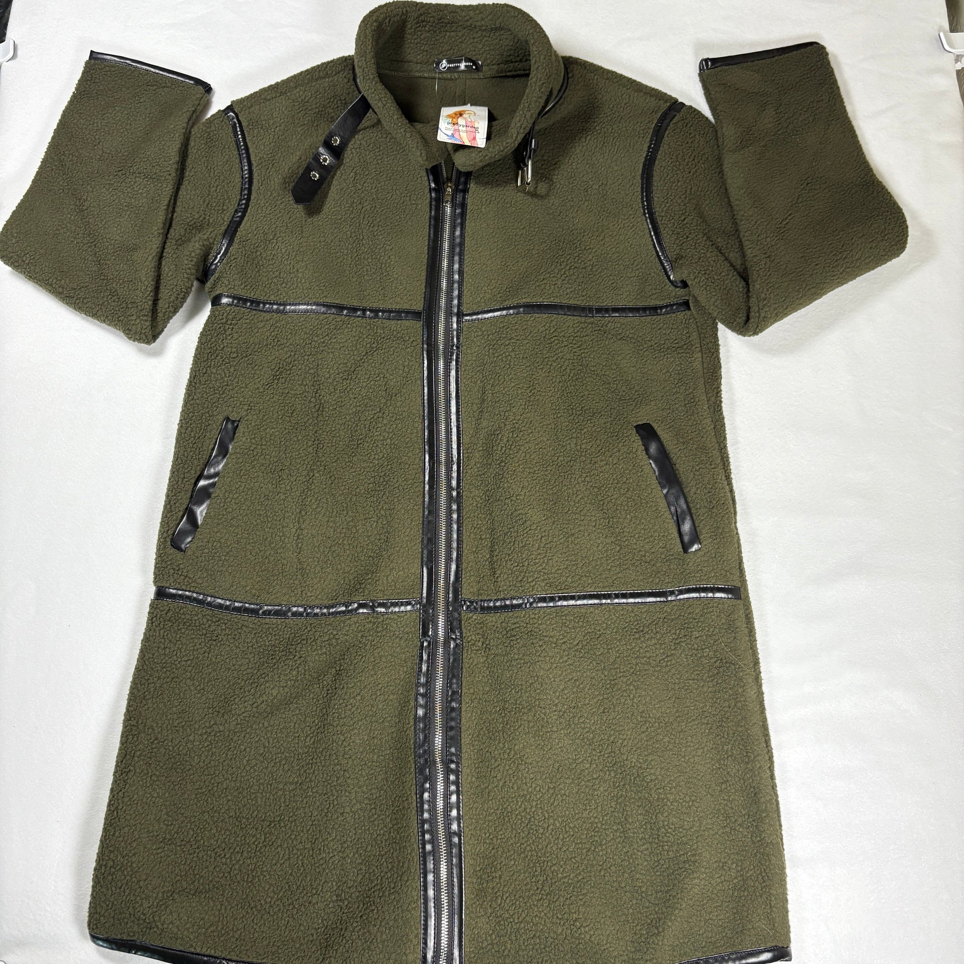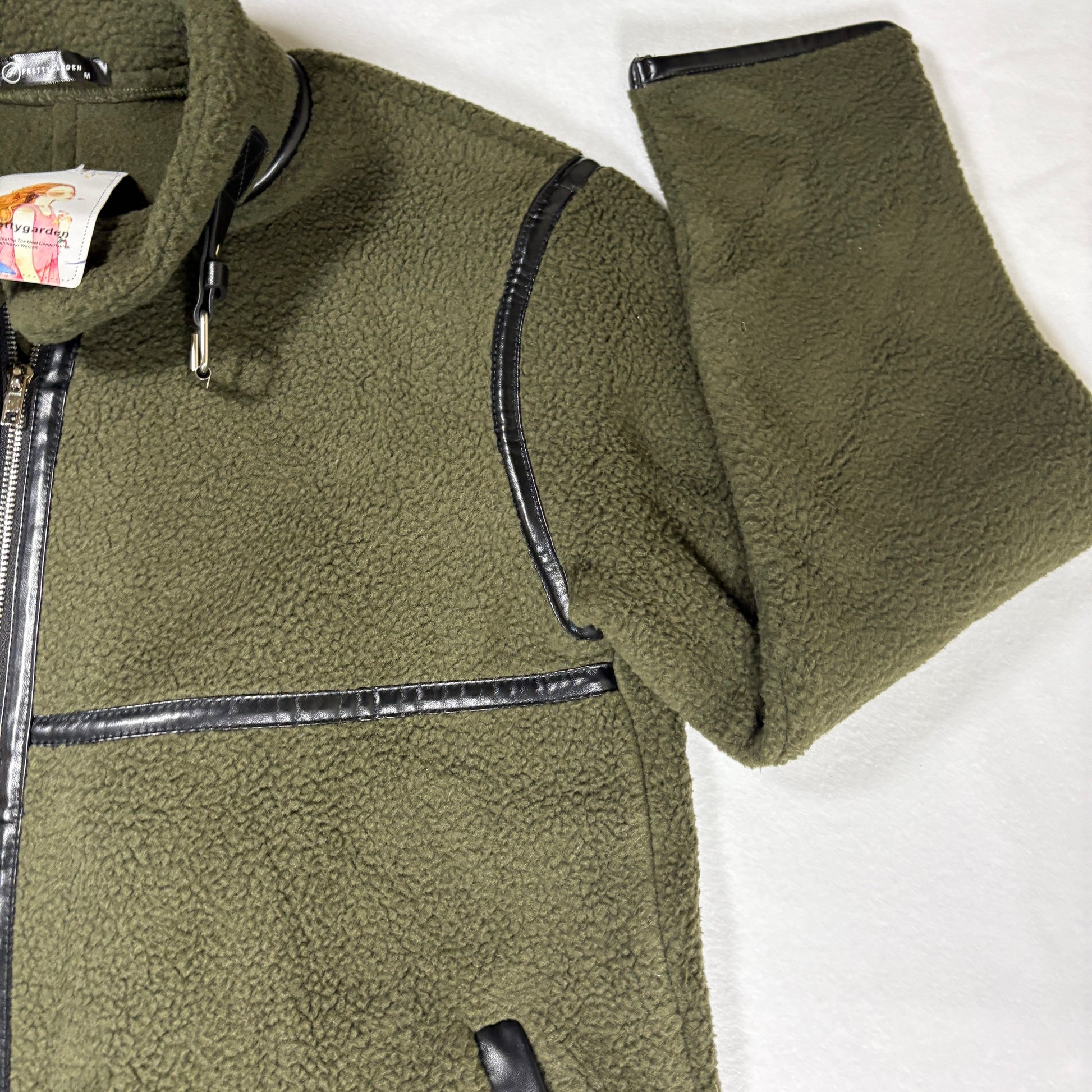 Prettygarden, fleece jacket, longline coat, olive green, faux leather trim, sherpa, zip up, women’s medium, winter coat