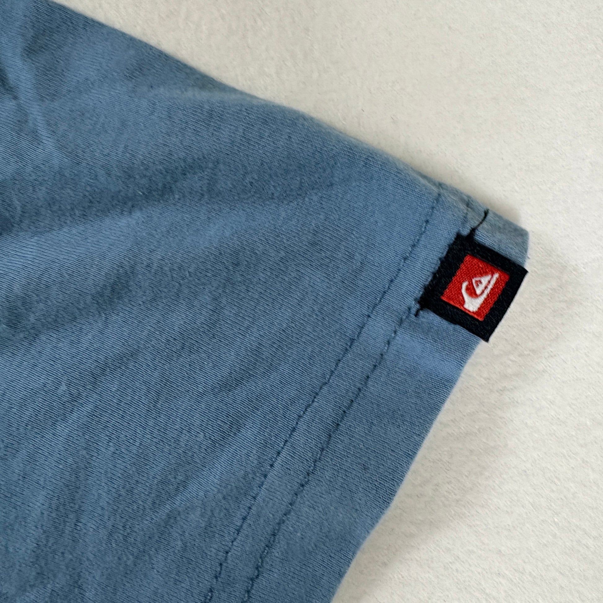 Fresh Quiksilver surf tee in a versatile blue shade, featuring a small chest logo and bold back graphic. Perfect for skate, surf, or casual streetwear style. With its classic cut and new-with-tags condition, this piece makes a great addition to any wardrobe or a perfect gift for a surfwear fan.